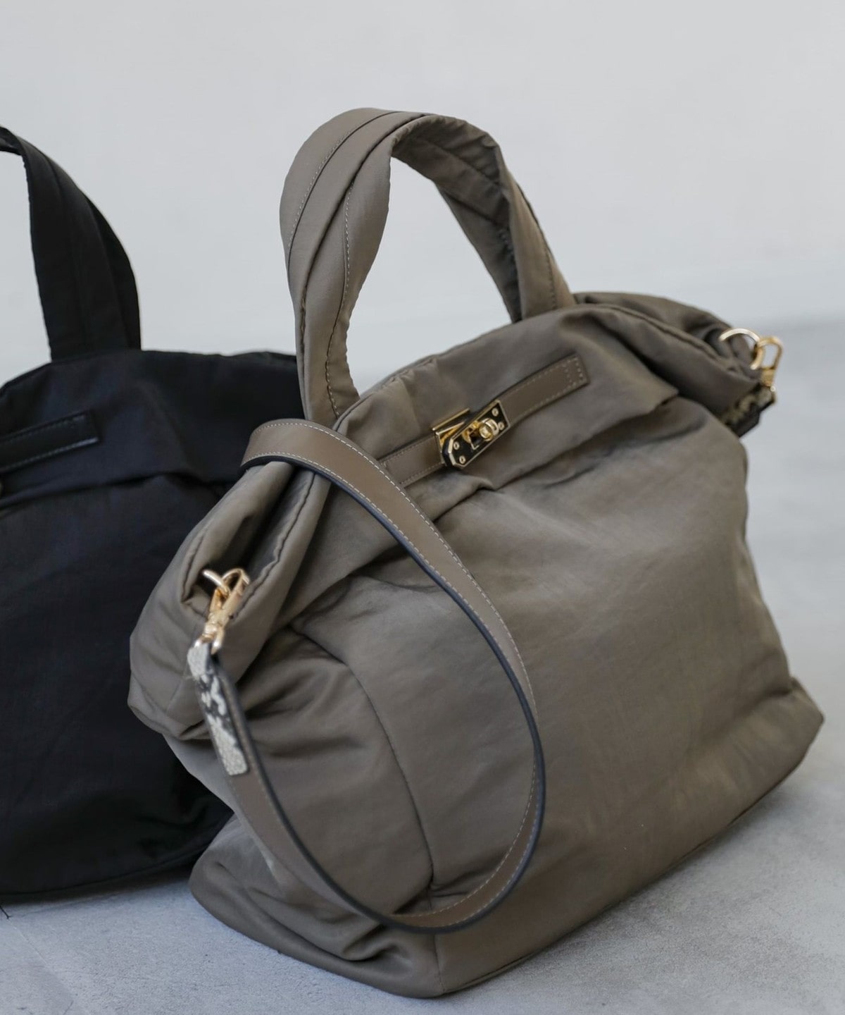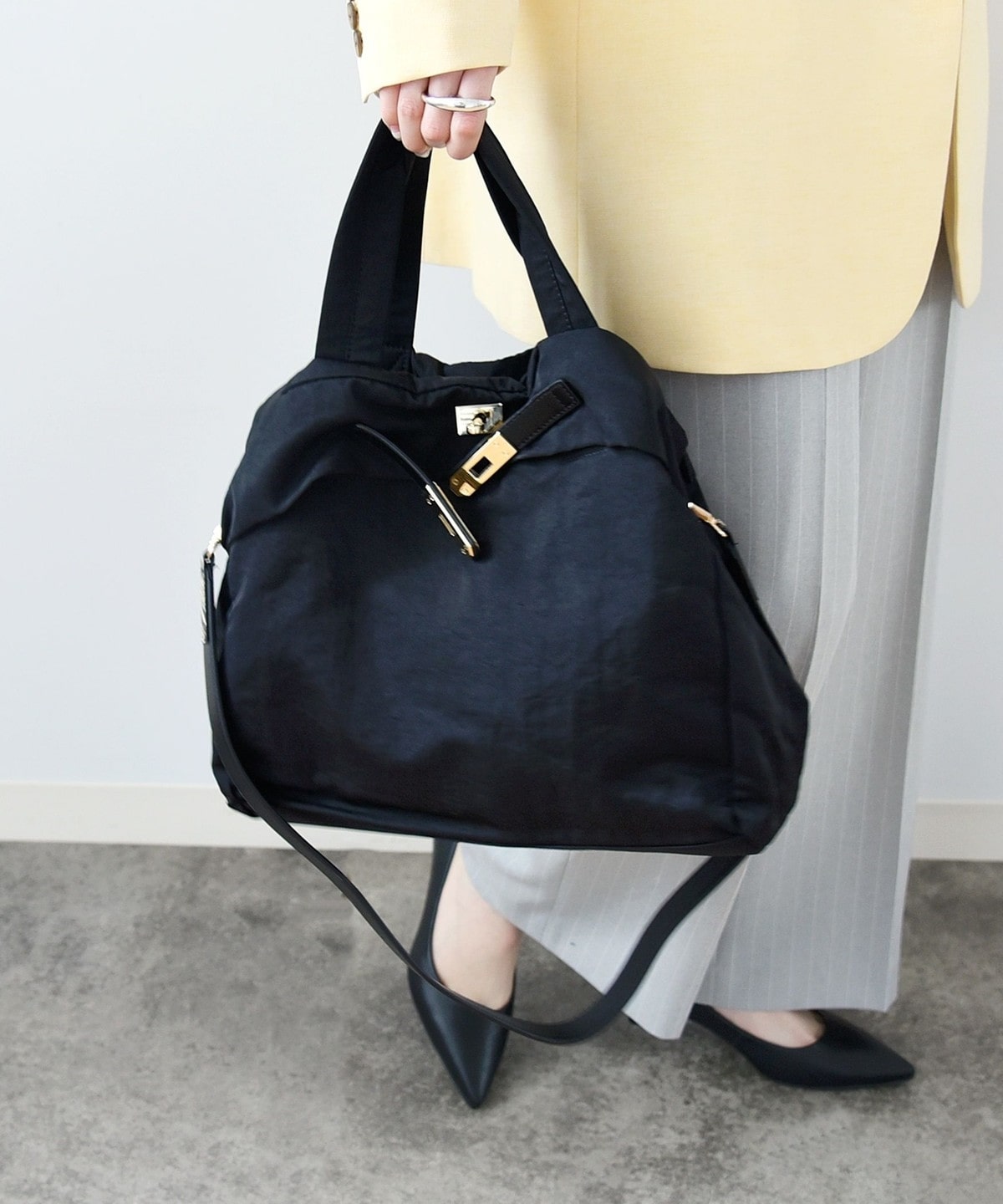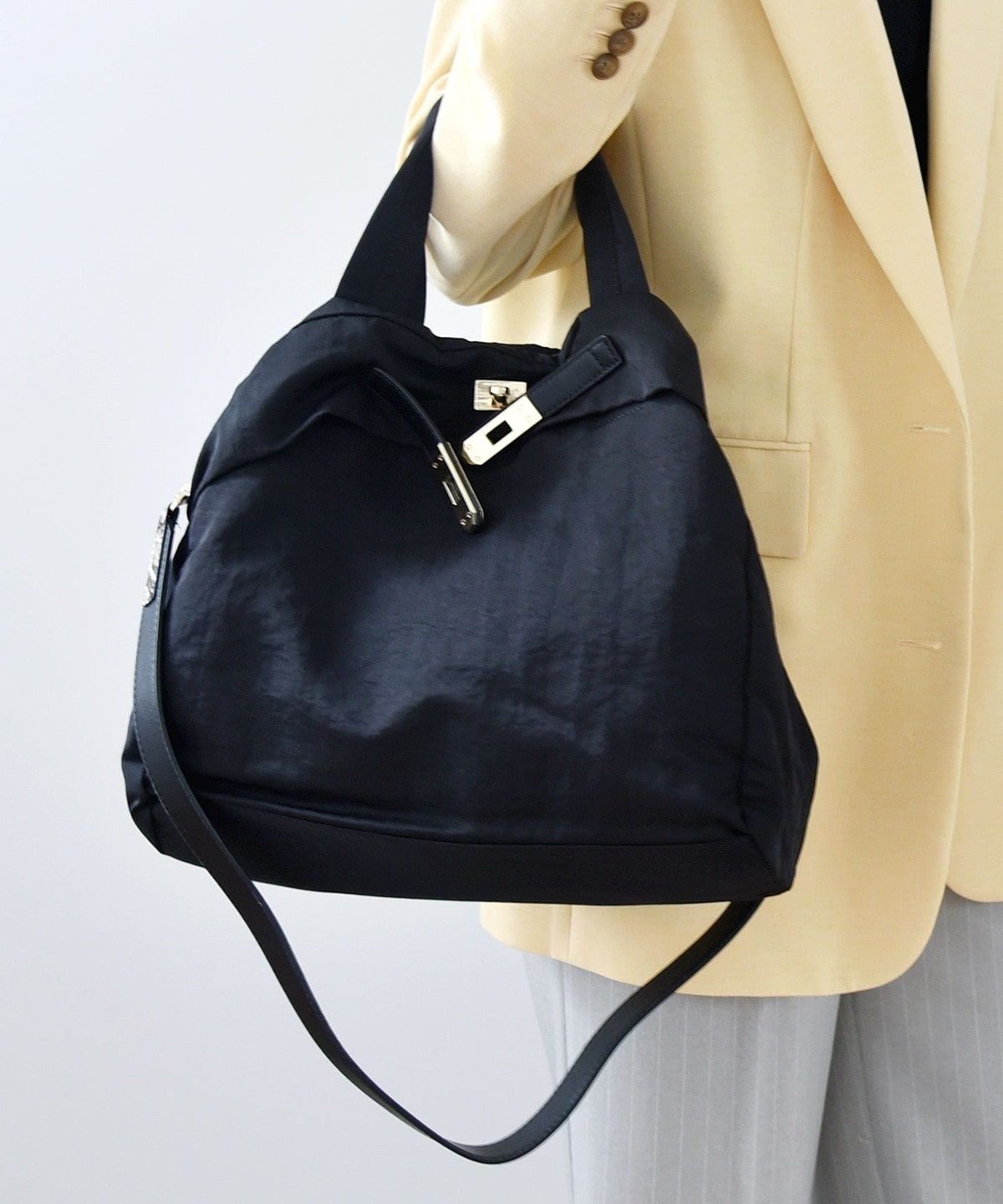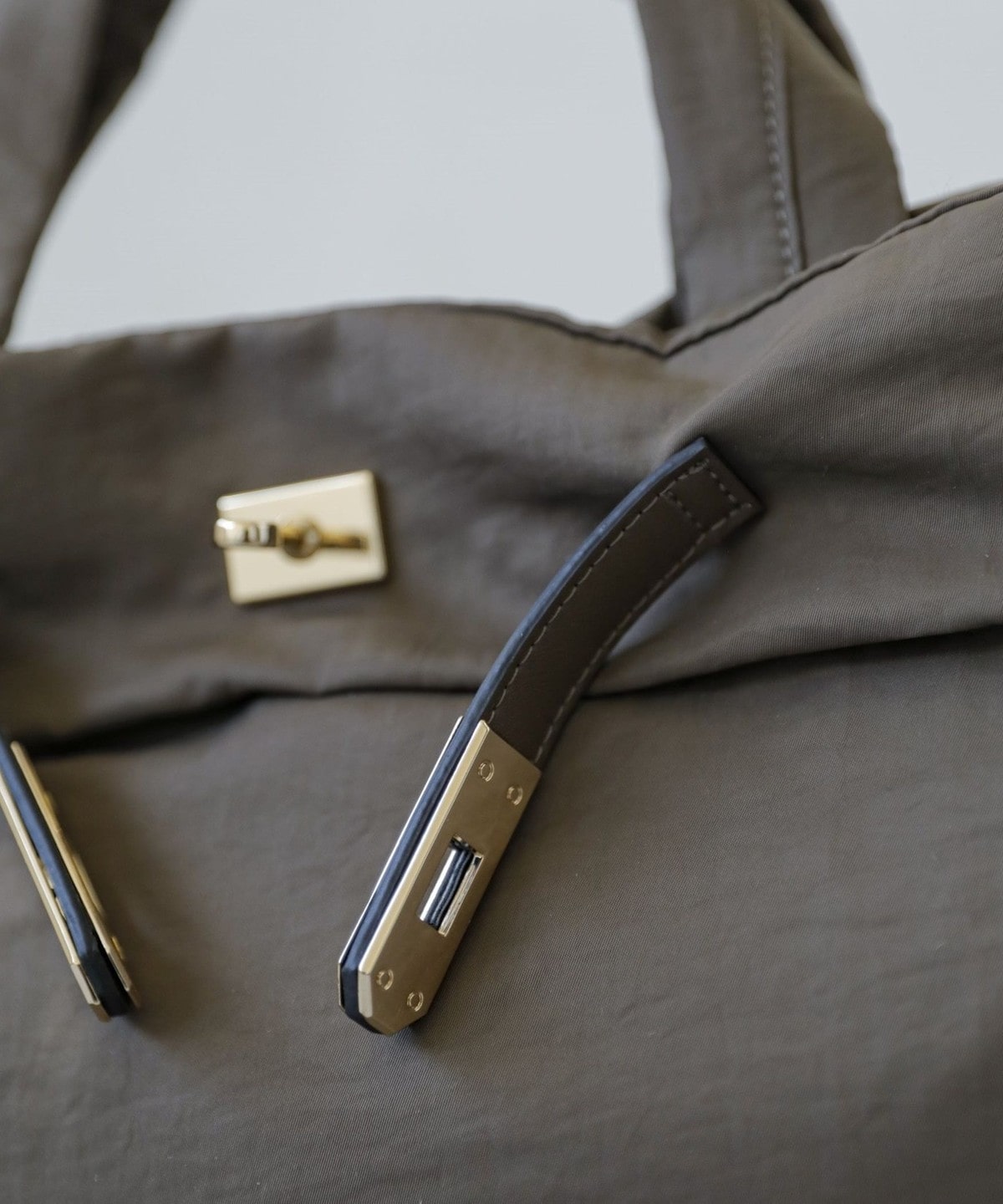フロントの金具デザインと、合皮との異素材MIXがポイントのバッグ。