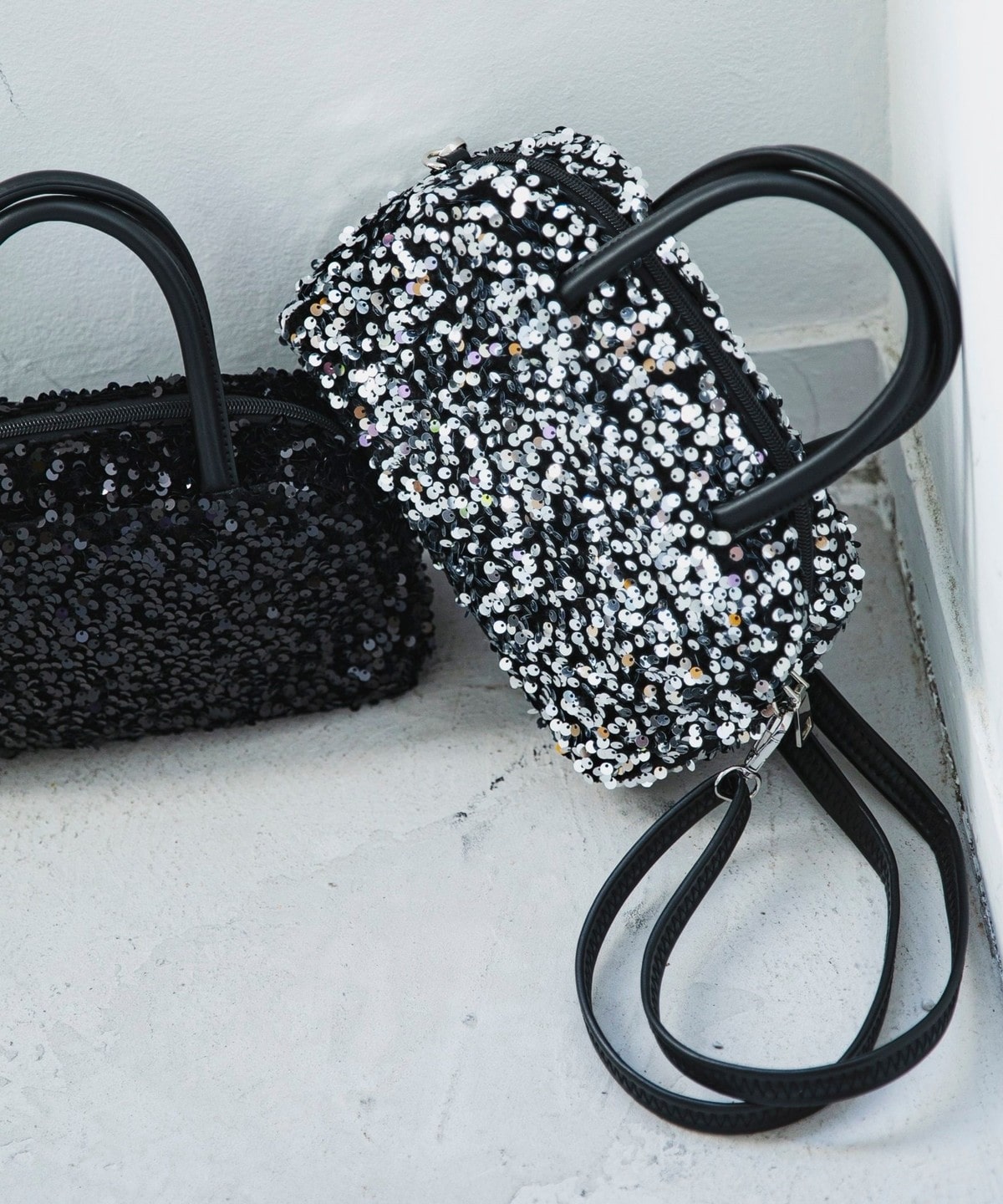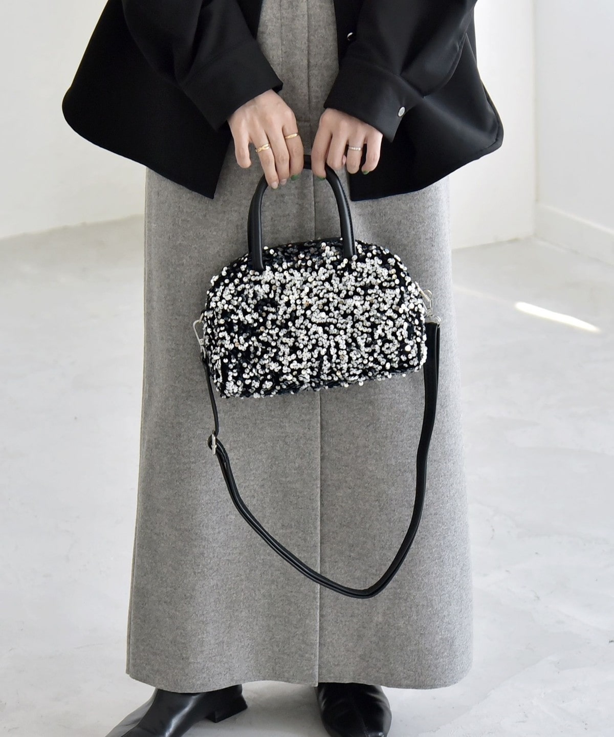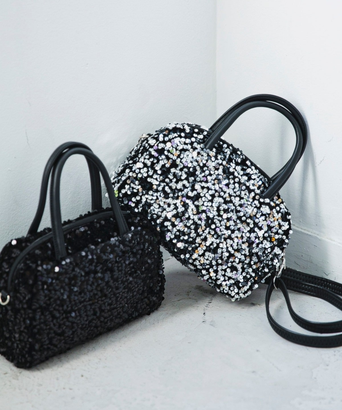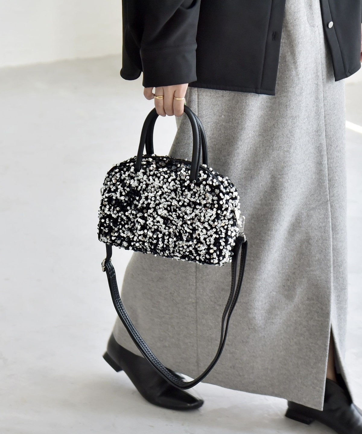 華やかさと上品さを兼ねそろえた、スパンコールのミニボストンバッグ。