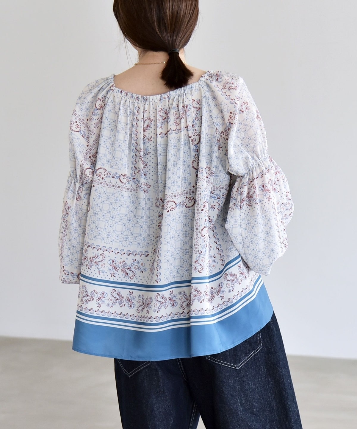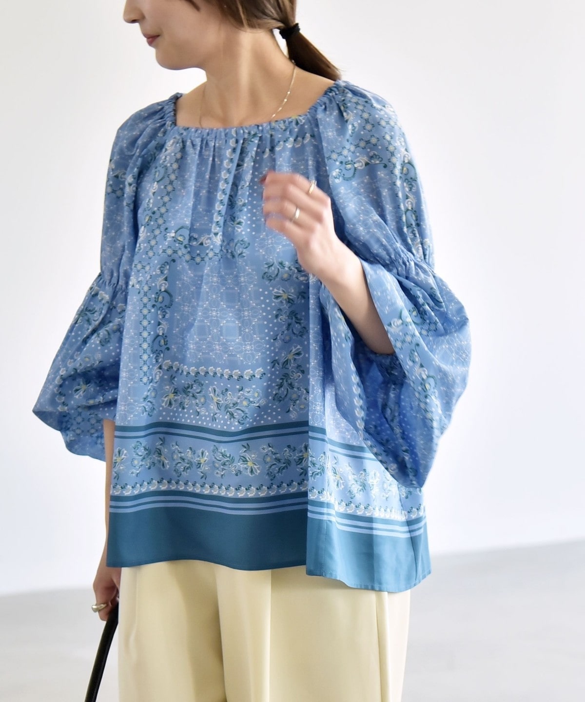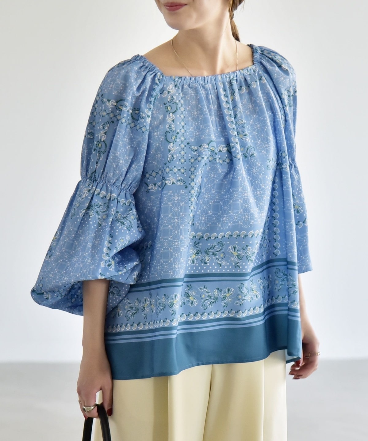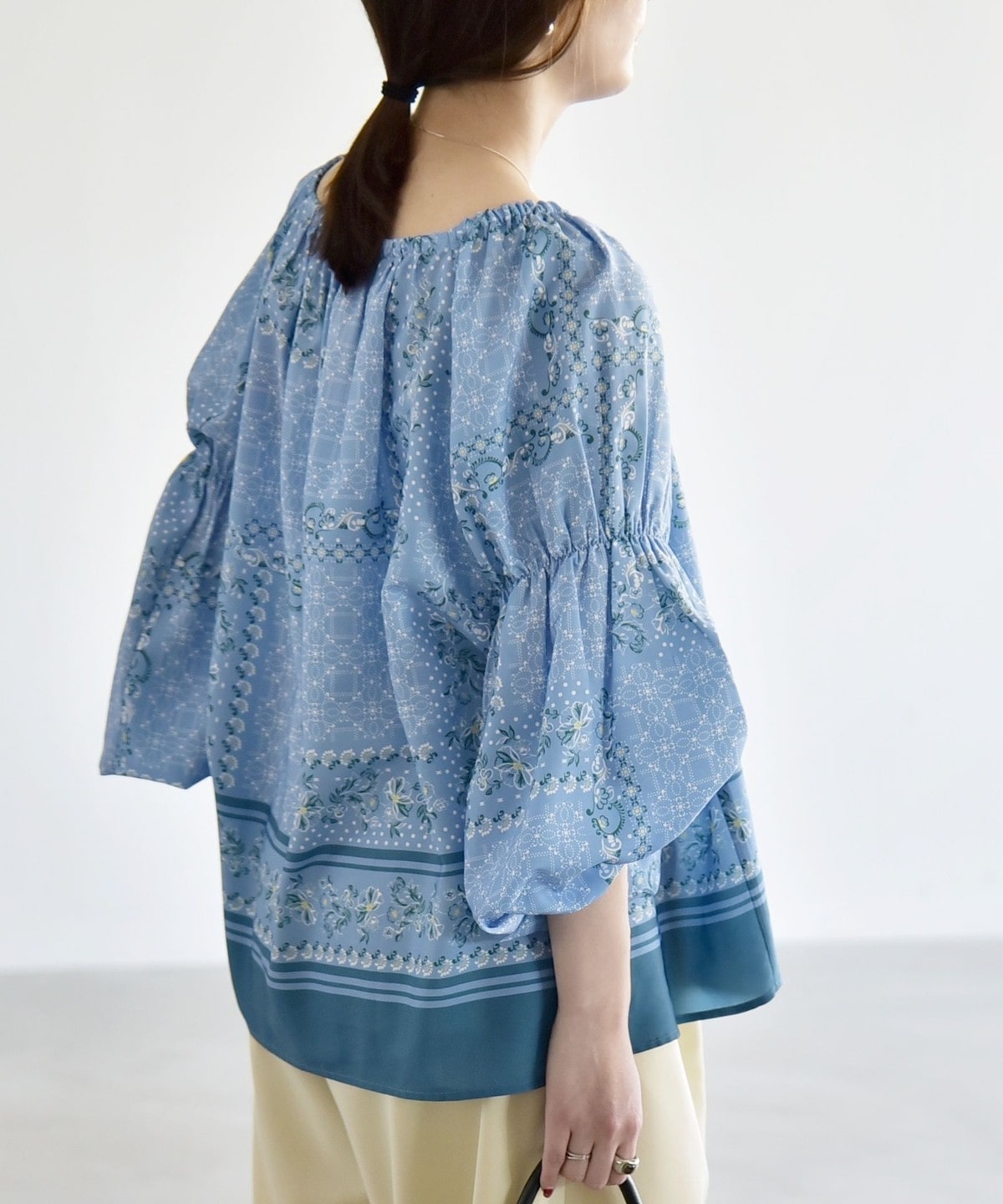 2. 《予約》quaranciel:〈洗濯機可能〉フラワー スカーフ プリント ギャザー パフ ブラウス ライトブルー