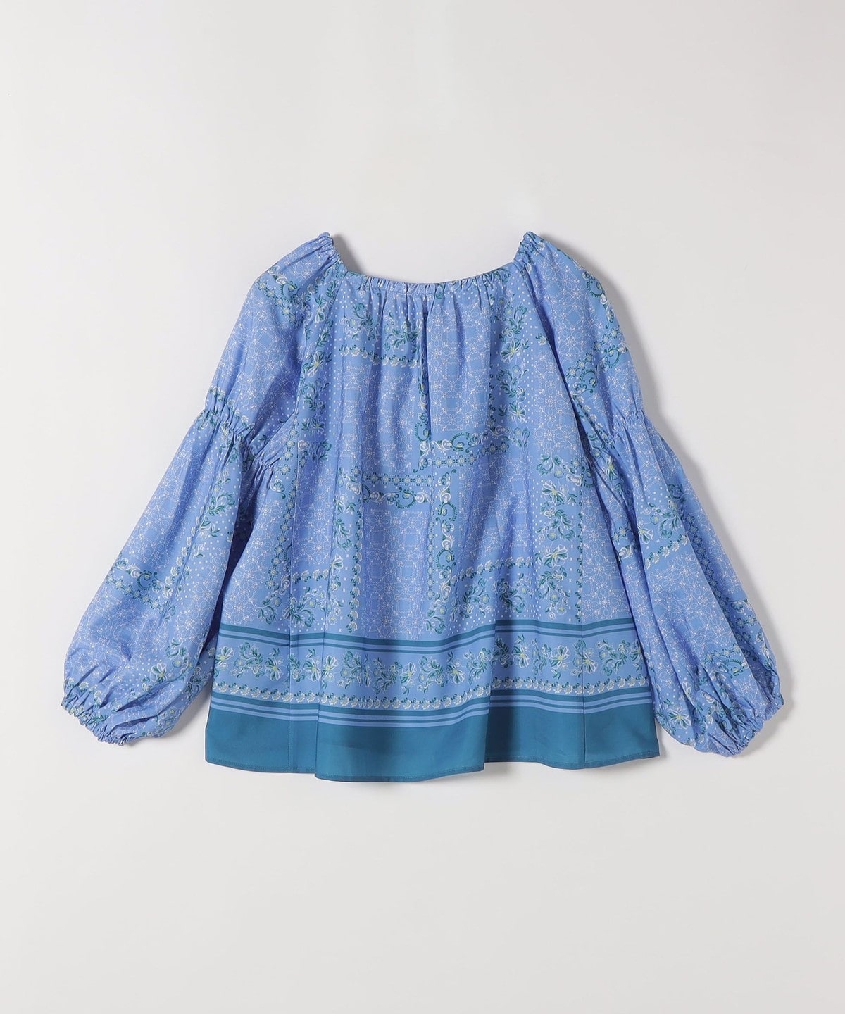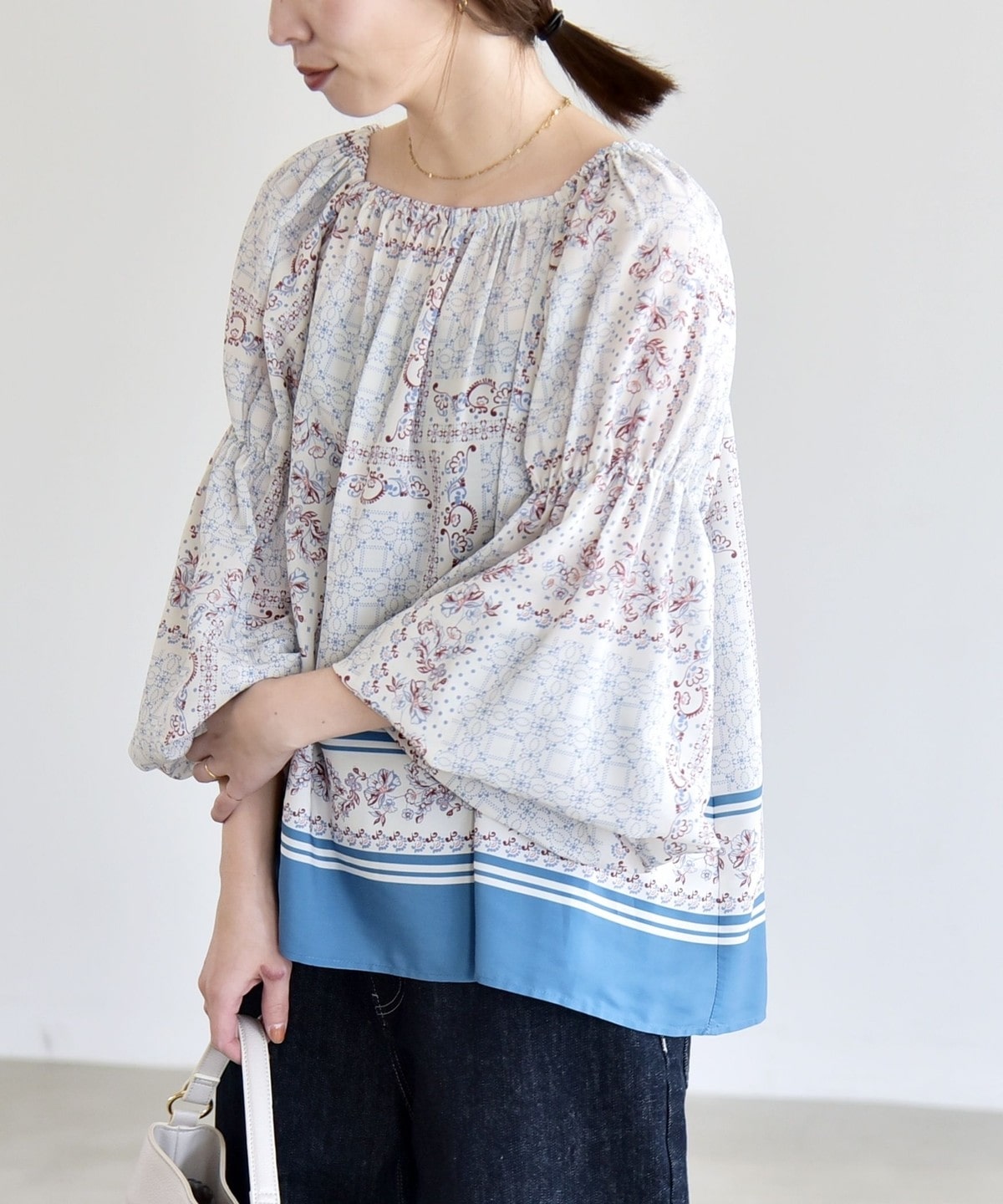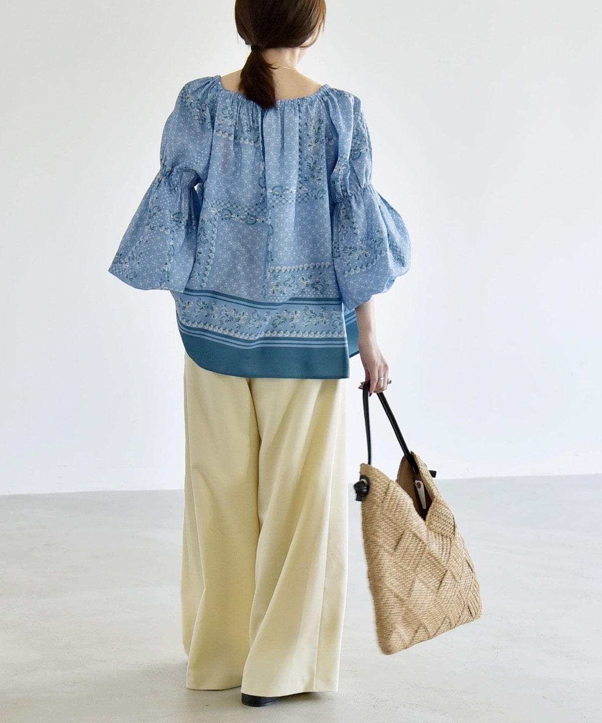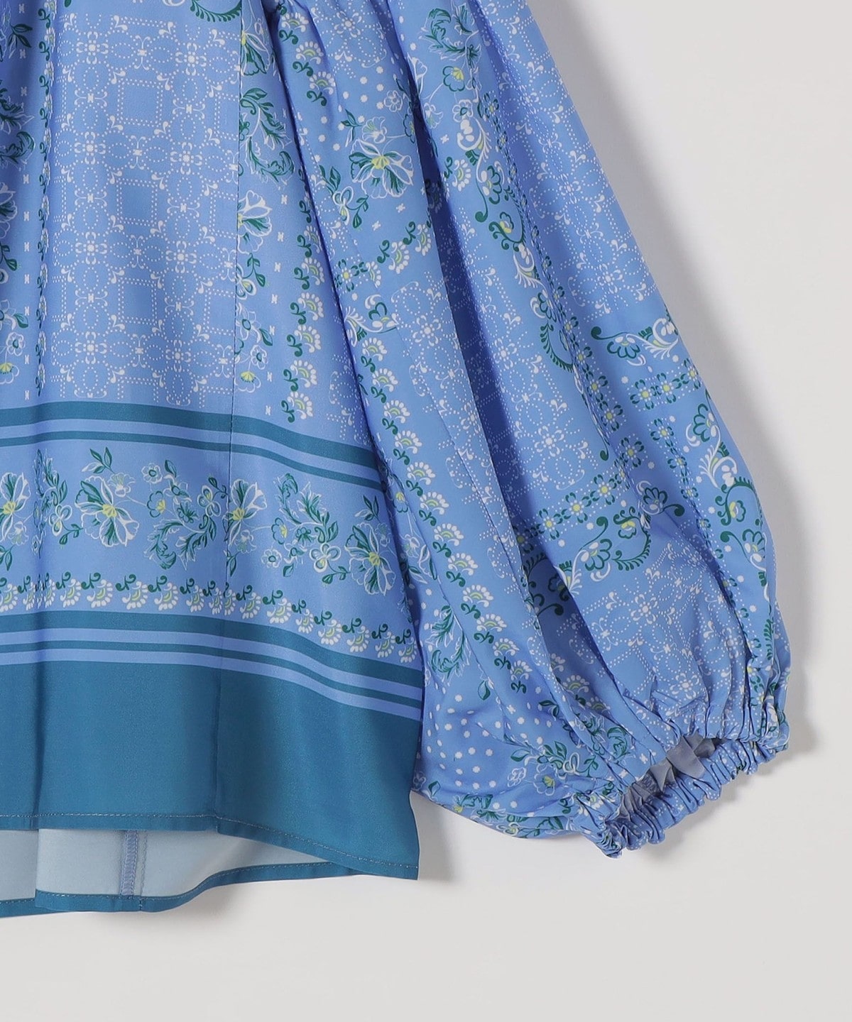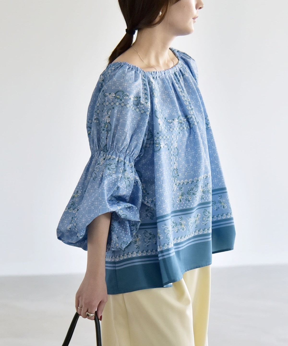 2. 《予約》quaranciel:〈洗濯機可能〉フラワー スカーフ プリント ギャザー パフ ブラウス ライトブルー