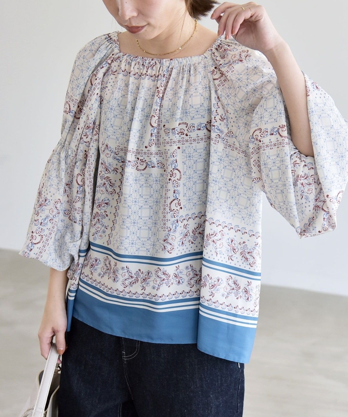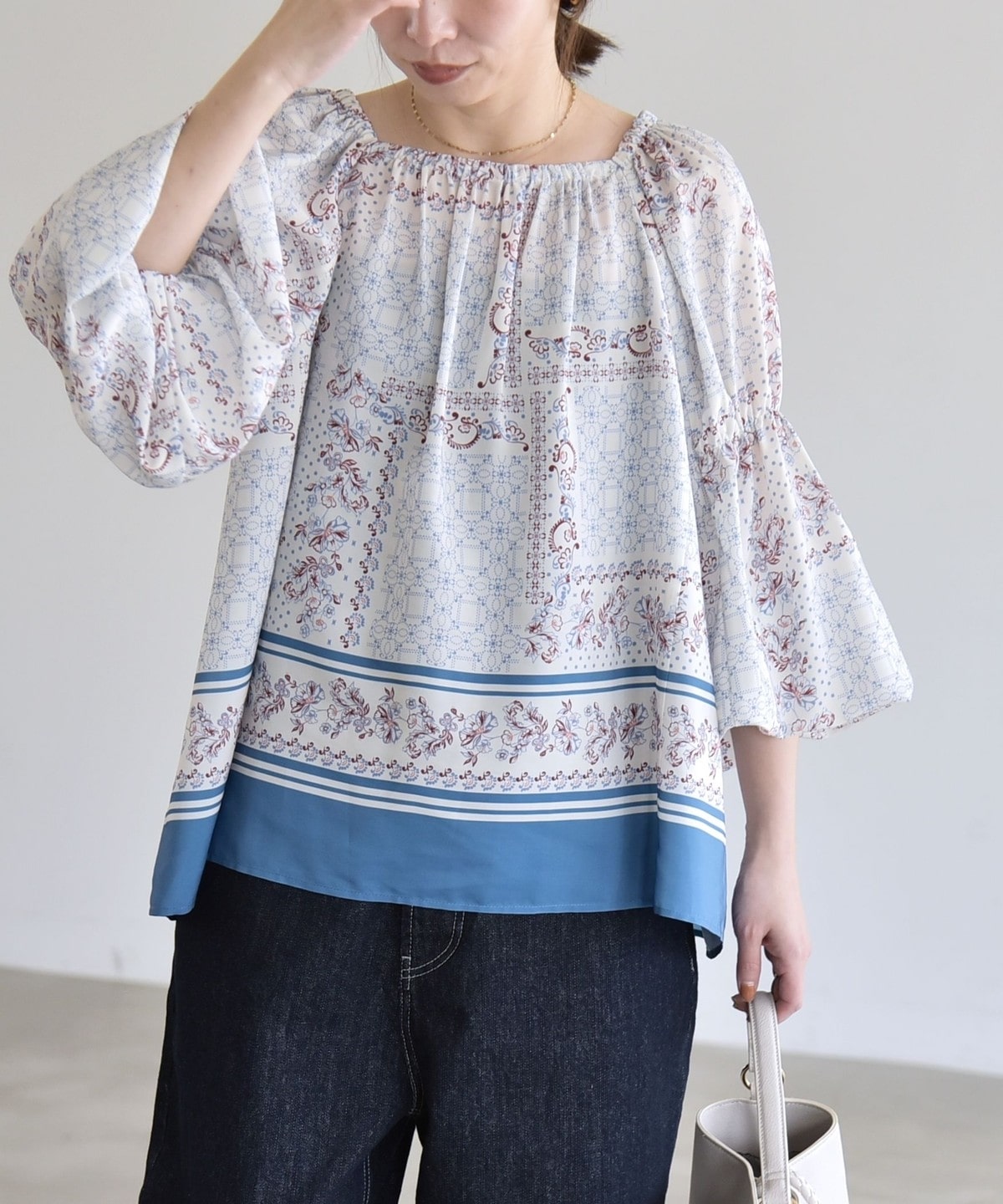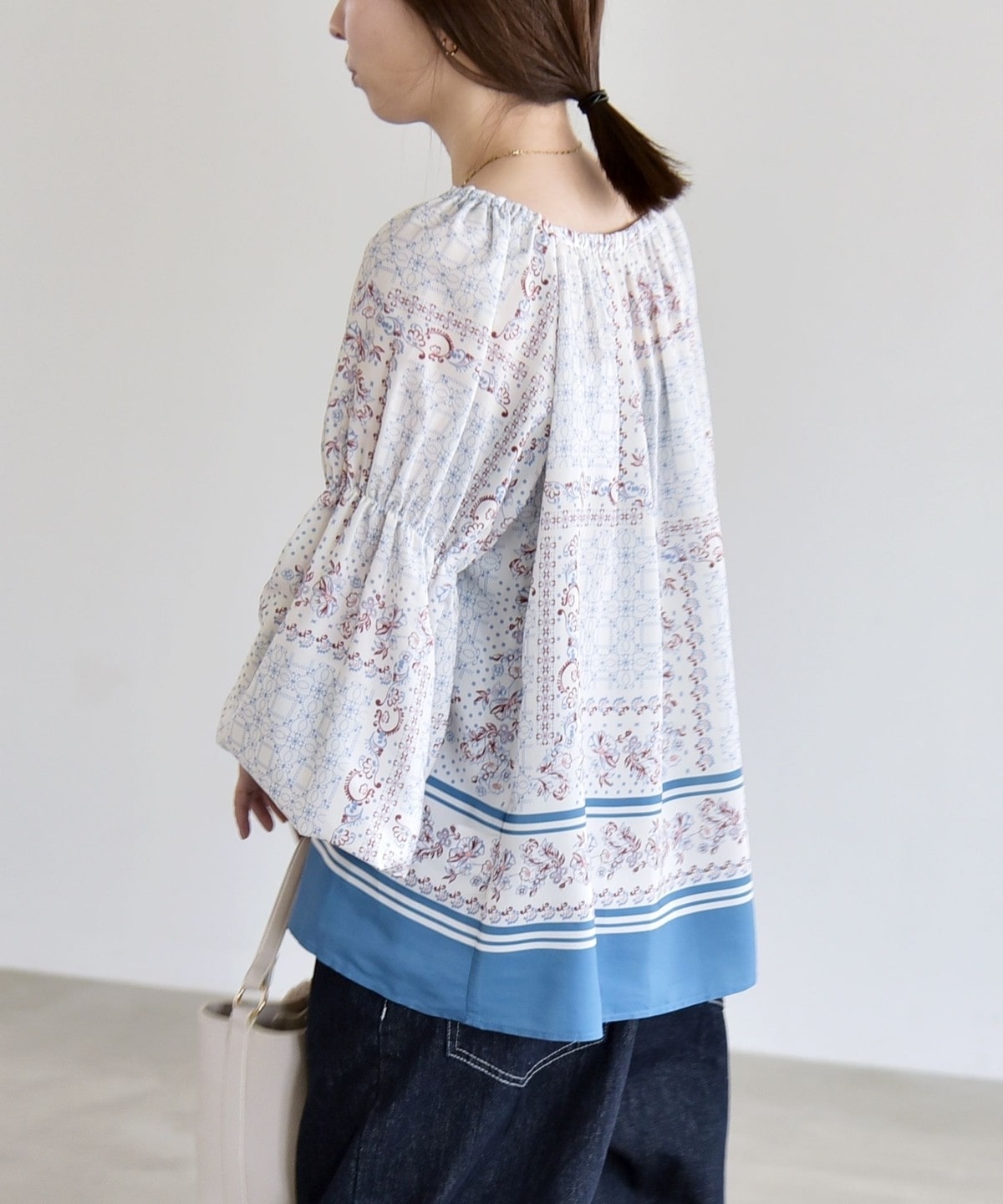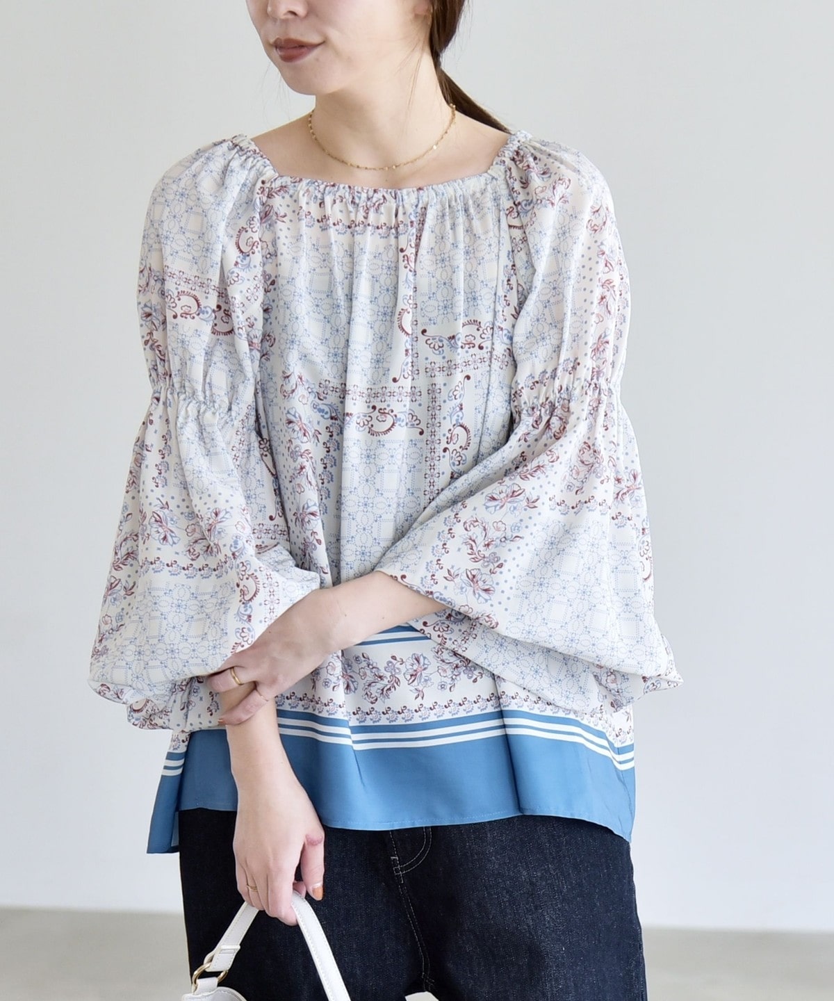 2. 《予約》quaranciel:〈洗濯機可能〉フラワー スカーフ プリント ギャザー パフ ブラウス ライトブルー