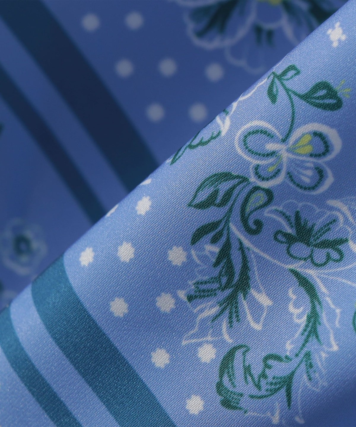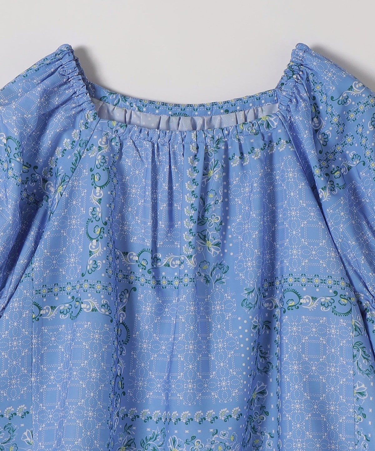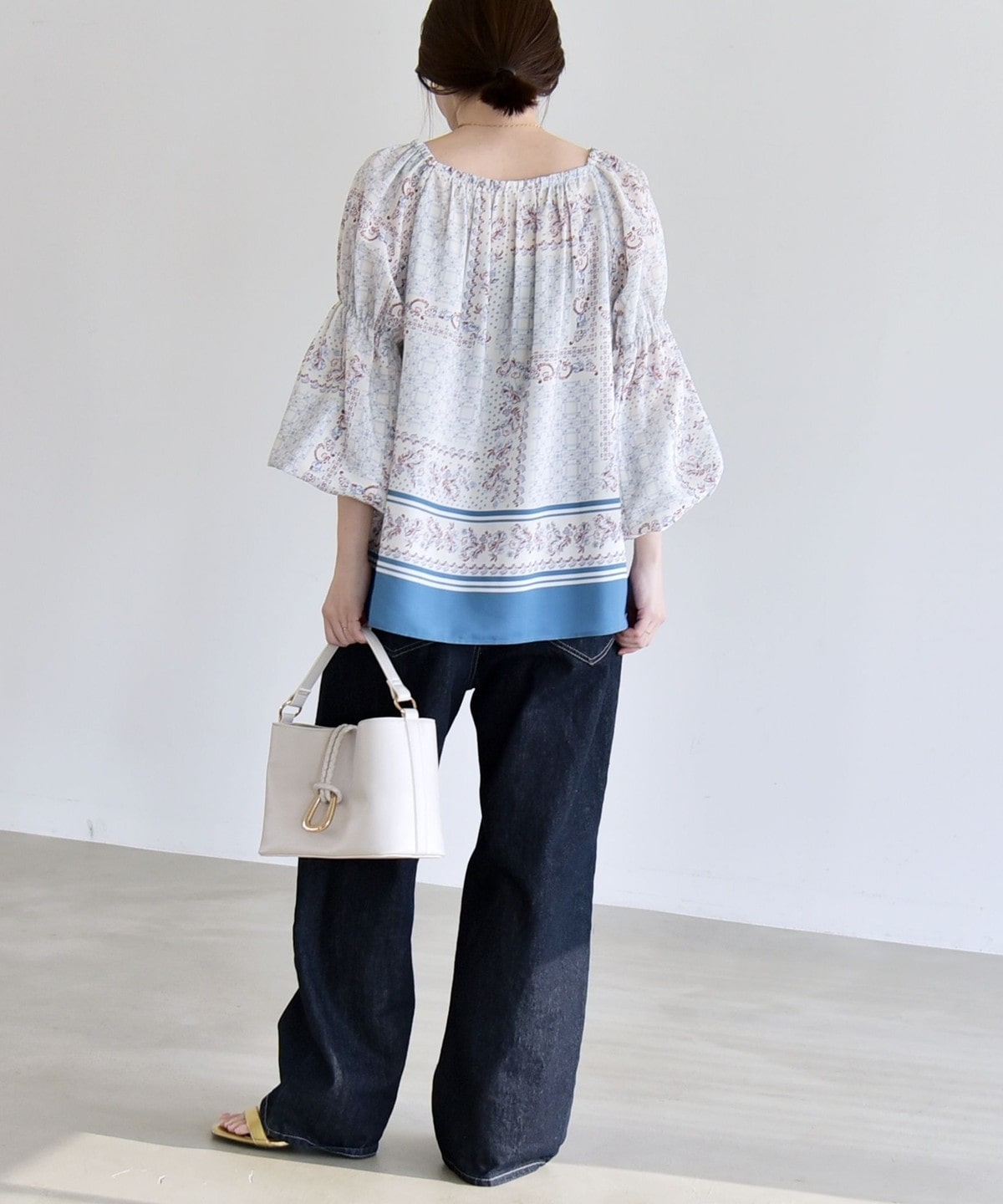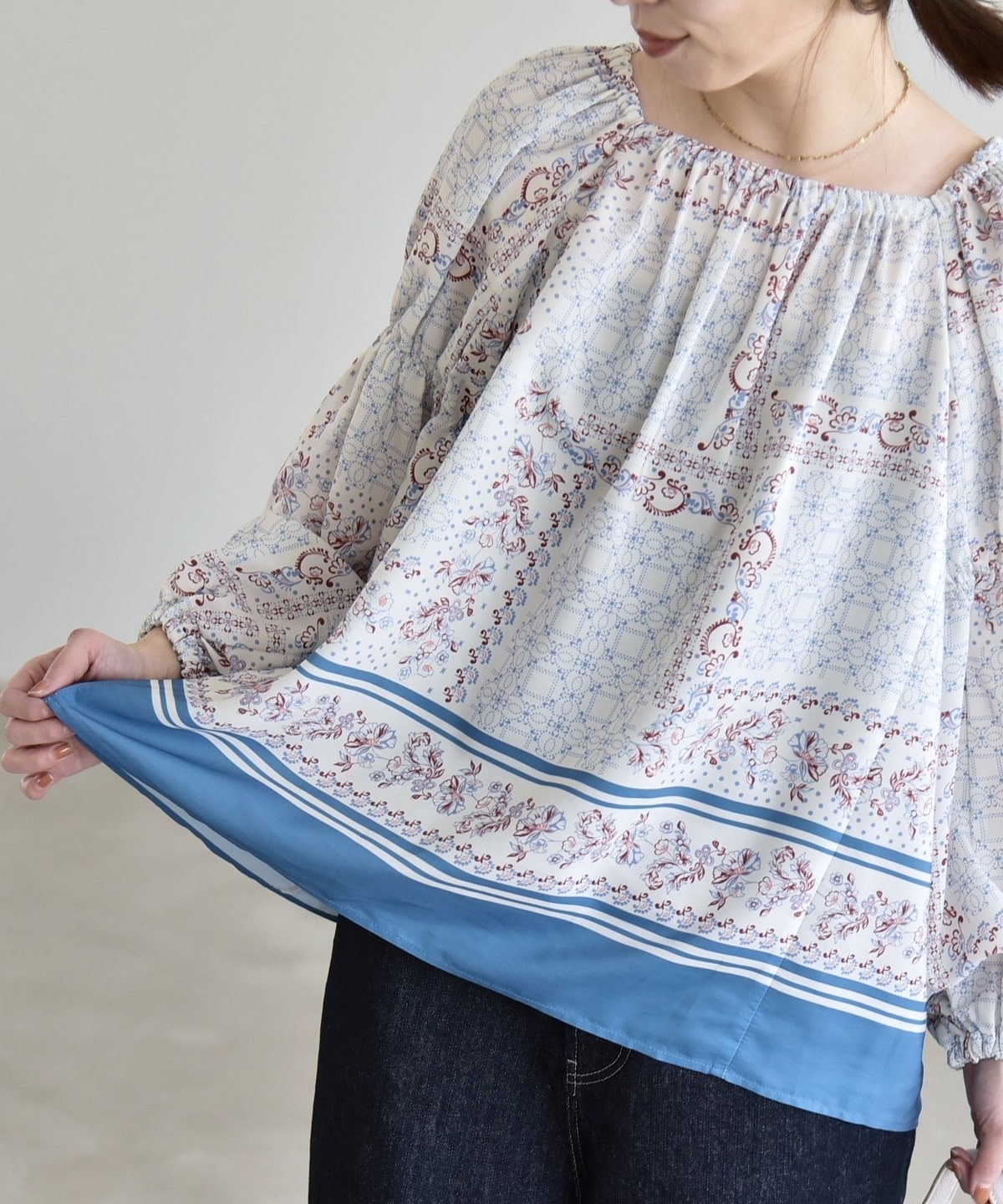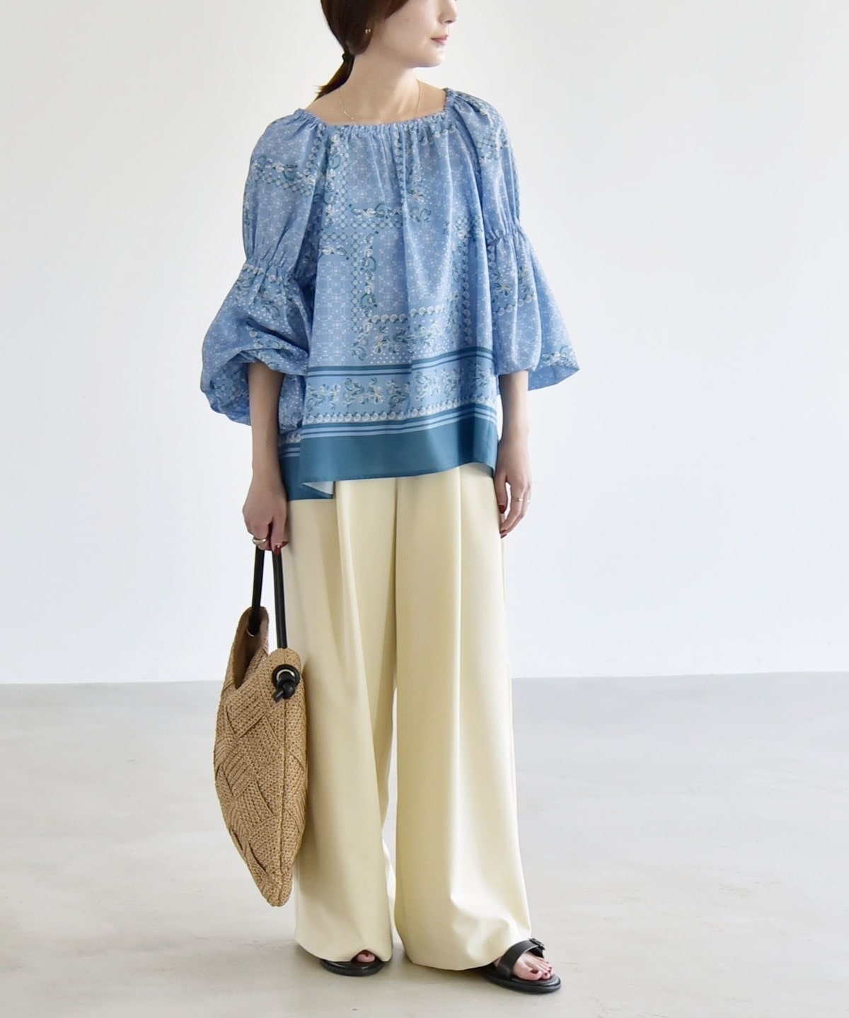 2. 《予約》quaranciel:〈洗濯機可能〉フラワー スカーフ プリント ギャザー パフ ブラウス ライトブルー