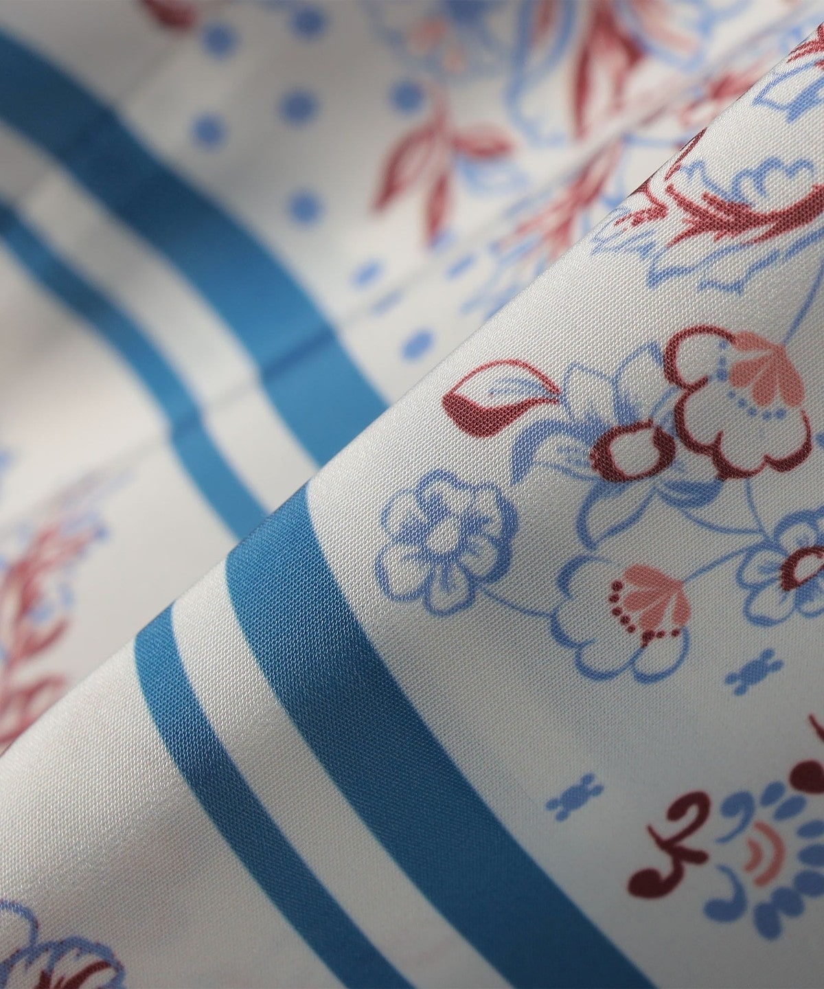 繊細な小花柄と幾何学模様を組み合わせたプリントが印象的なパフスリーブブラウス。