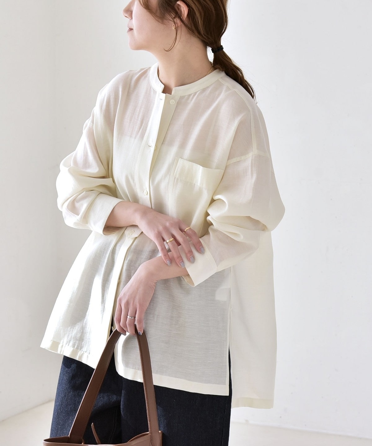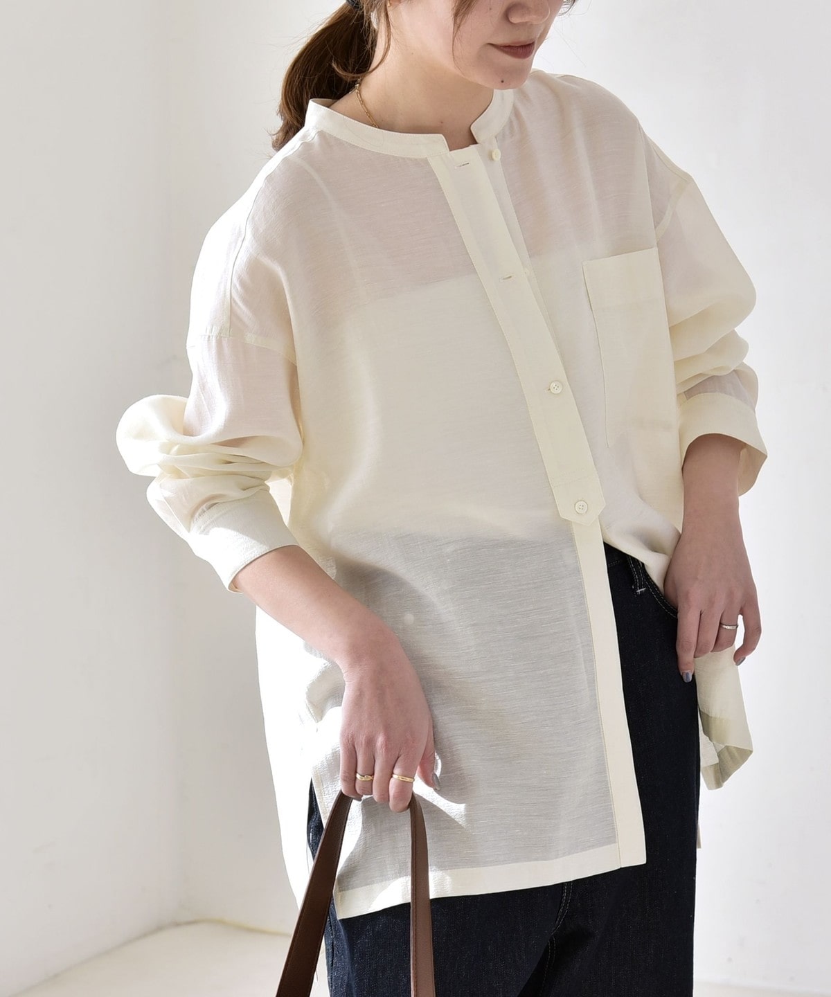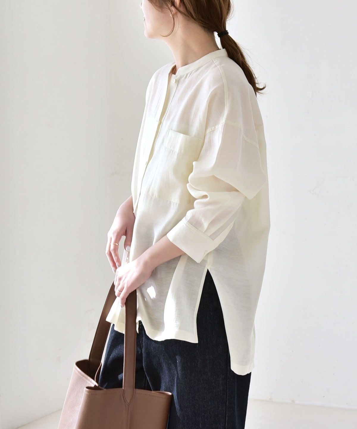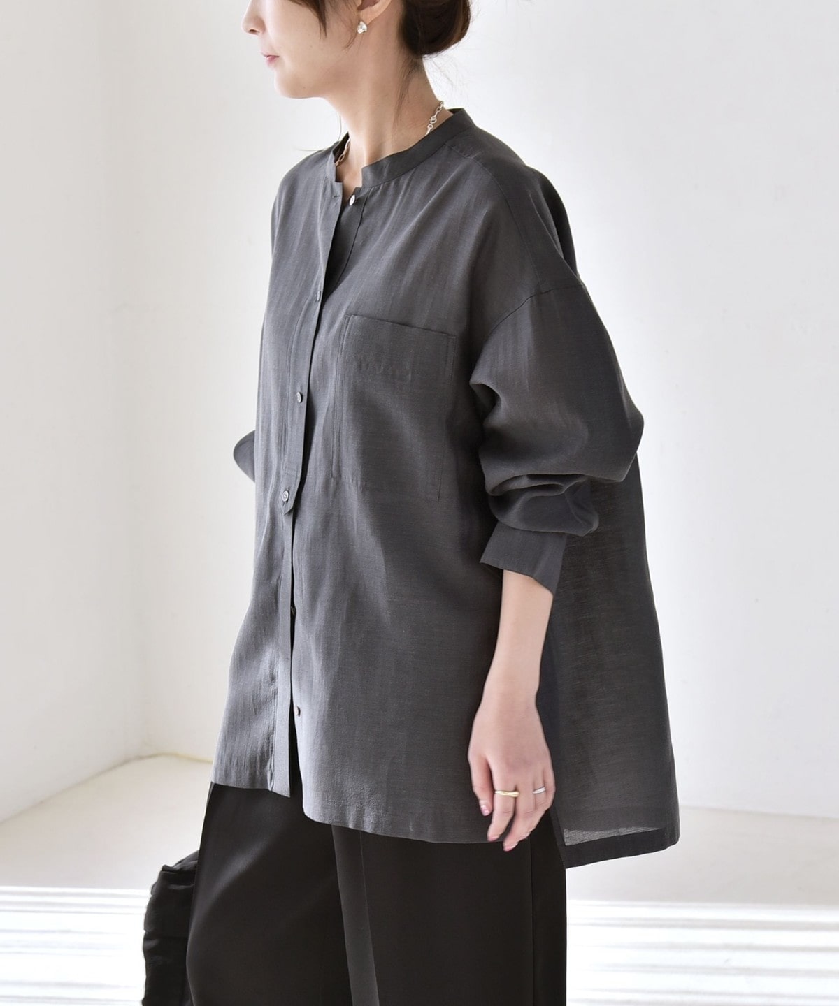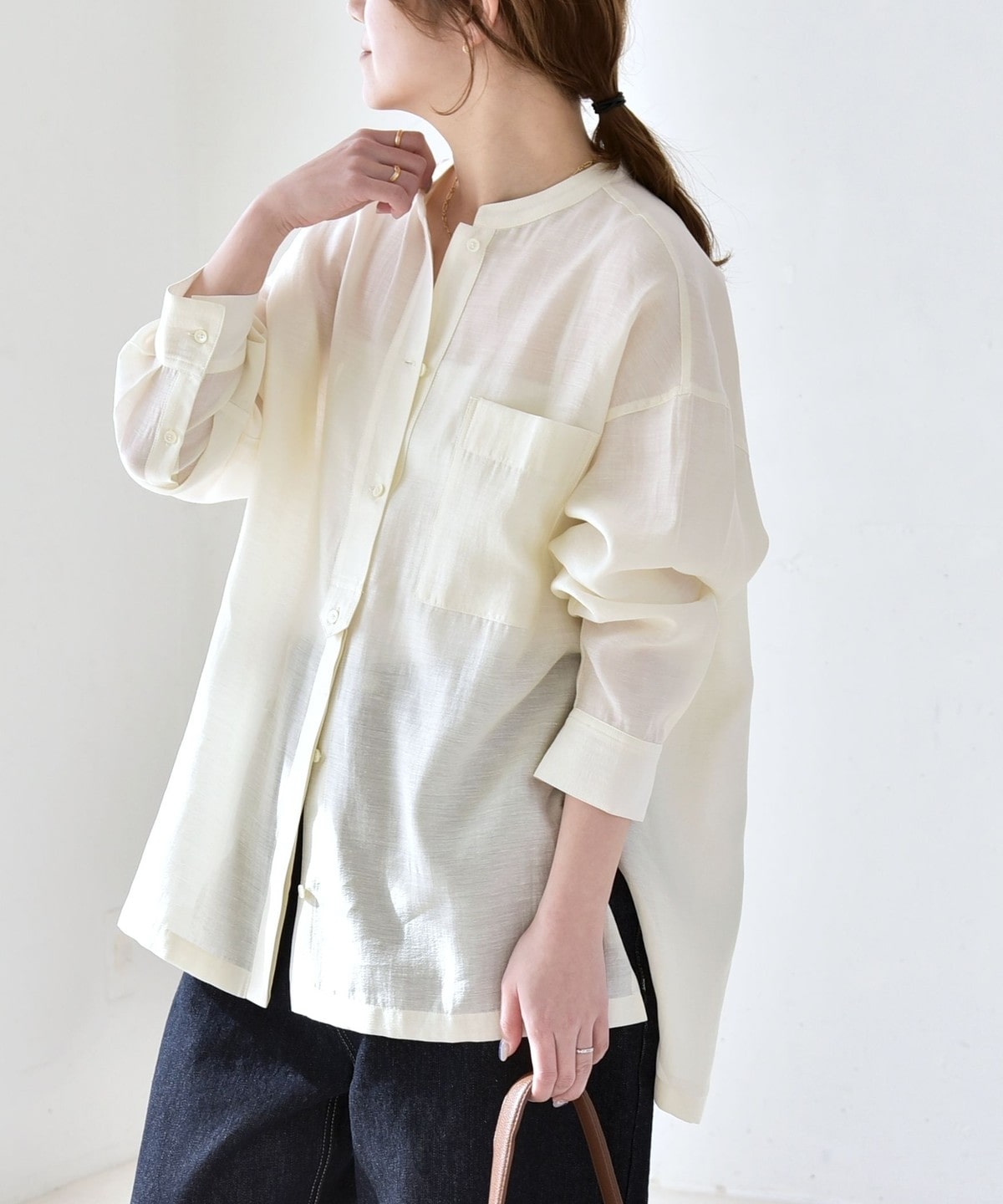 リネン混素材のナチュラルな風合いと、軽やかなシアー感がポイントのバンドカラーシャツ。