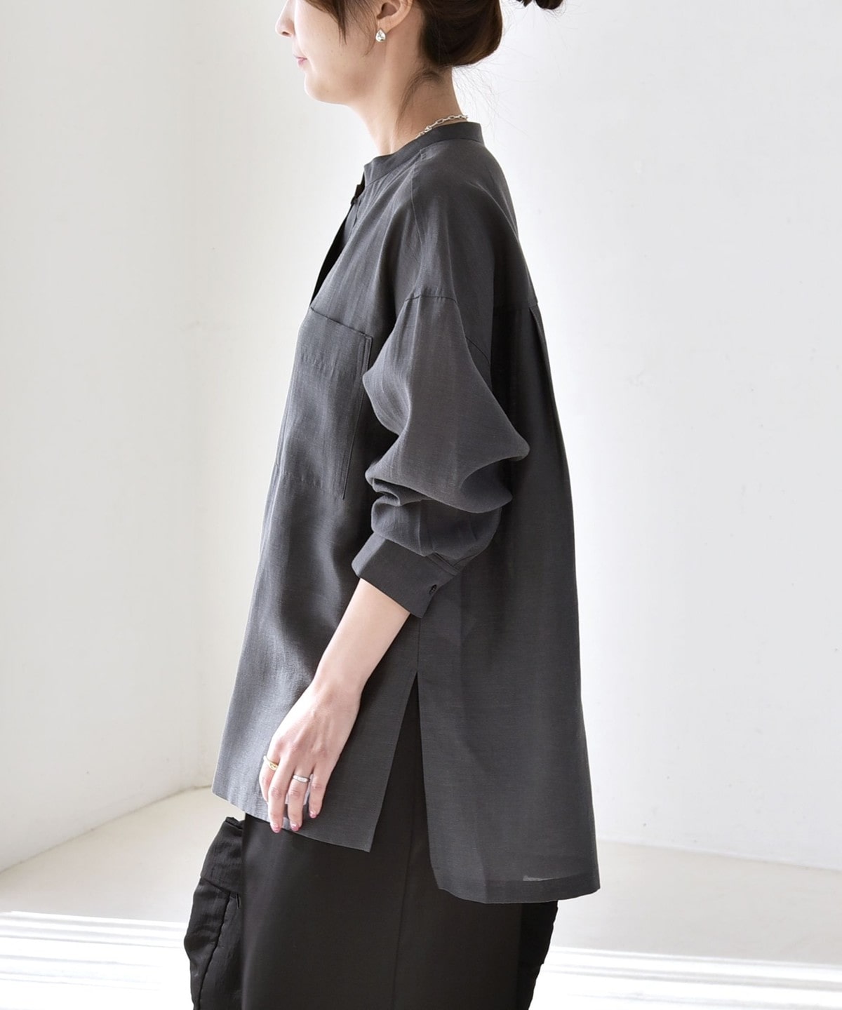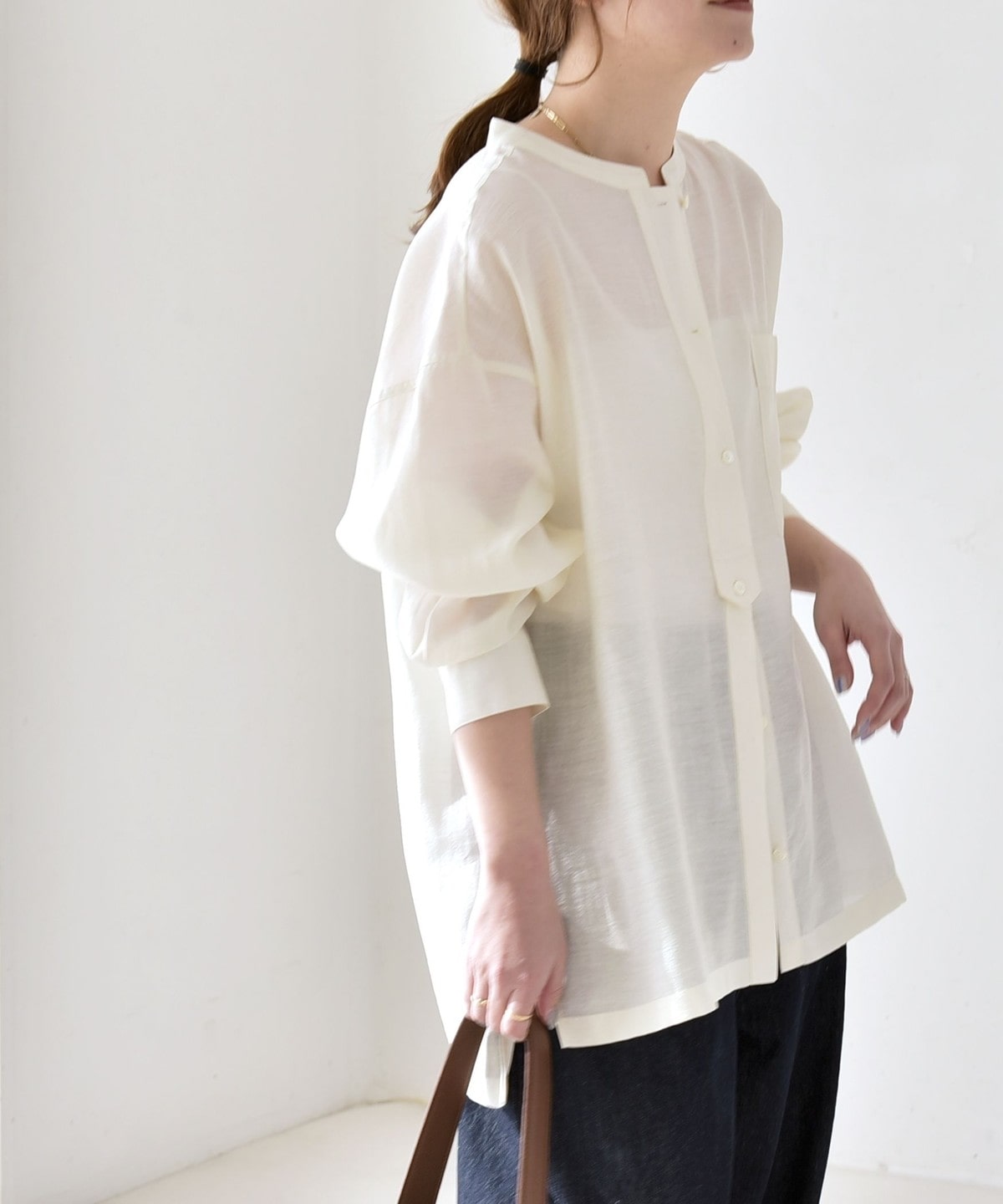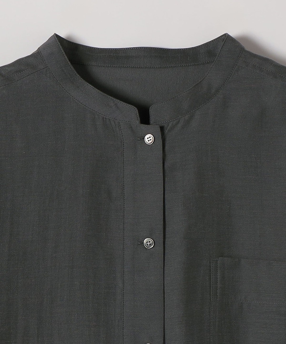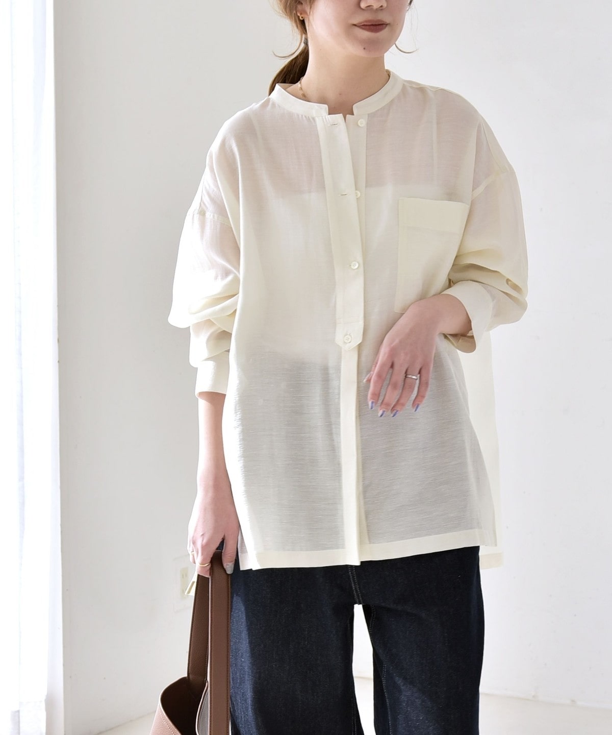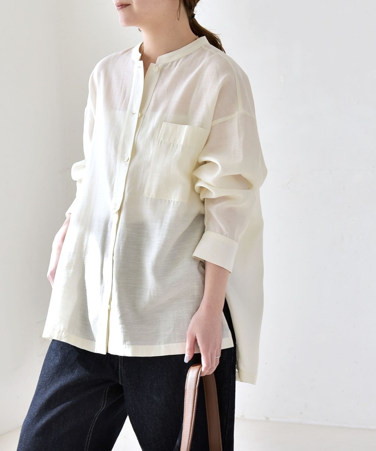 リネン混素材のナチュラルな風合いと、軽やかなシアー感がポイントのバンドカラーシャツ。