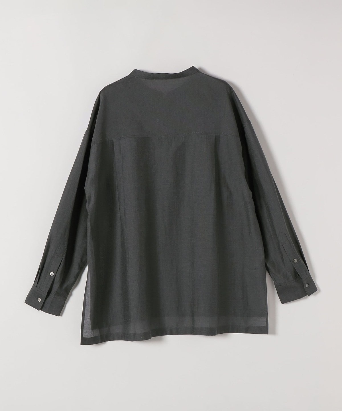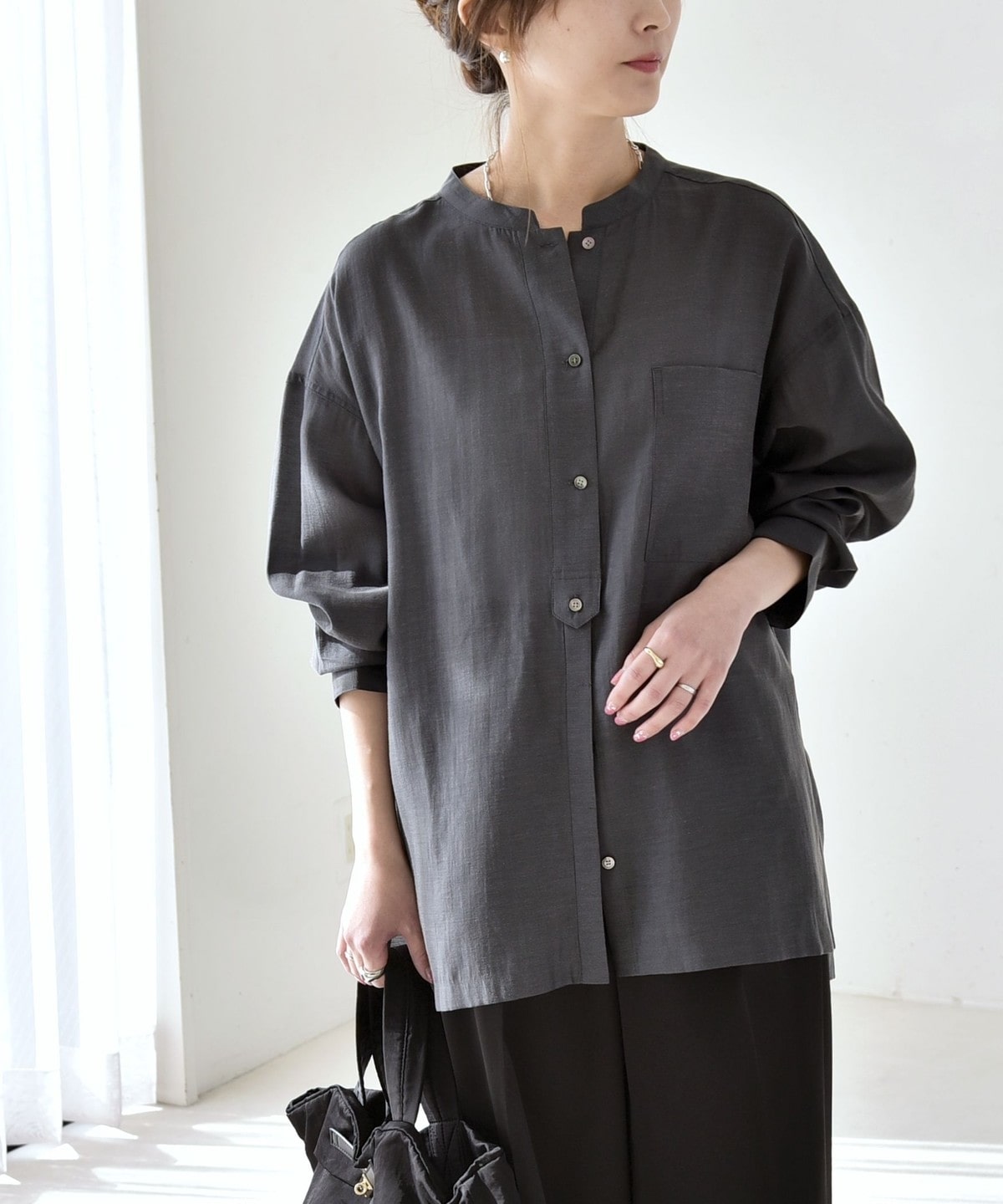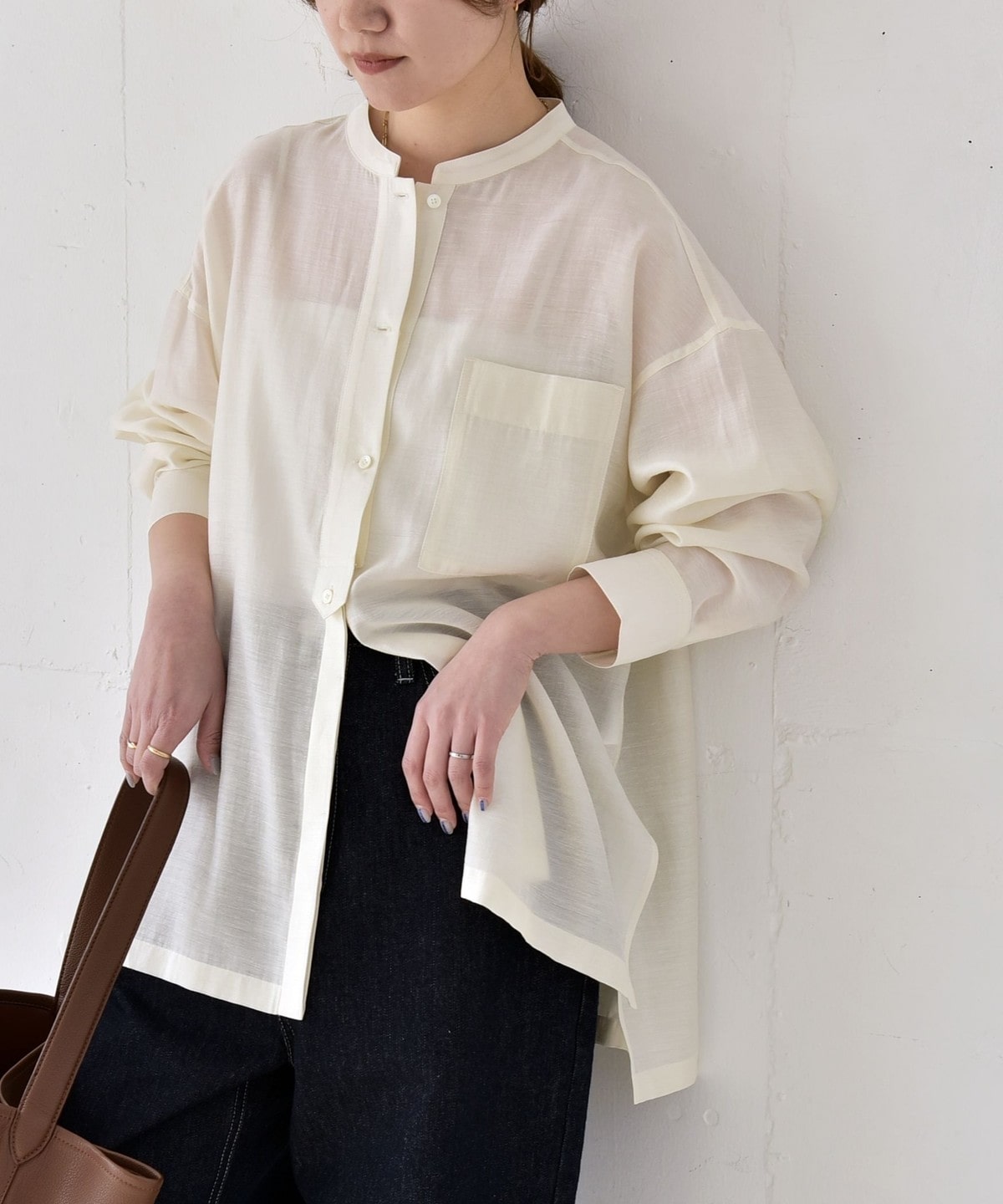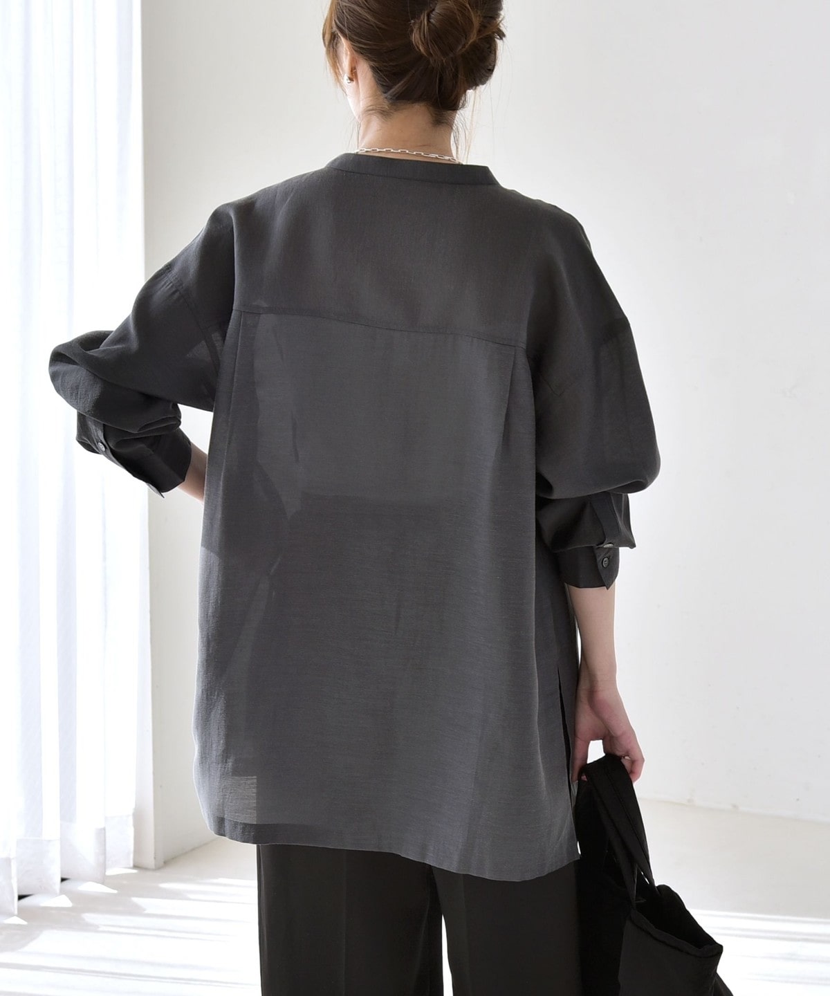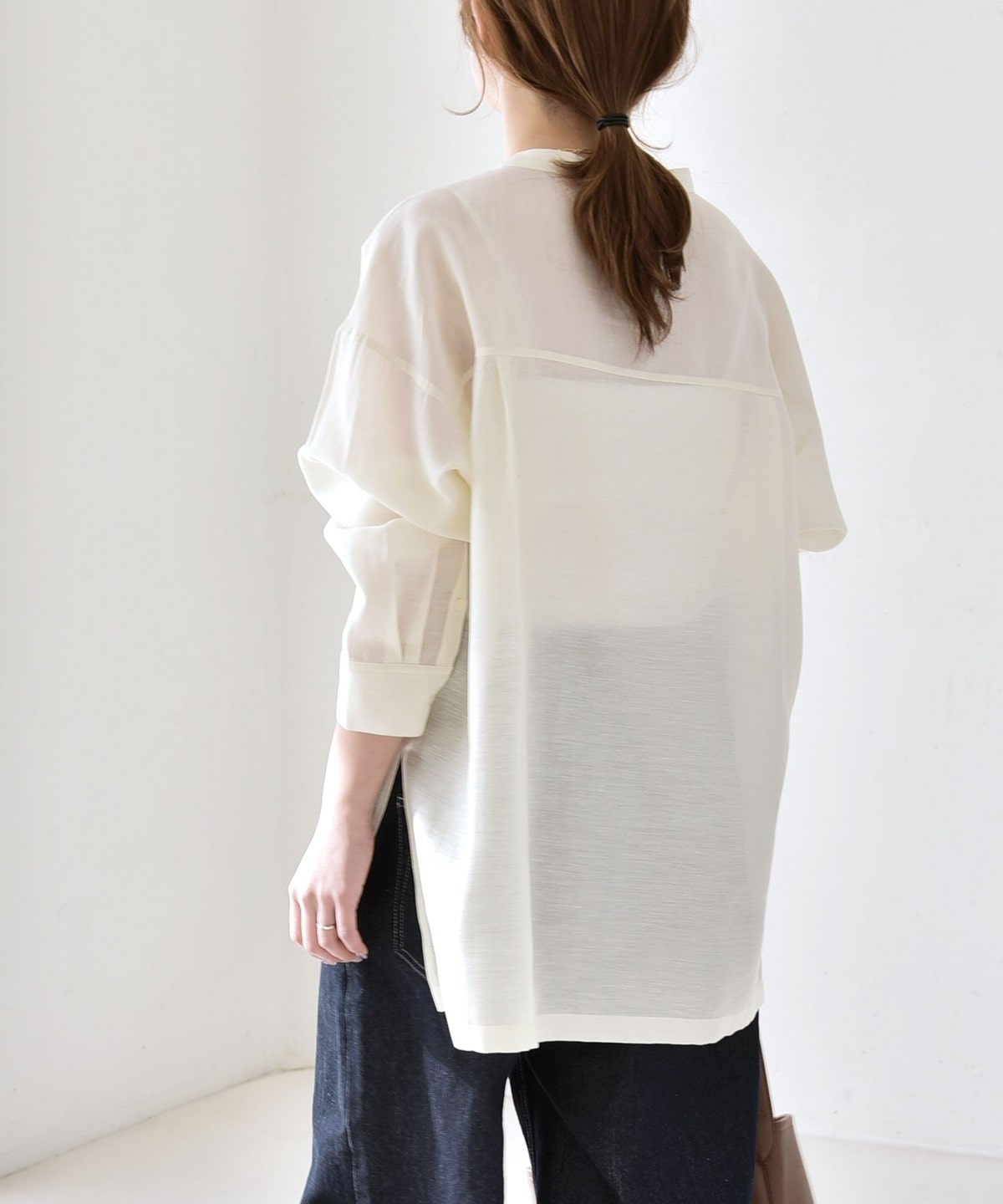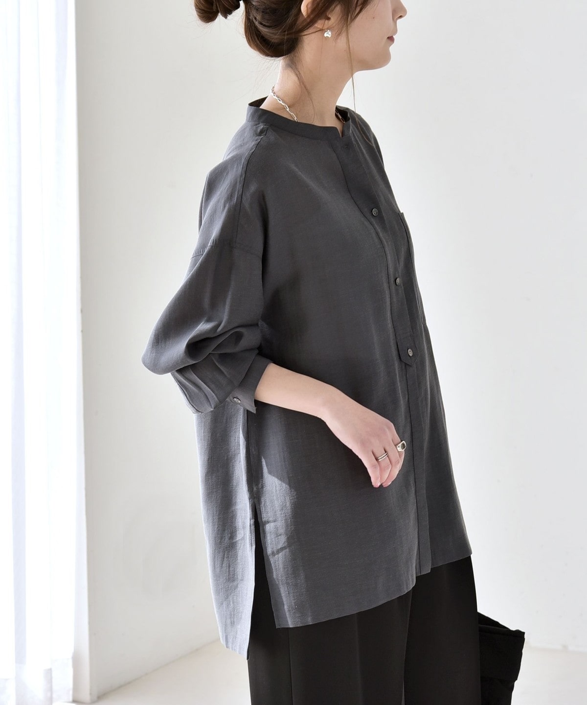 リネン混素材のナチュラルな風合いと、軽やかなシアー感がポイントのバンドカラーシャツ。