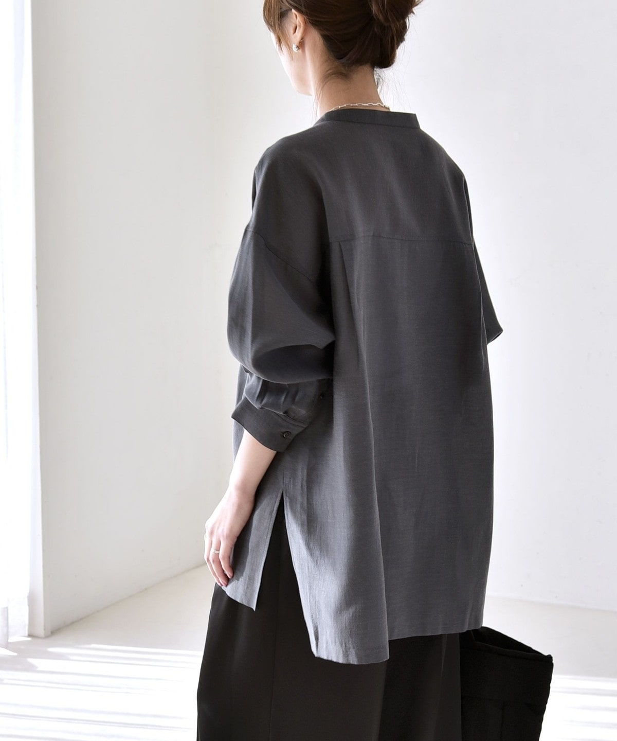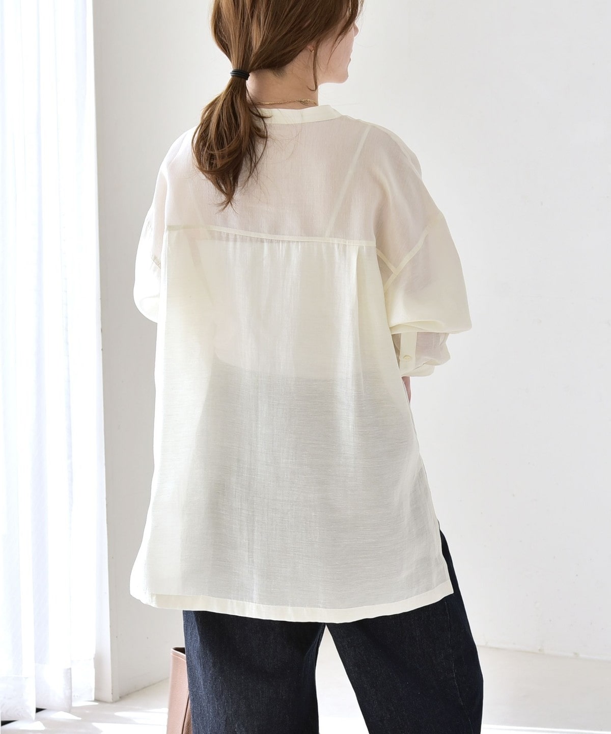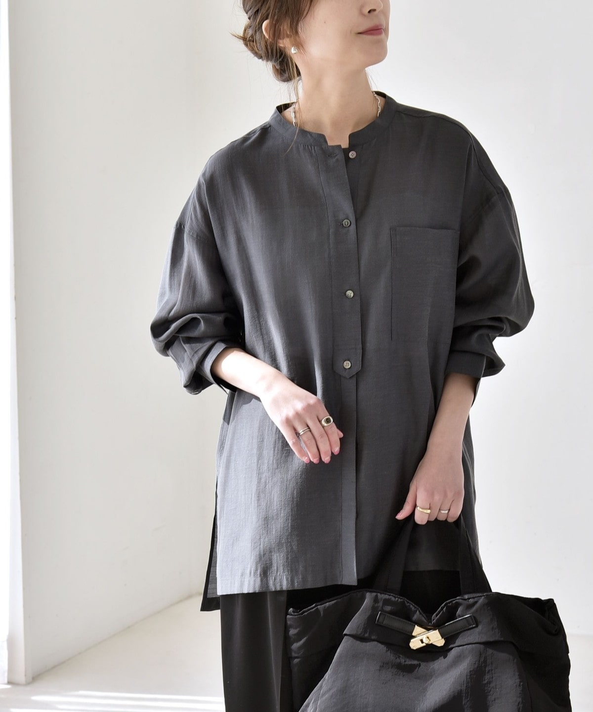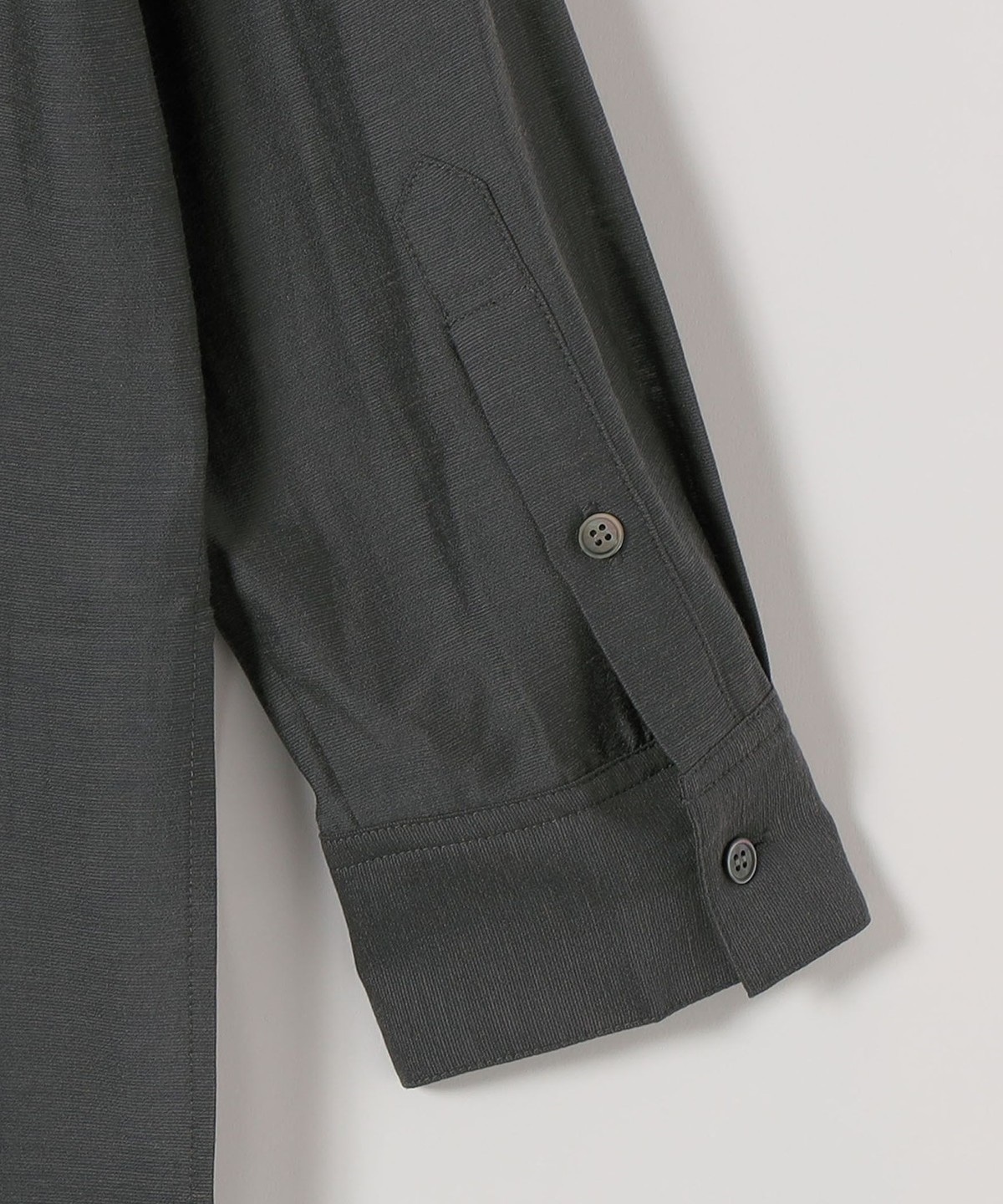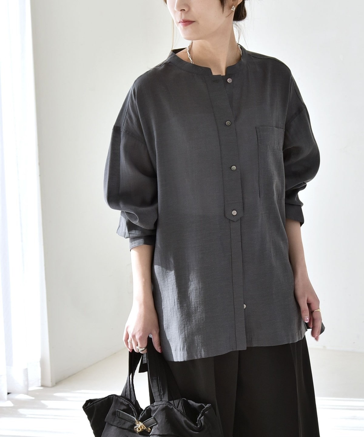 リネン混素材のナチュラルな風合いと、軽やかなシアー感がポイントのバンドカラーシャツ。