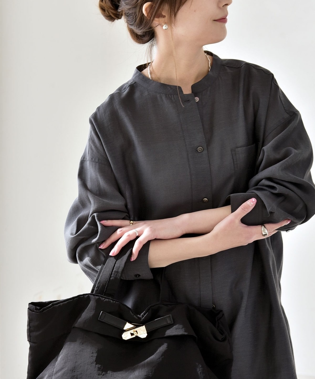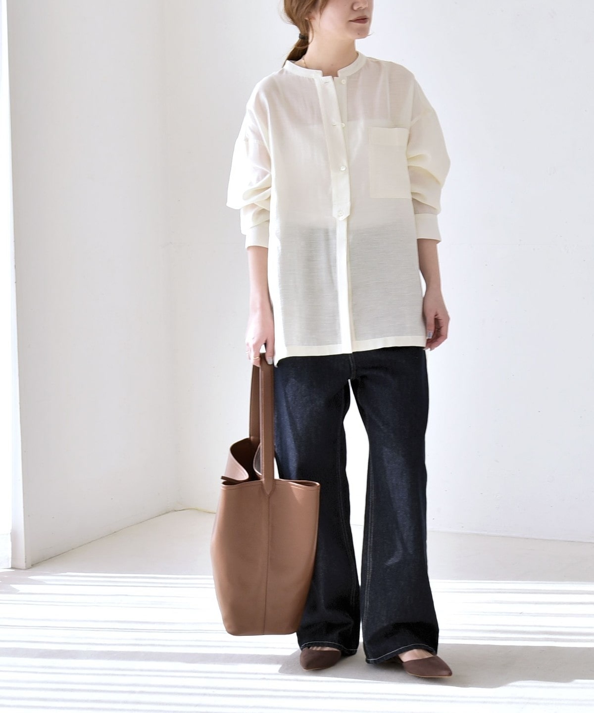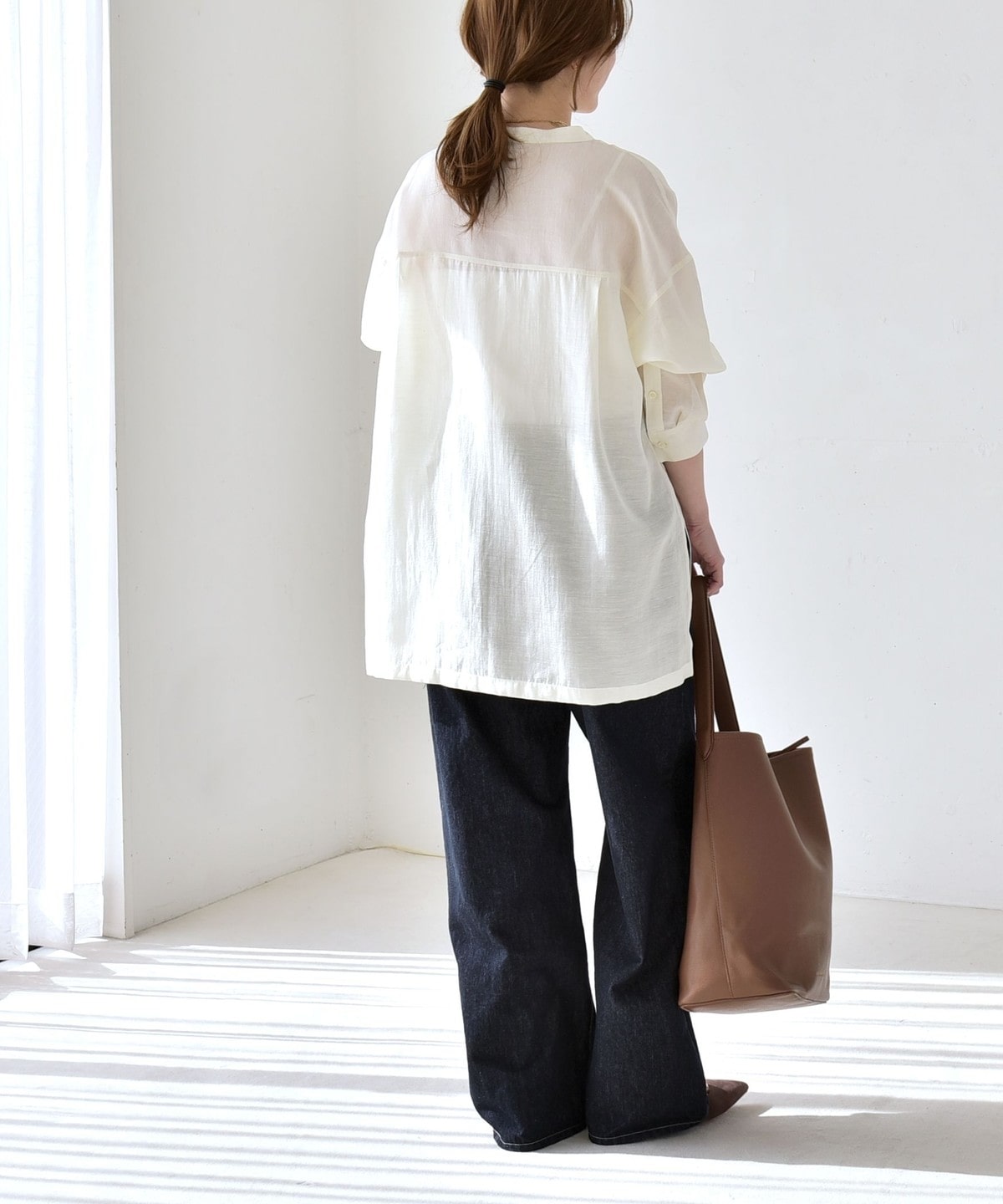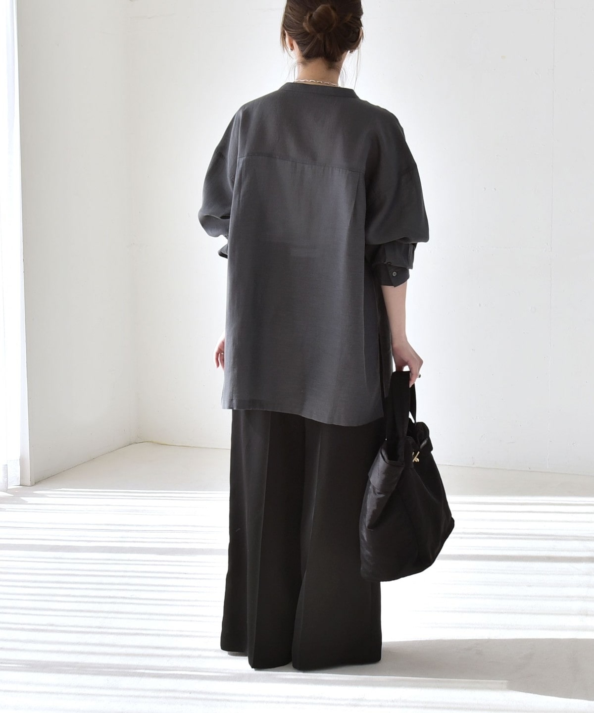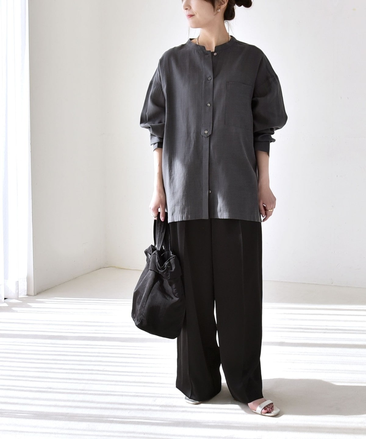 リネン混素材のナチュラルな風合いと、軽やかなシアー感がポイントのバンドカラーシャツ。
