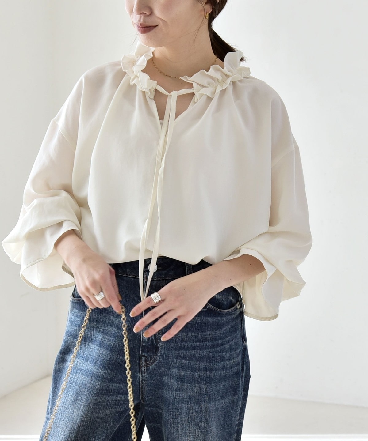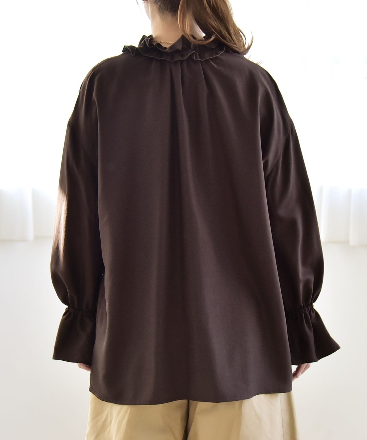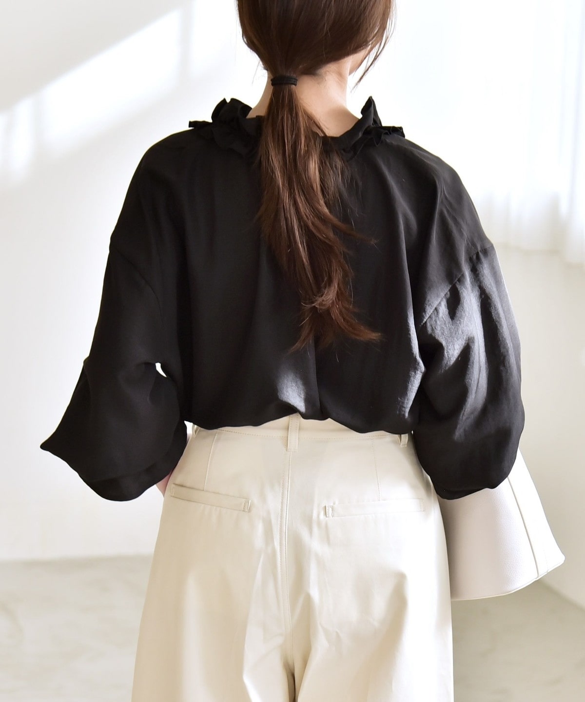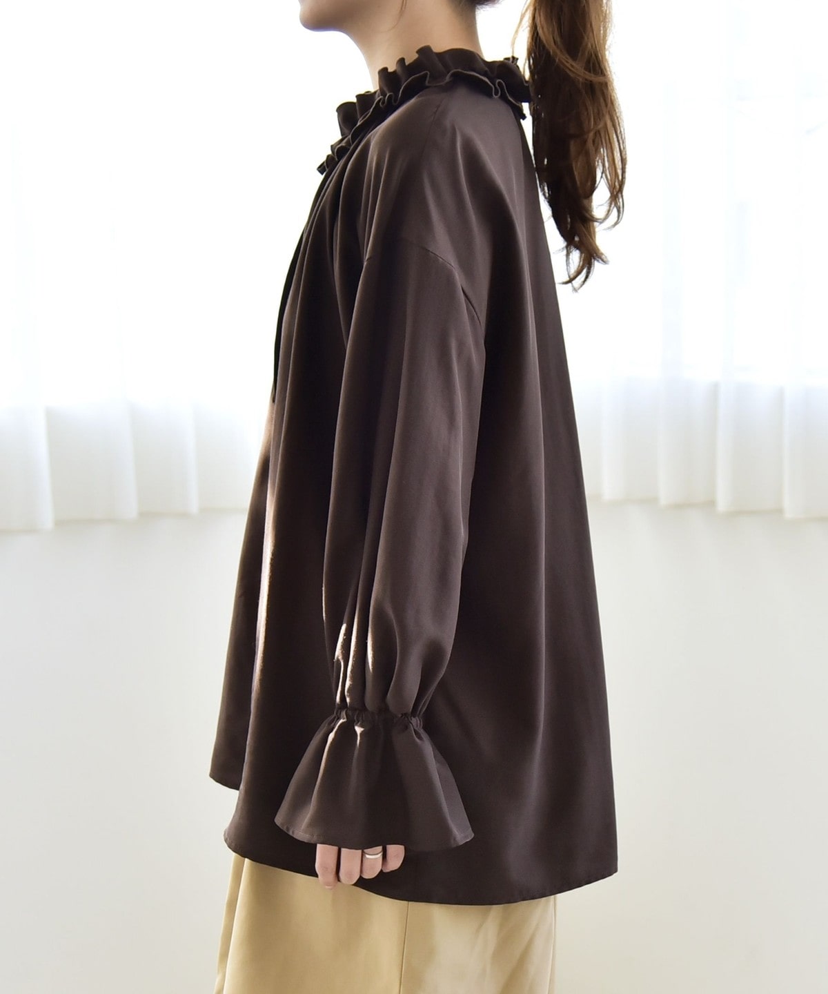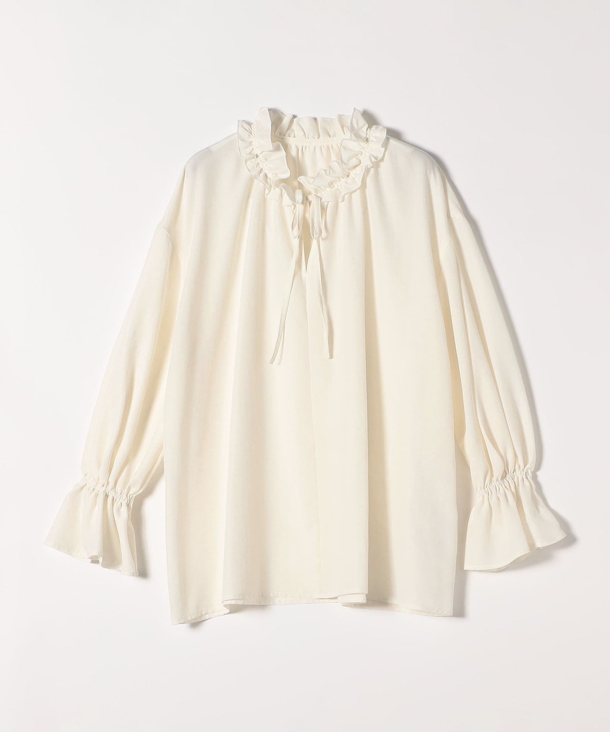 袖口がキャンディスリーブのようになっているので、ジャケットやニットの袖口からフリルを覗かせたレイヤードスタイルも◎