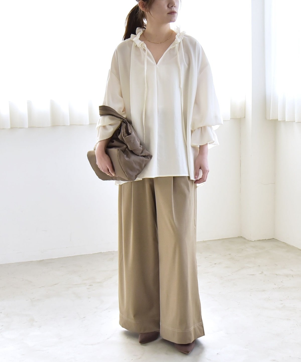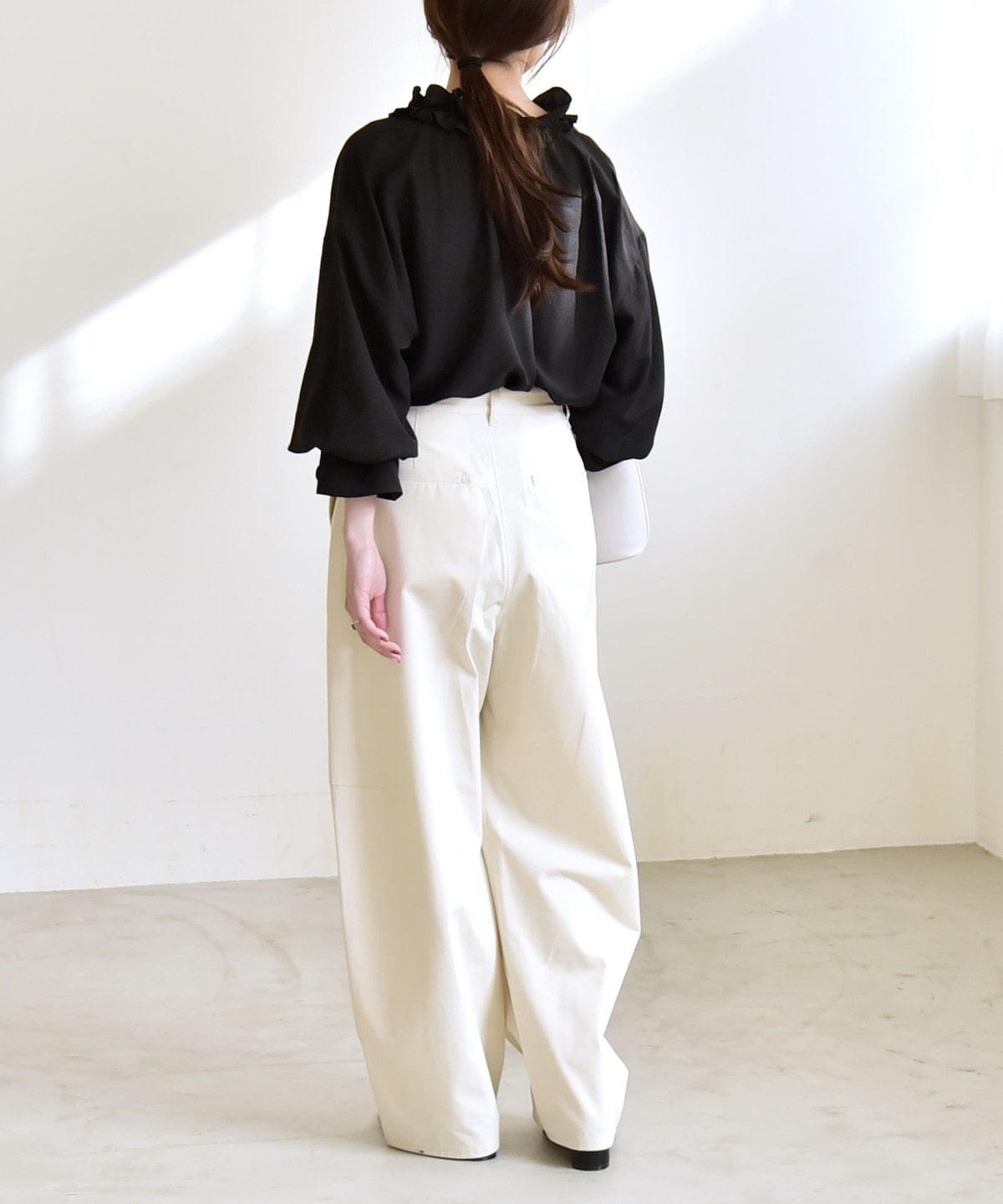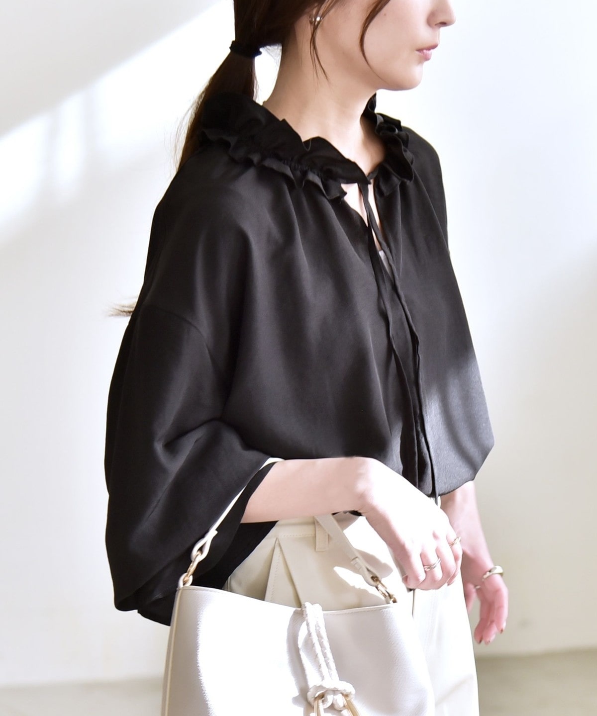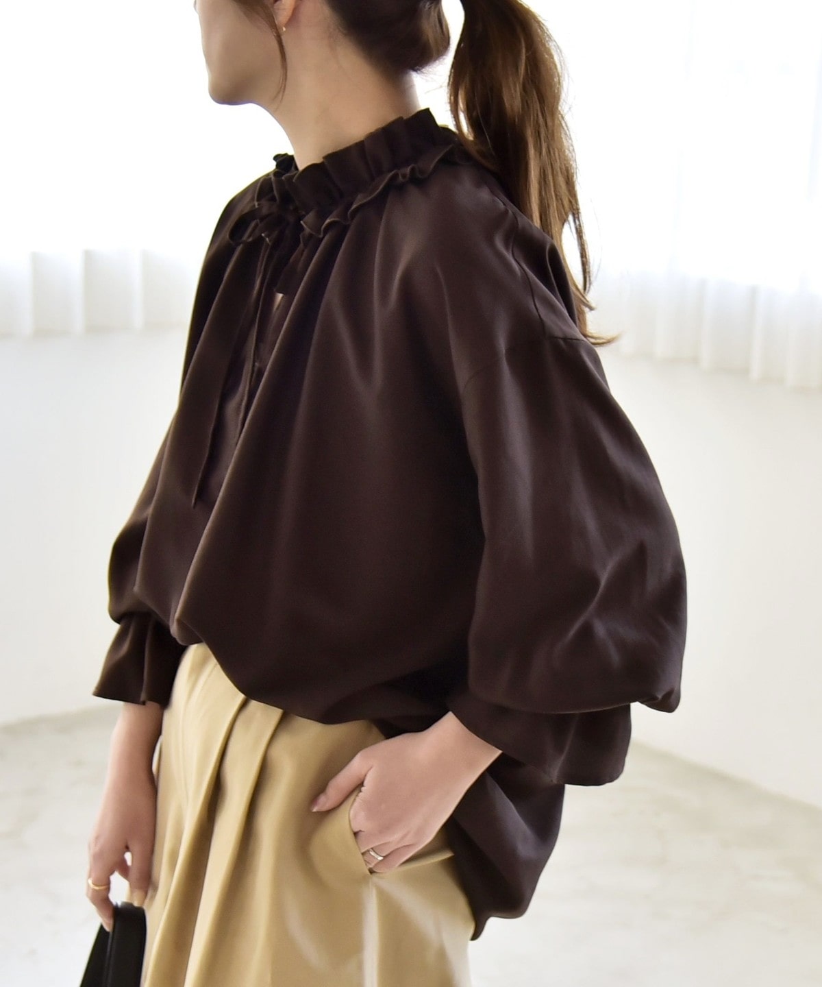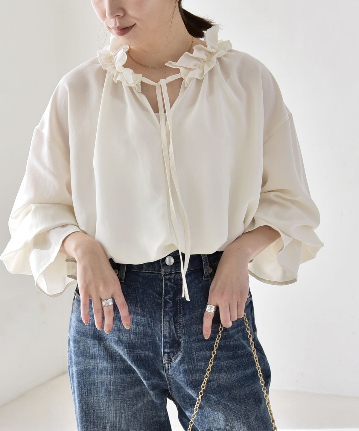 袖口がキャンディスリーブのようになっているので、ジャケットやニットの袖口からフリルを覗かせたレイヤードスタイルも◎