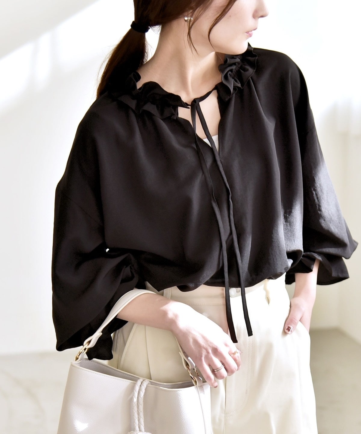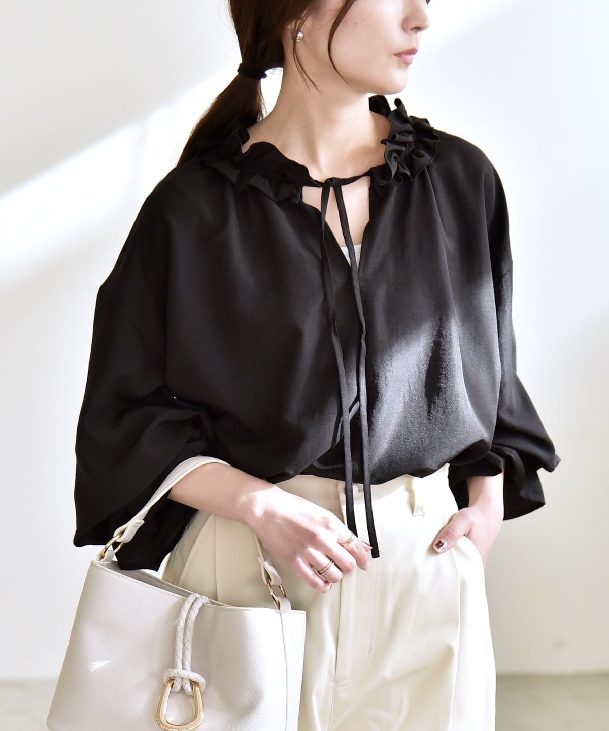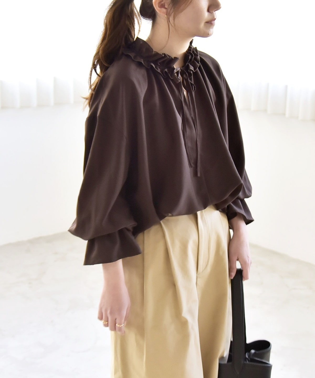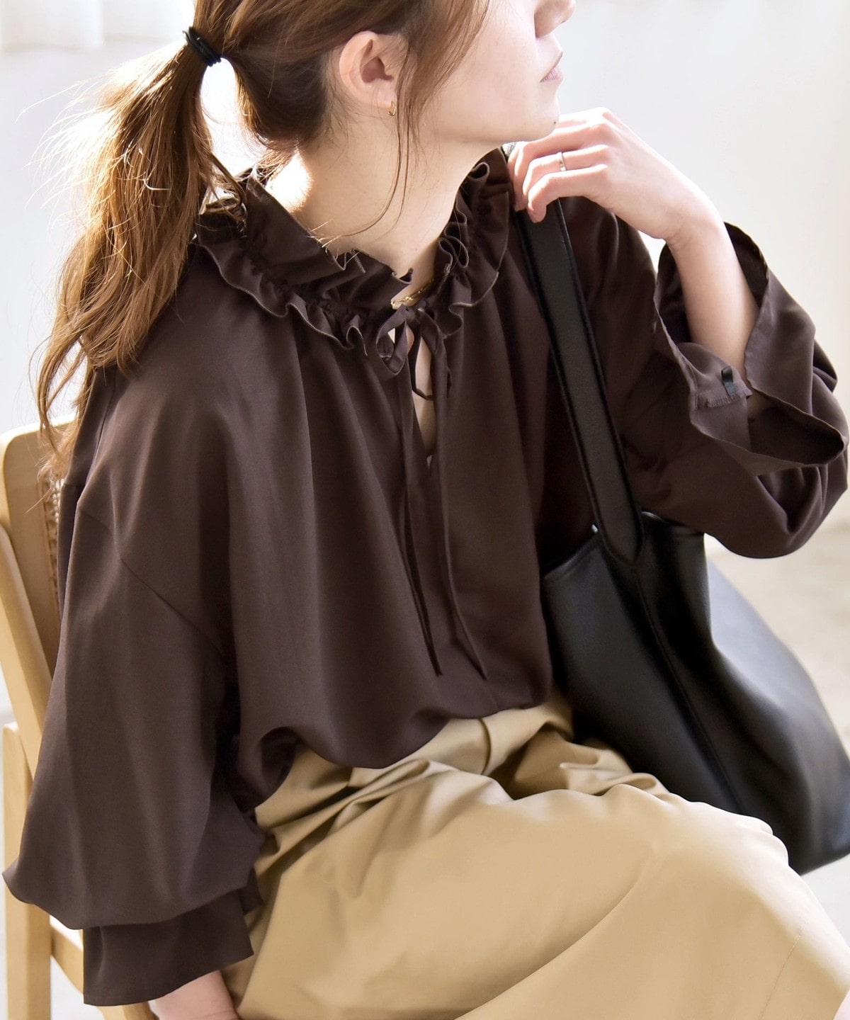 フリル襟で顔周りが華やぐ、着映えブラウス。