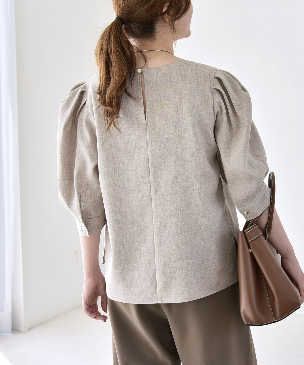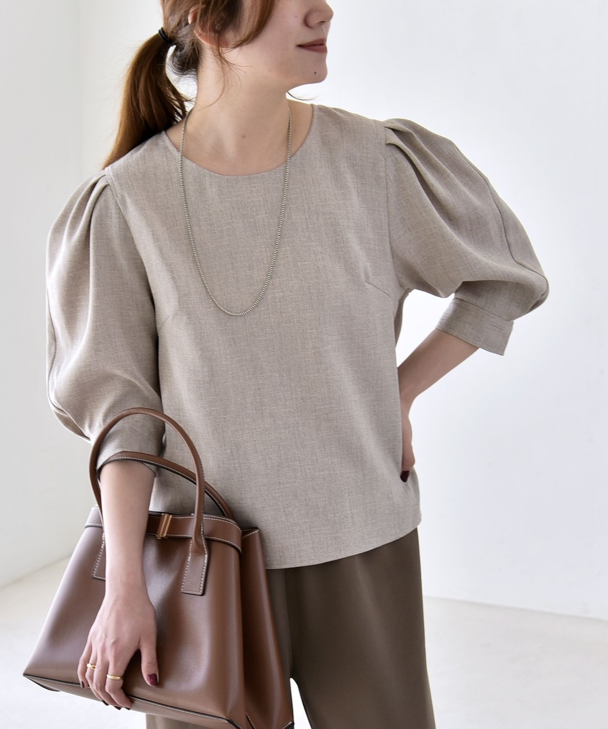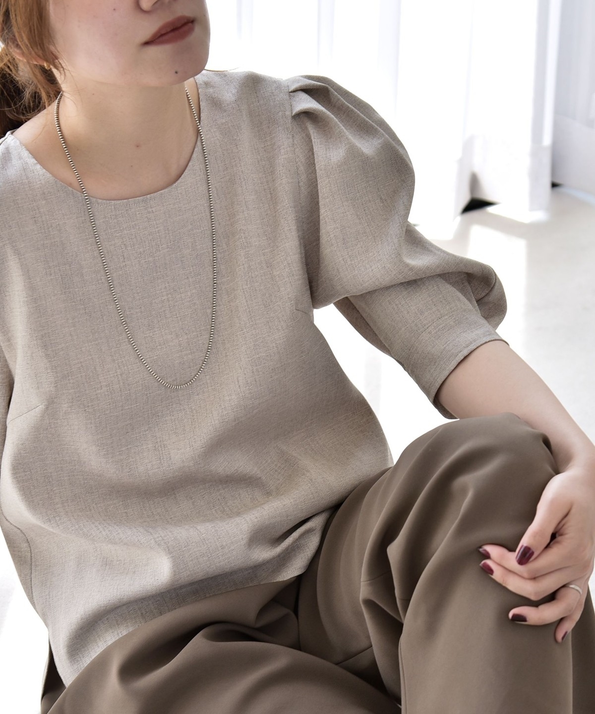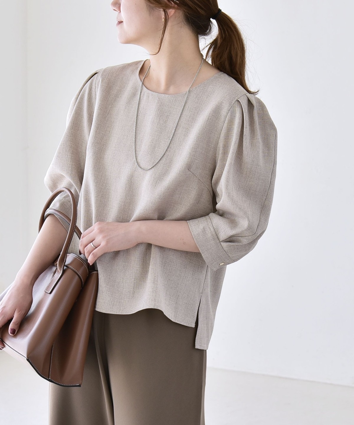 リネンライクのナチュラルな表情とモードな袖デザインが、可愛さもありながら大人な印象のデザインブラウス。