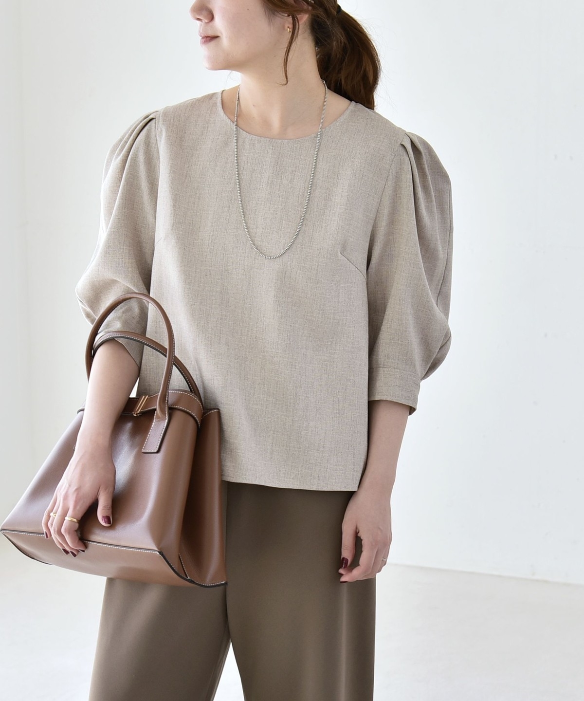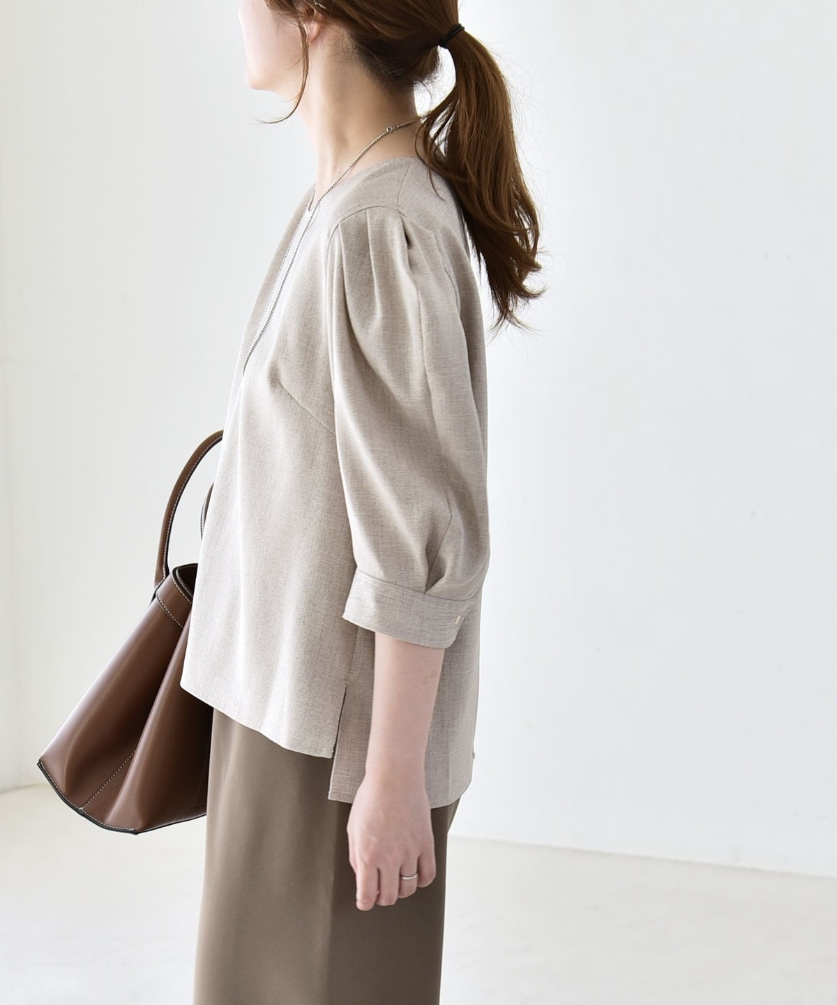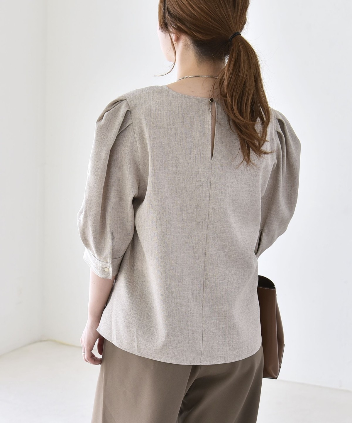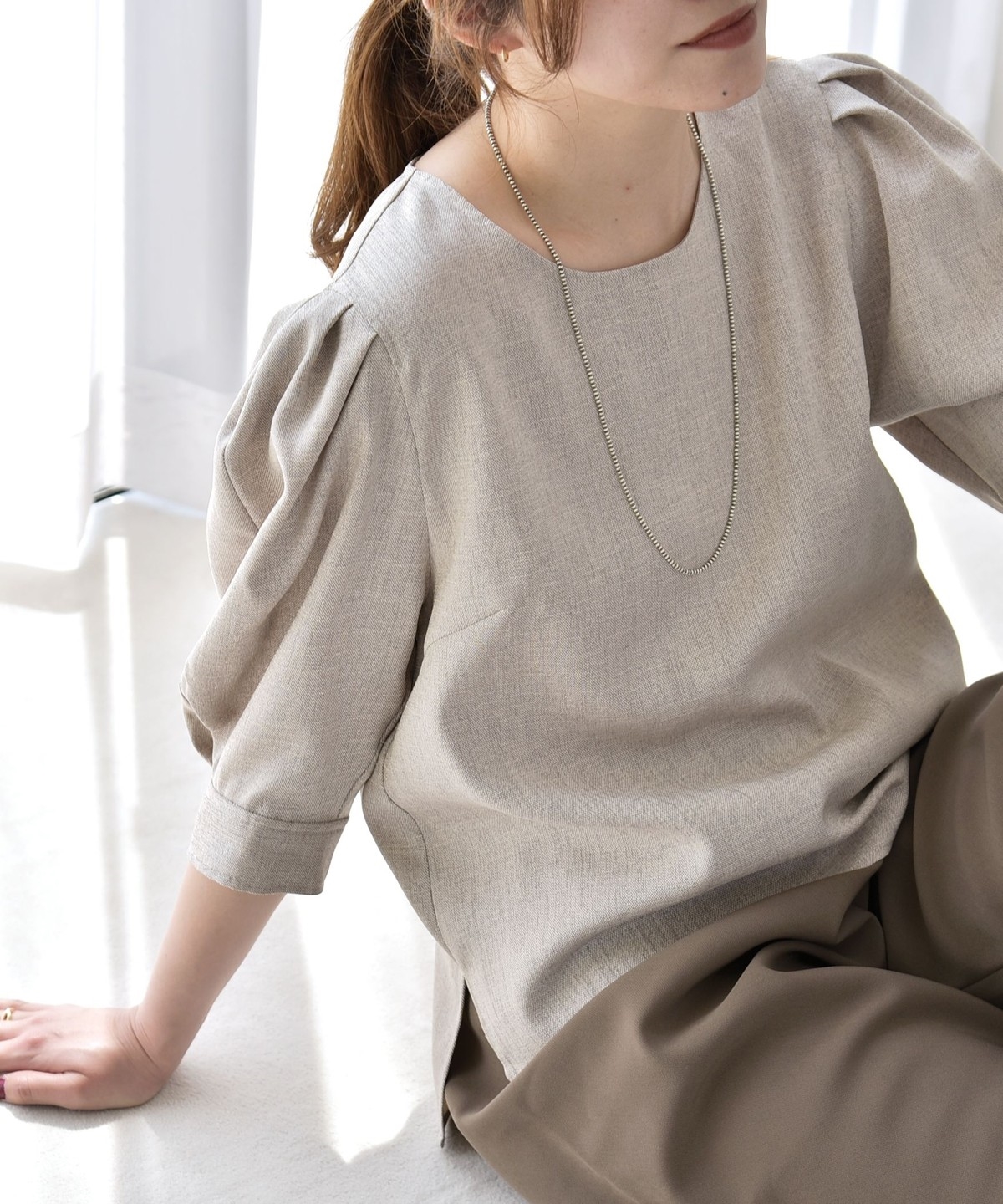 リネンライクのナチュラルな表情とモードな袖デザインが、可愛さもありながら大人な印象のデザインブラウス。