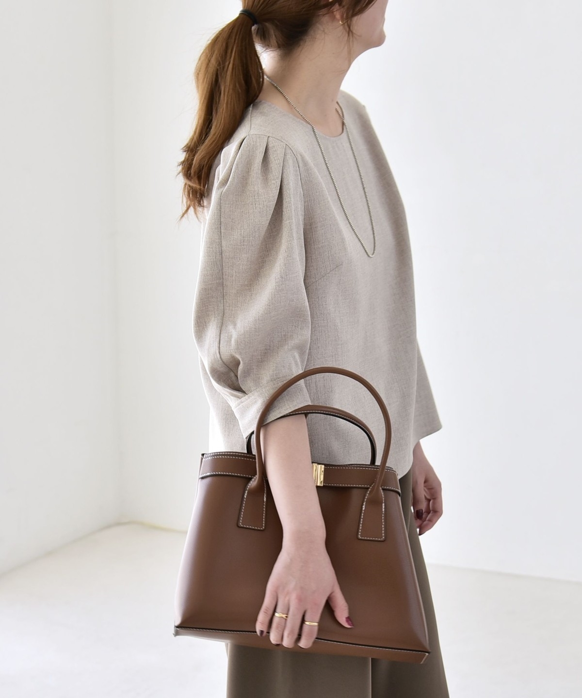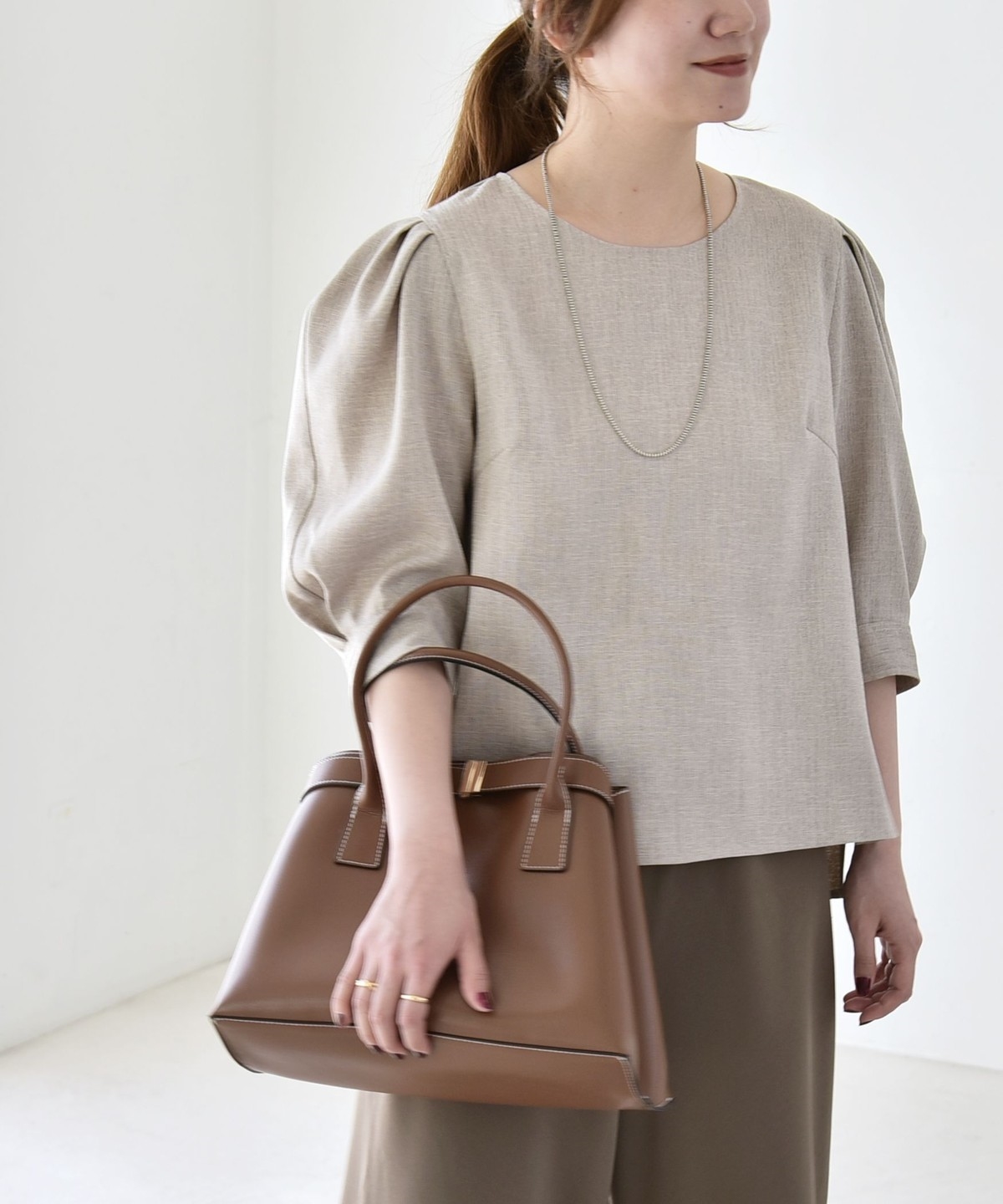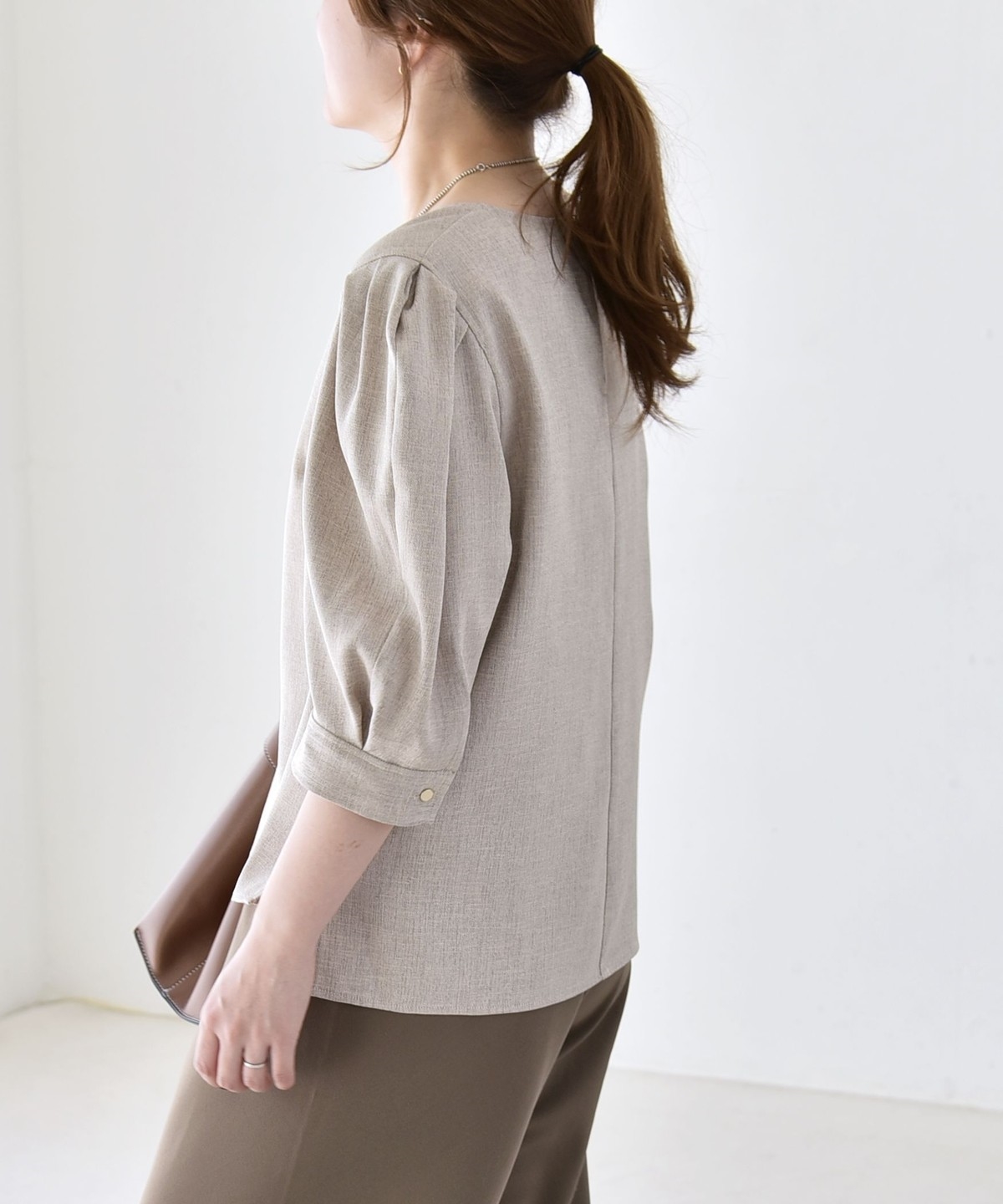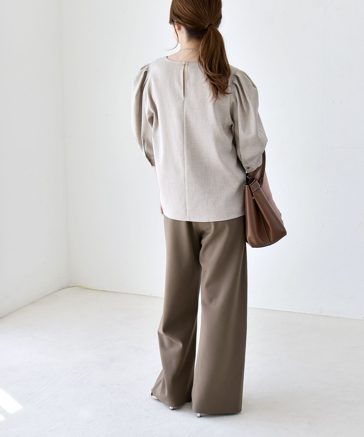 リネンライクのナチュラルな表情とモードな袖デザインが、可愛さもありながら大人な印象のデザインブラウス。