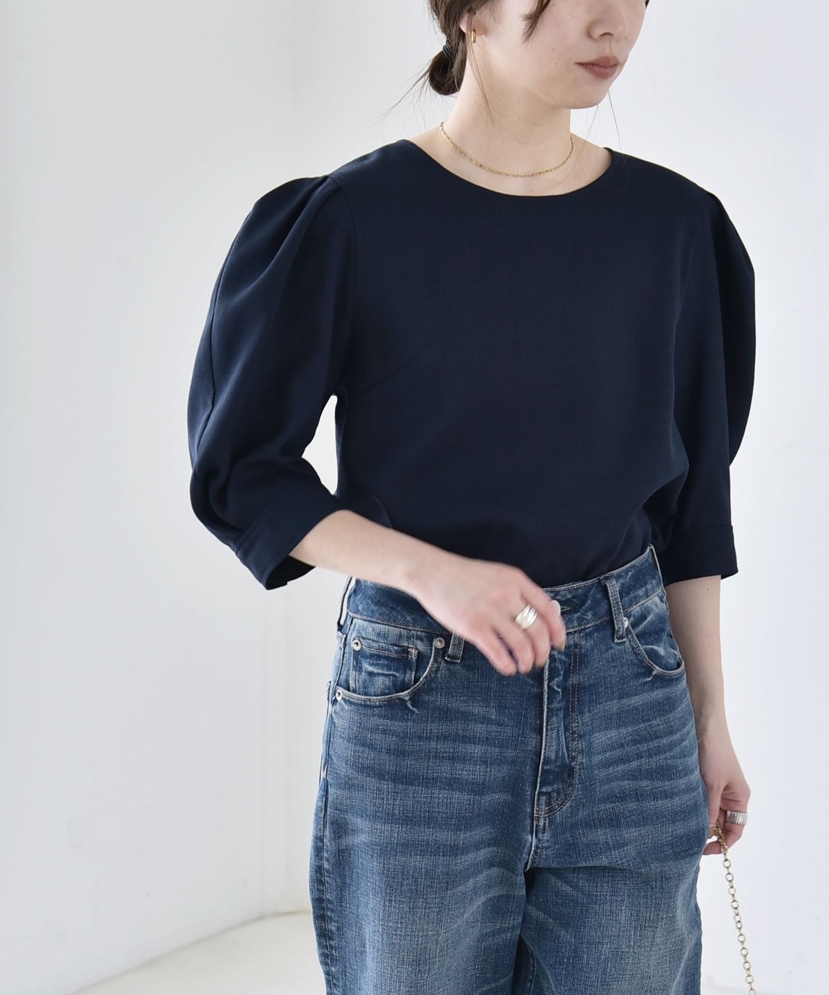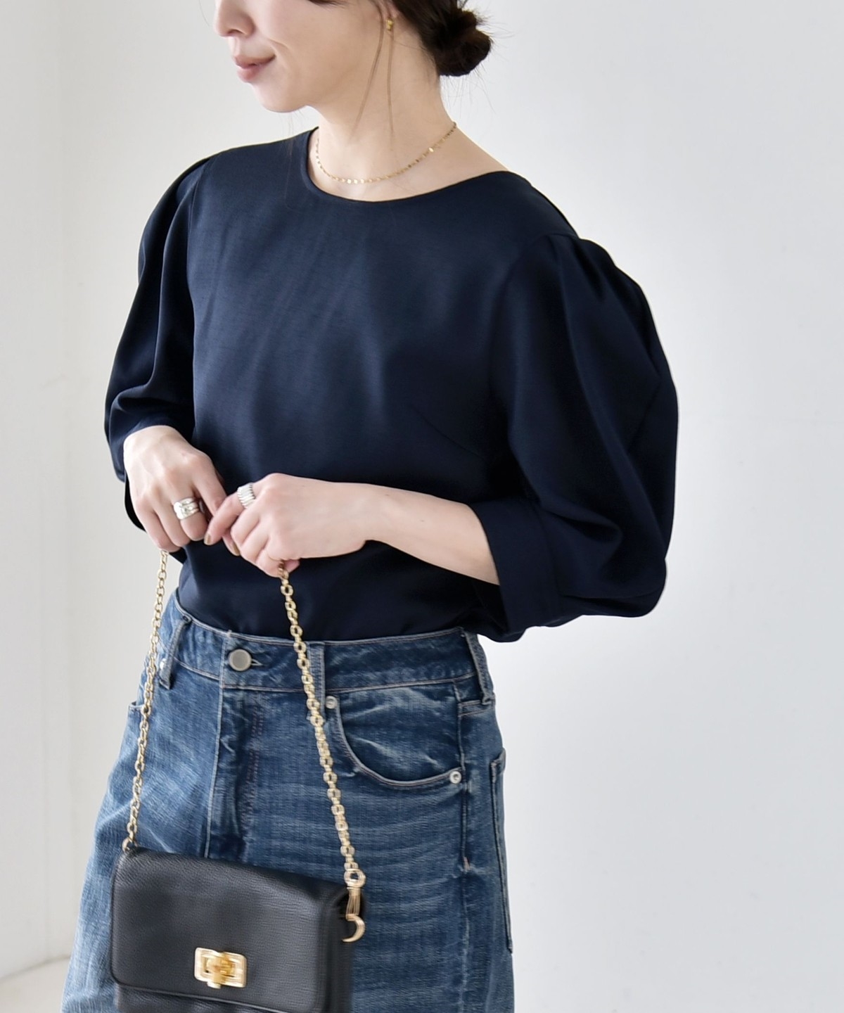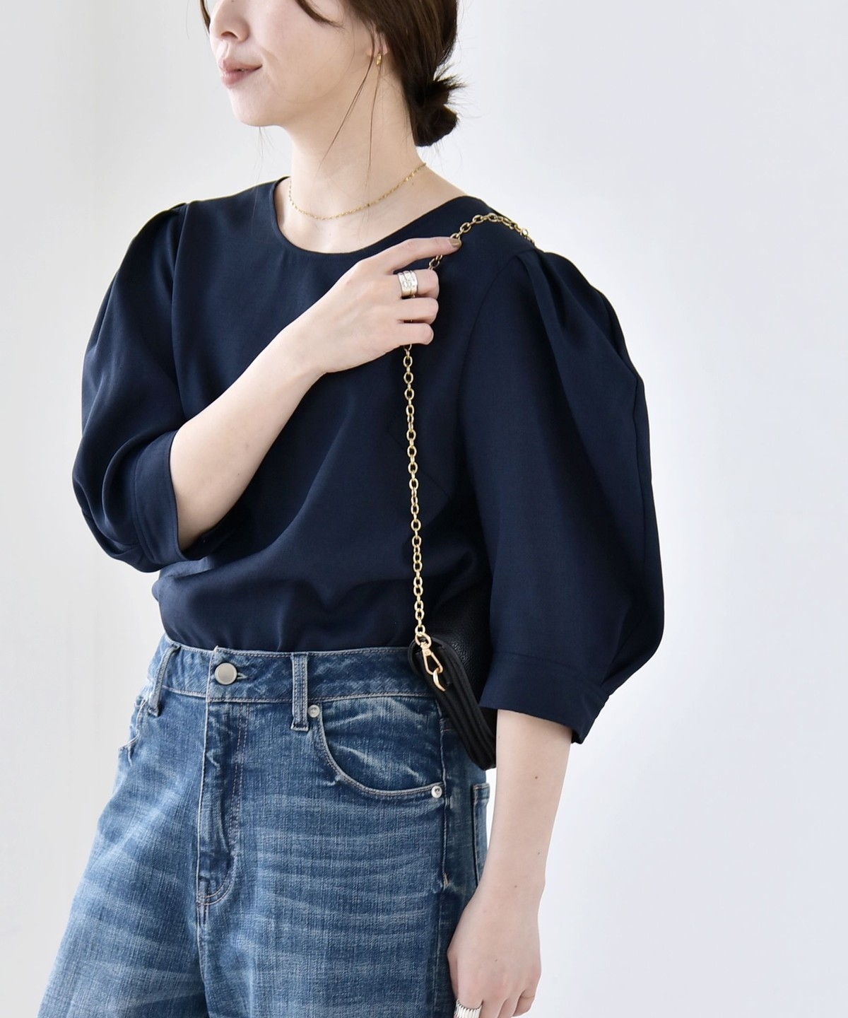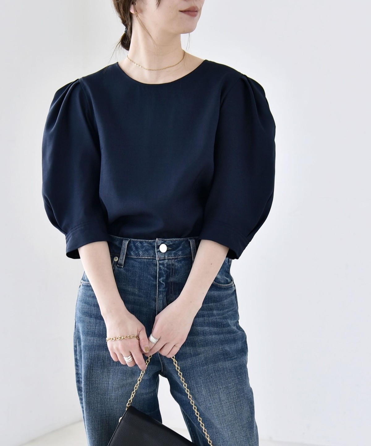 着心地:肌離れの良いドライタッチな質感。軽くさらっと着られます。ボリューム袖が存在感たっぷりで主役に。ボトムはシンプル合わせが◎