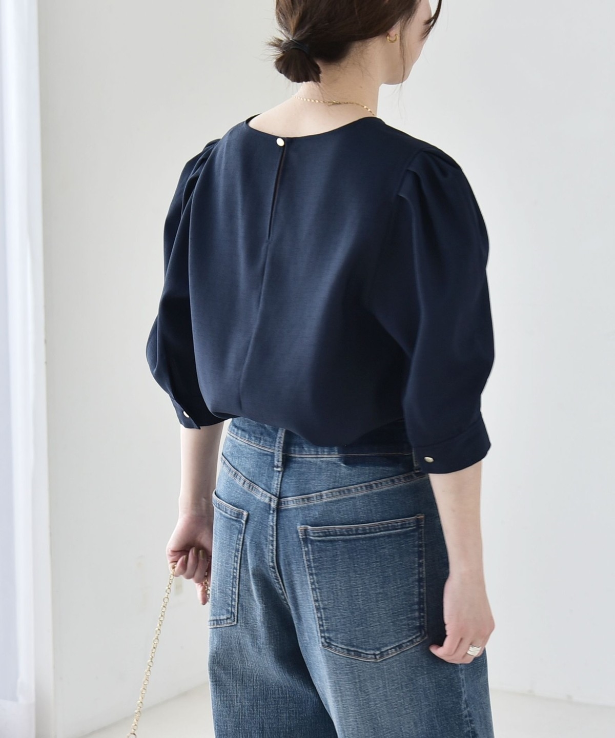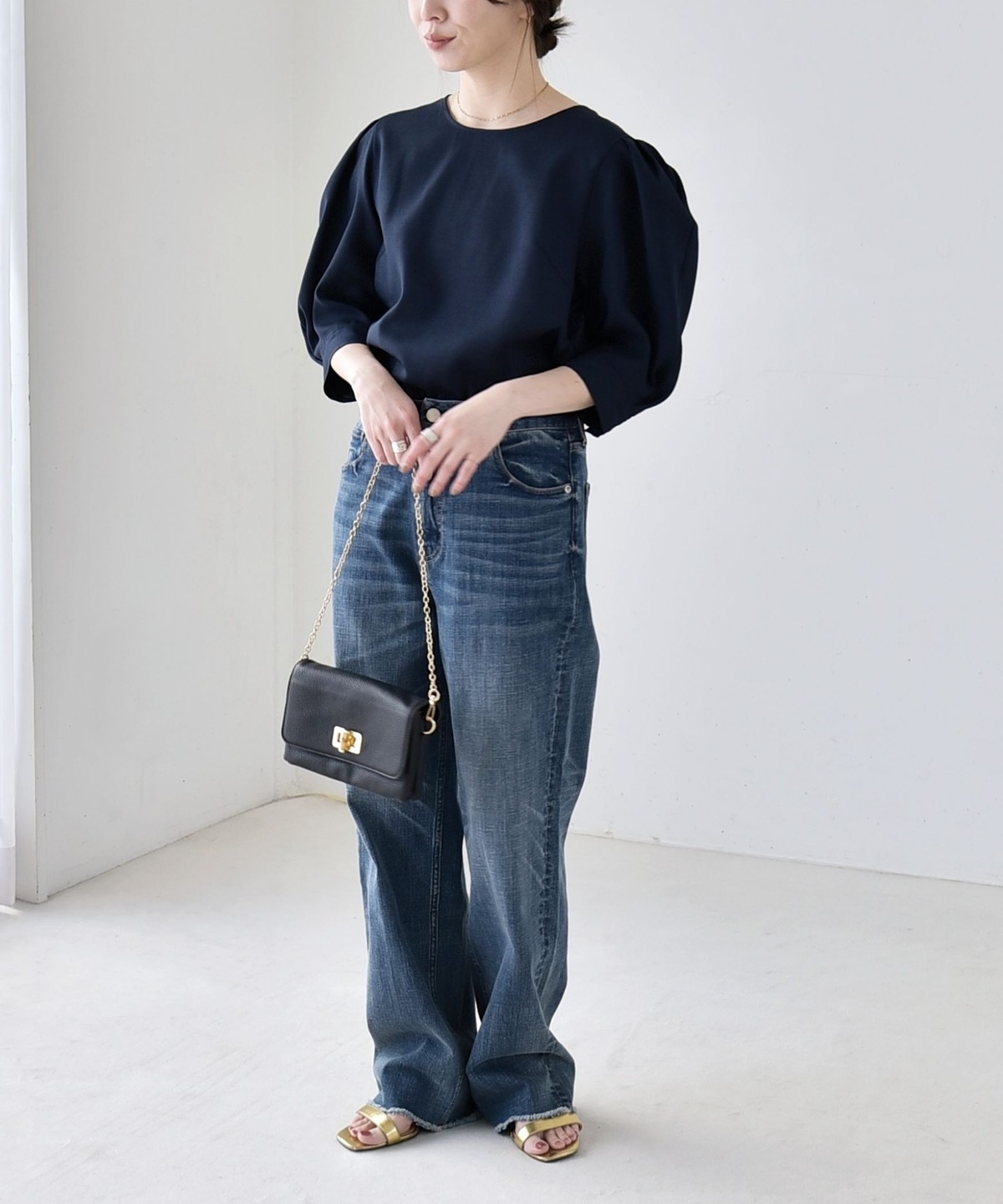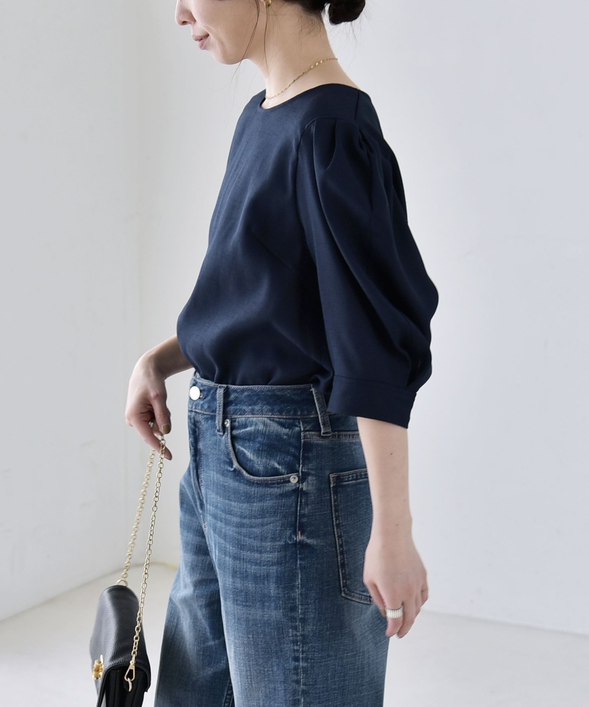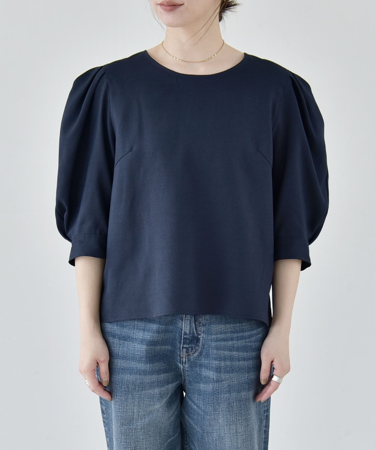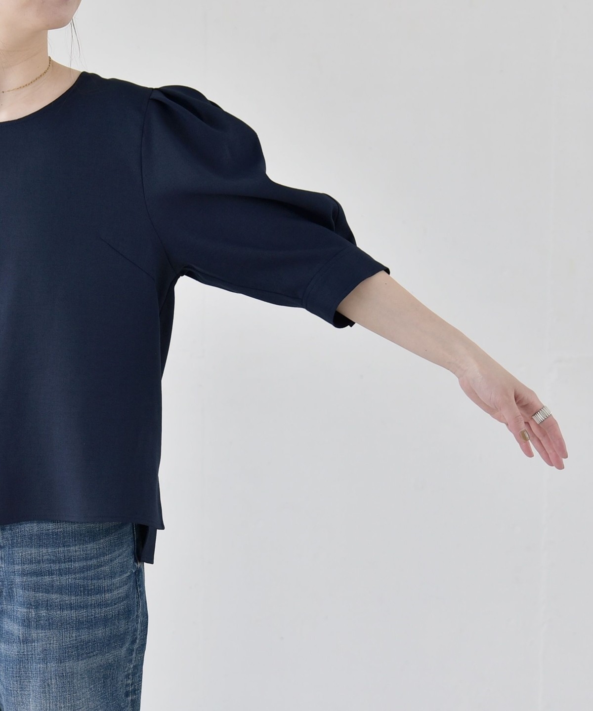 着心地:肌離れの良いドライタッチな質感。軽くさらっと着られます。ボリューム袖が存在感たっぷりで主役に。ボトムはシンプル合わせが◎
