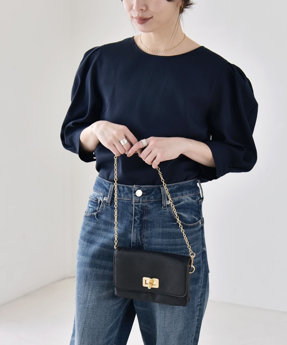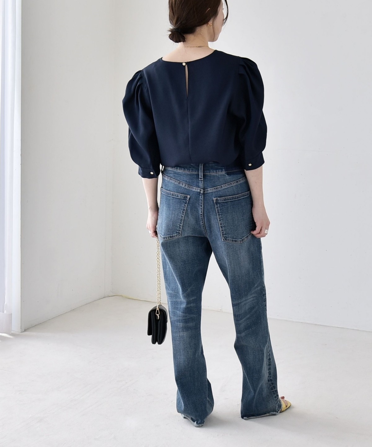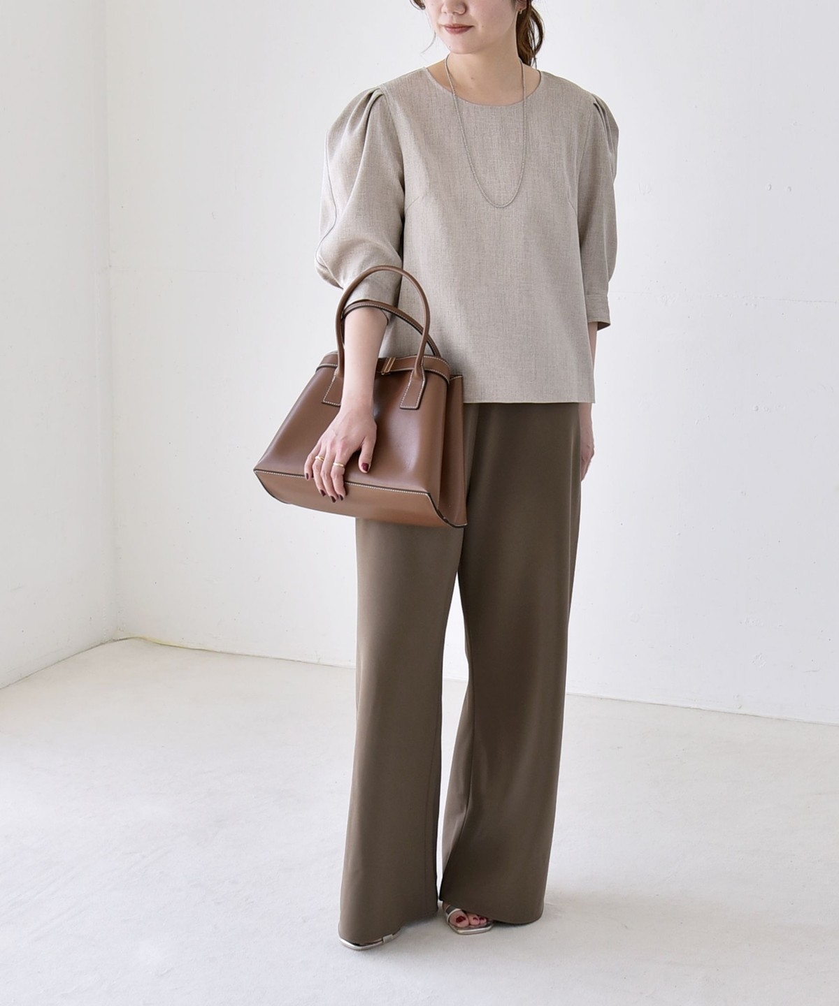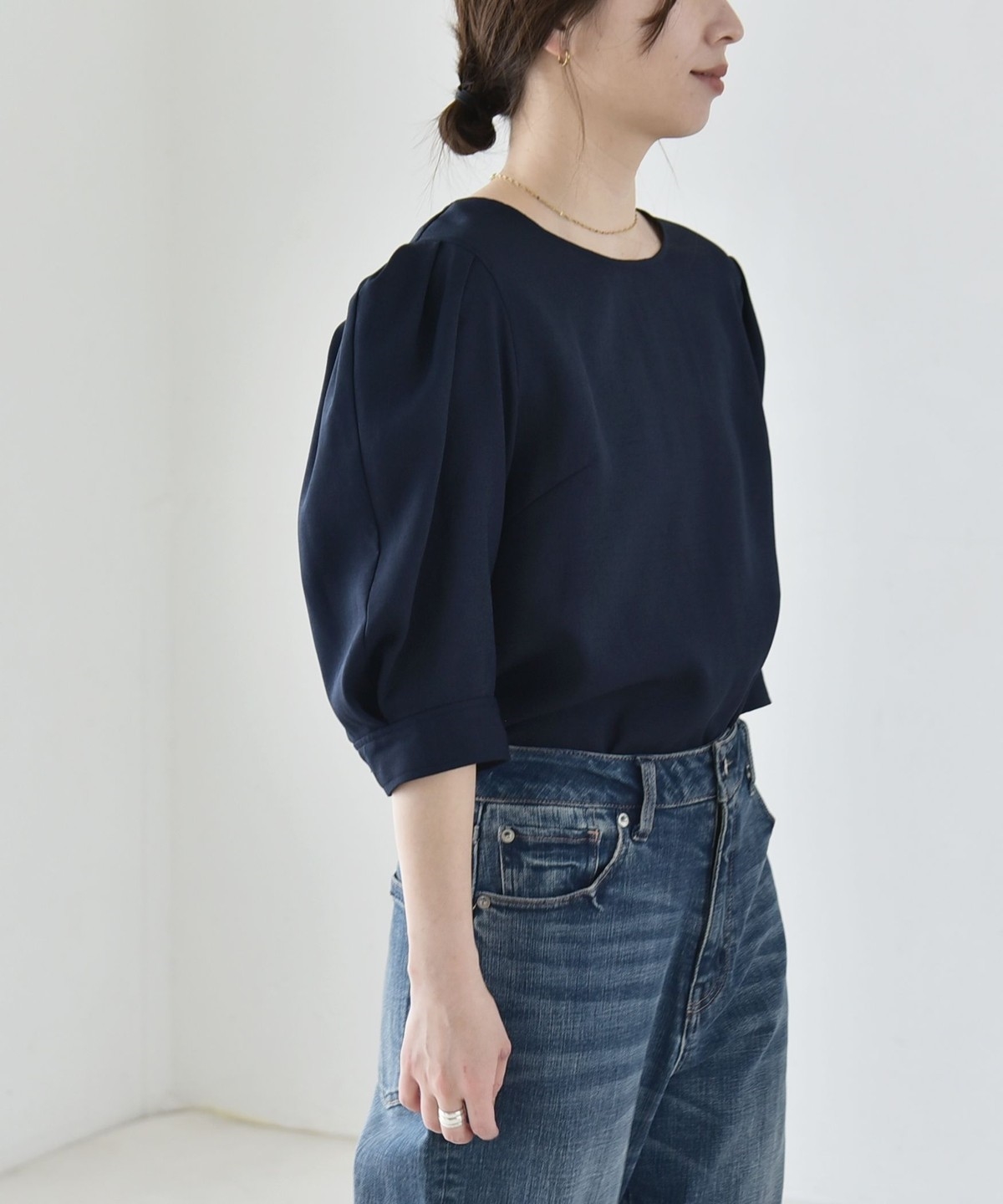 着心地:肌離れの良いドライタッチな質感。軽くさらっと着られます。ボリューム袖が存在感たっぷりで主役に。ボトムはシンプル合わせが◎