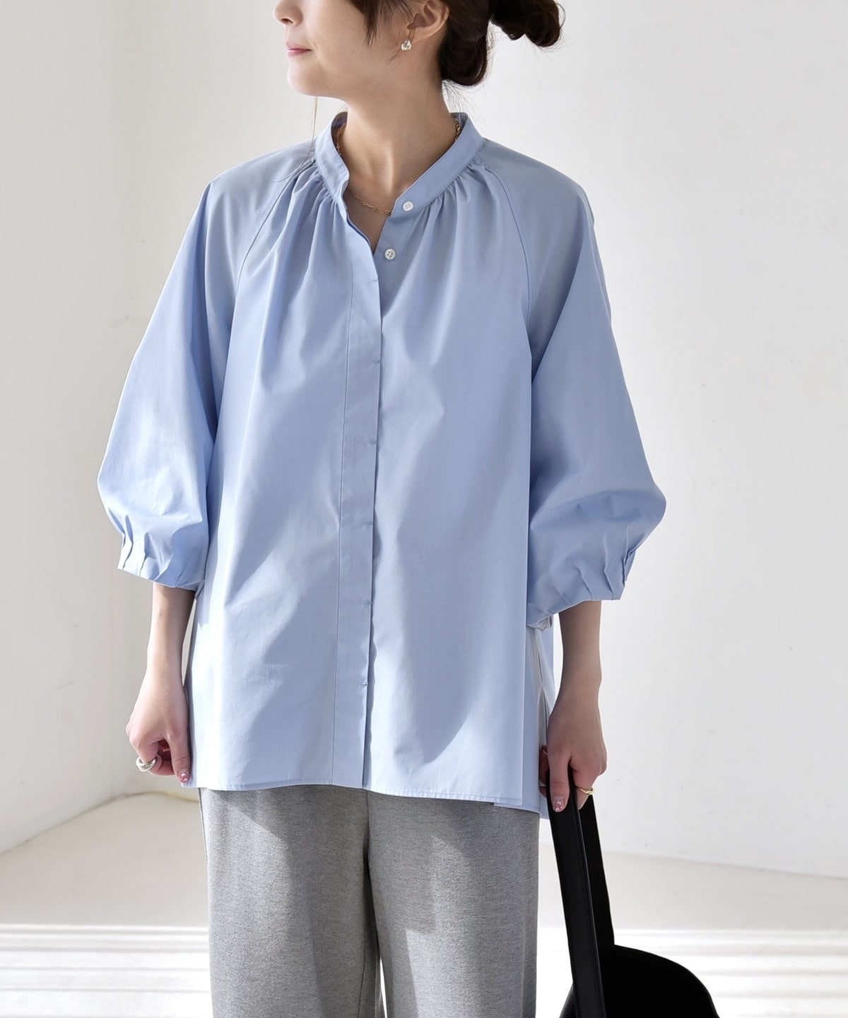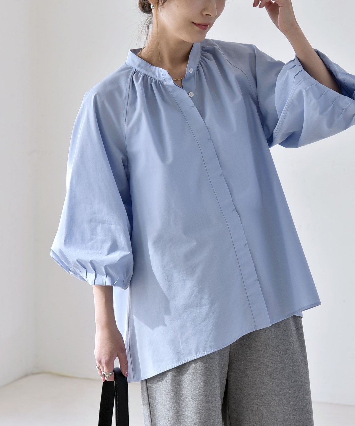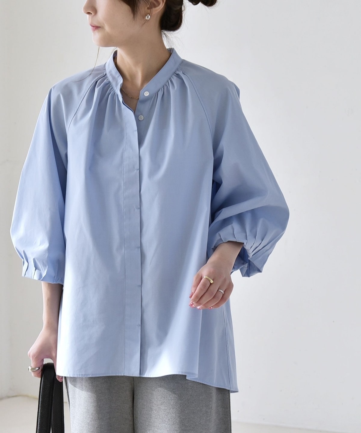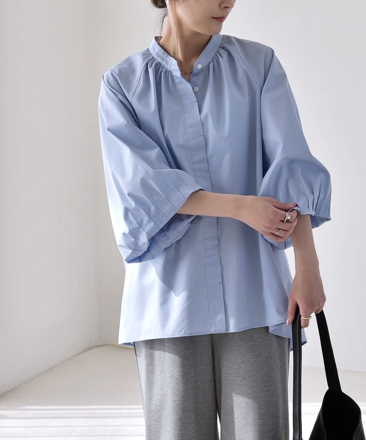 《一部予約》quaranciel:〈洗濯機可能〉REPREVE バンドカラー ギャザー パフ シャツ ブラウス