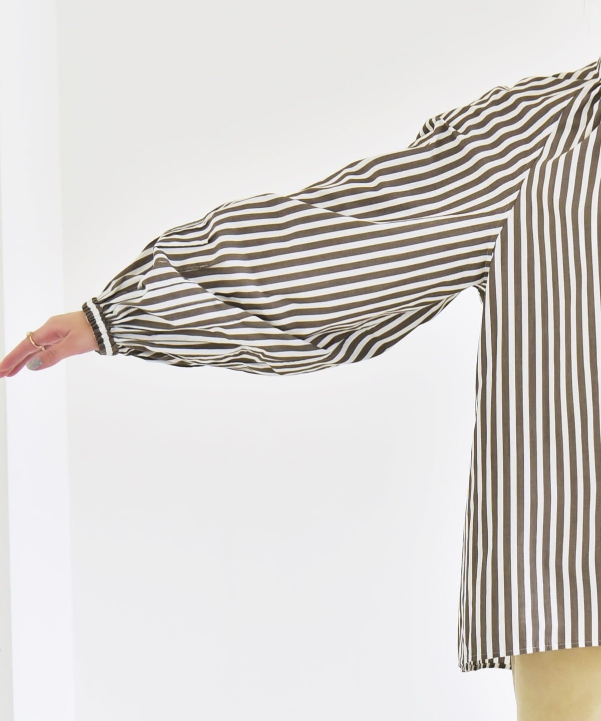 たっぷりとしたボリュームスリーブが可愛いバンドカラーシャツ。