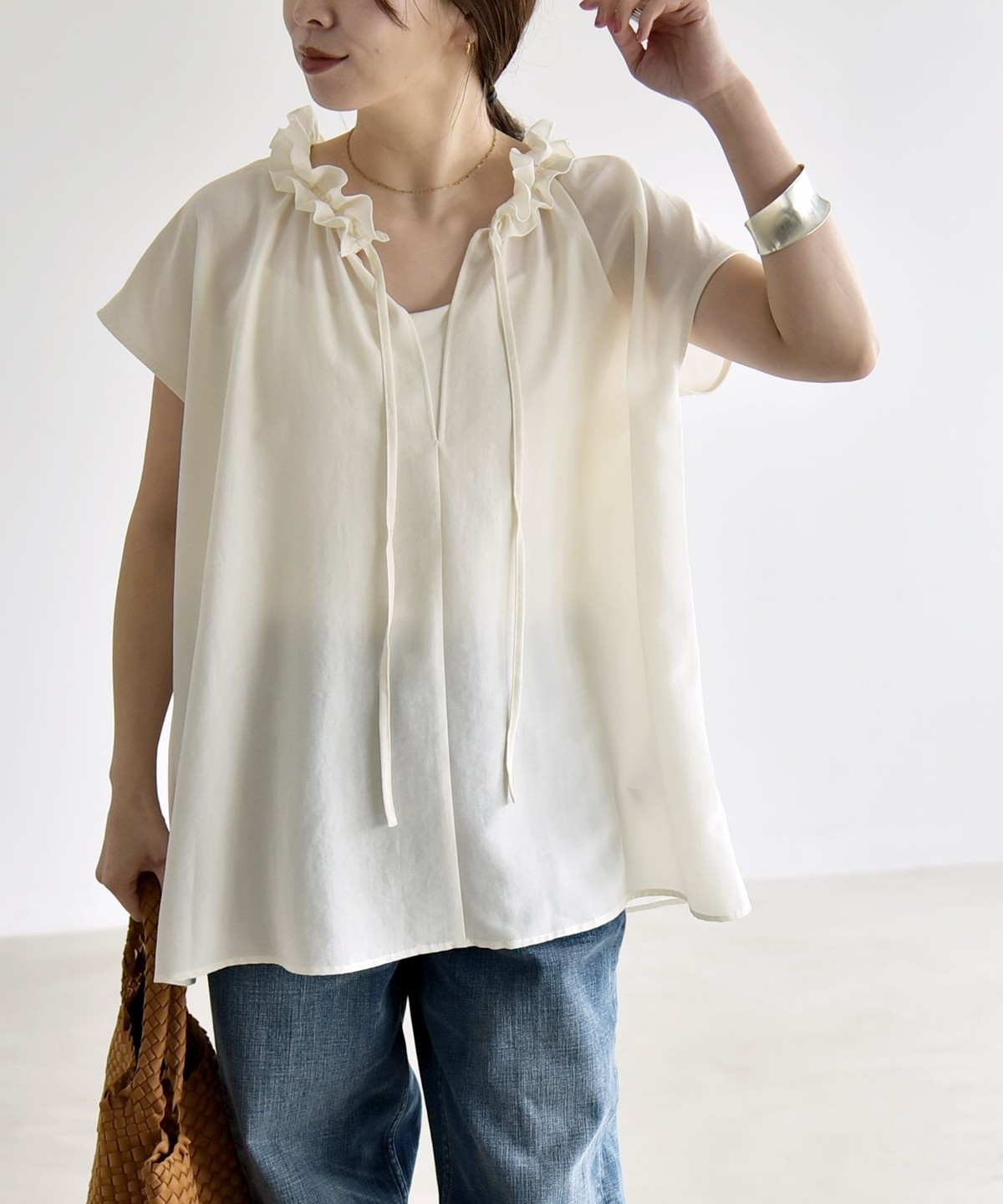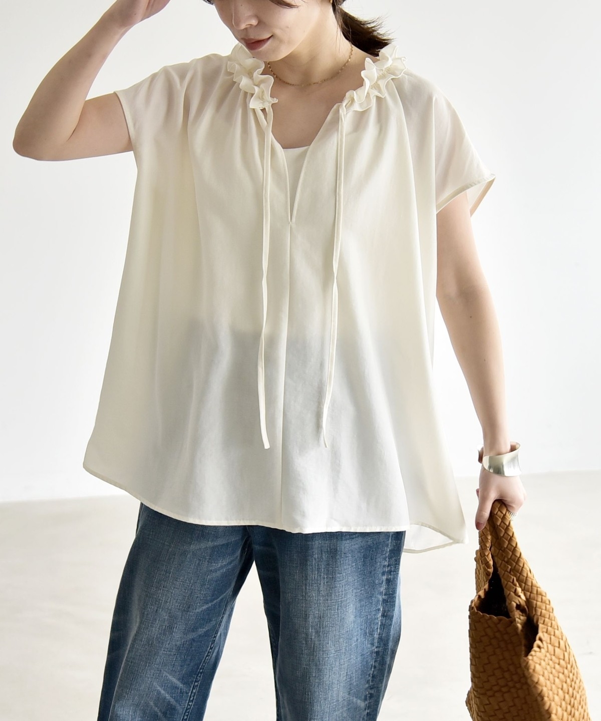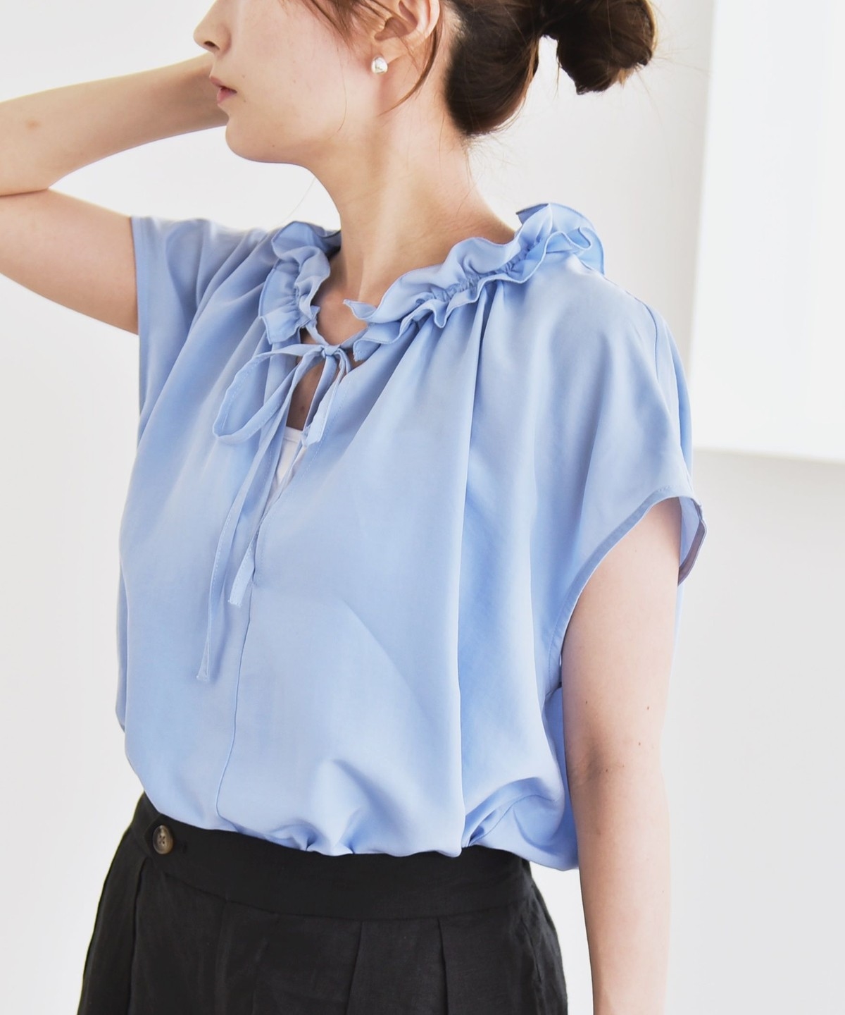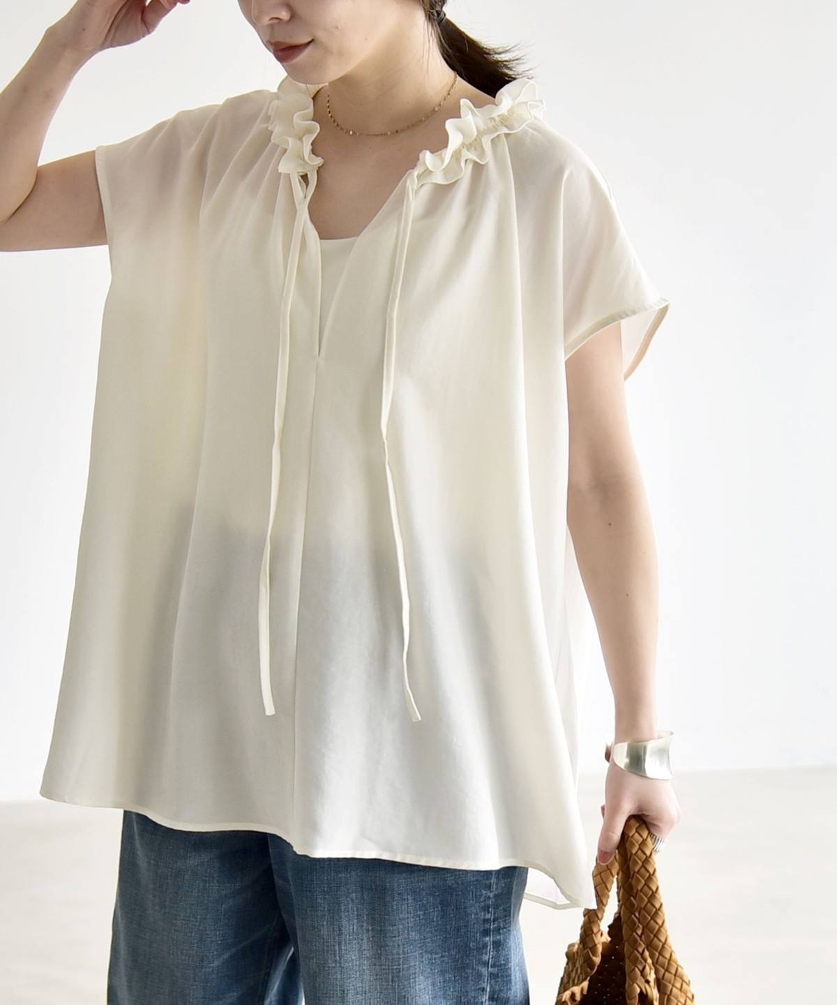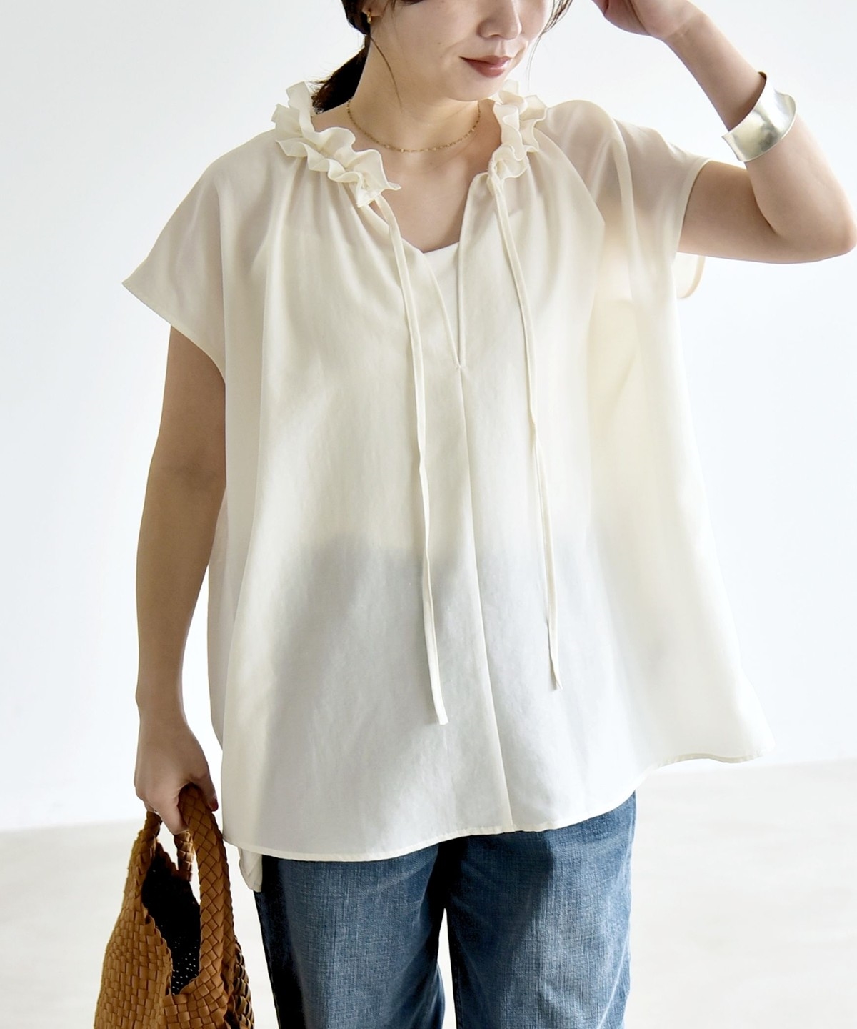 とろみ素材とフリルディテールが、大人フェミニンな主役ブラウス