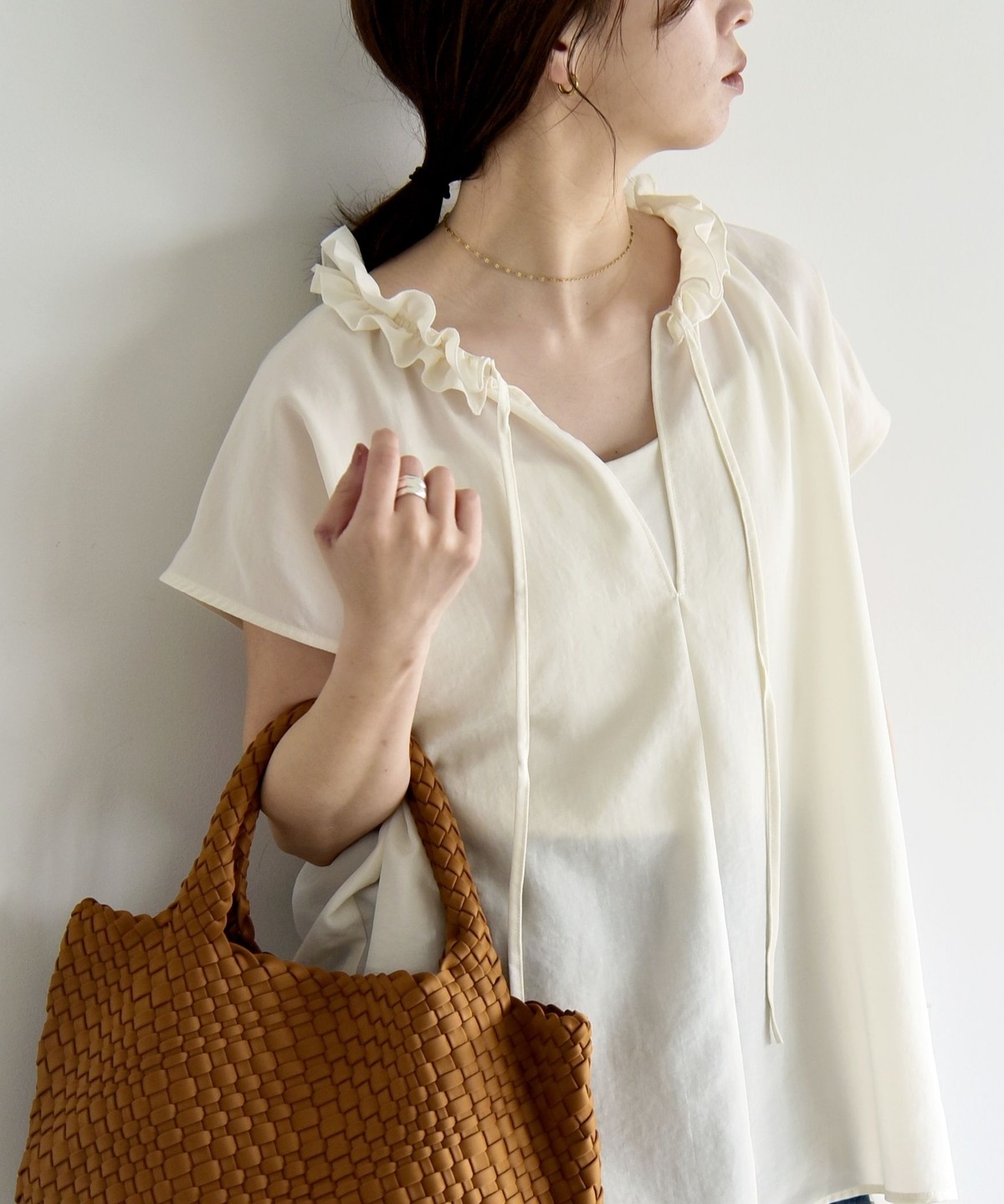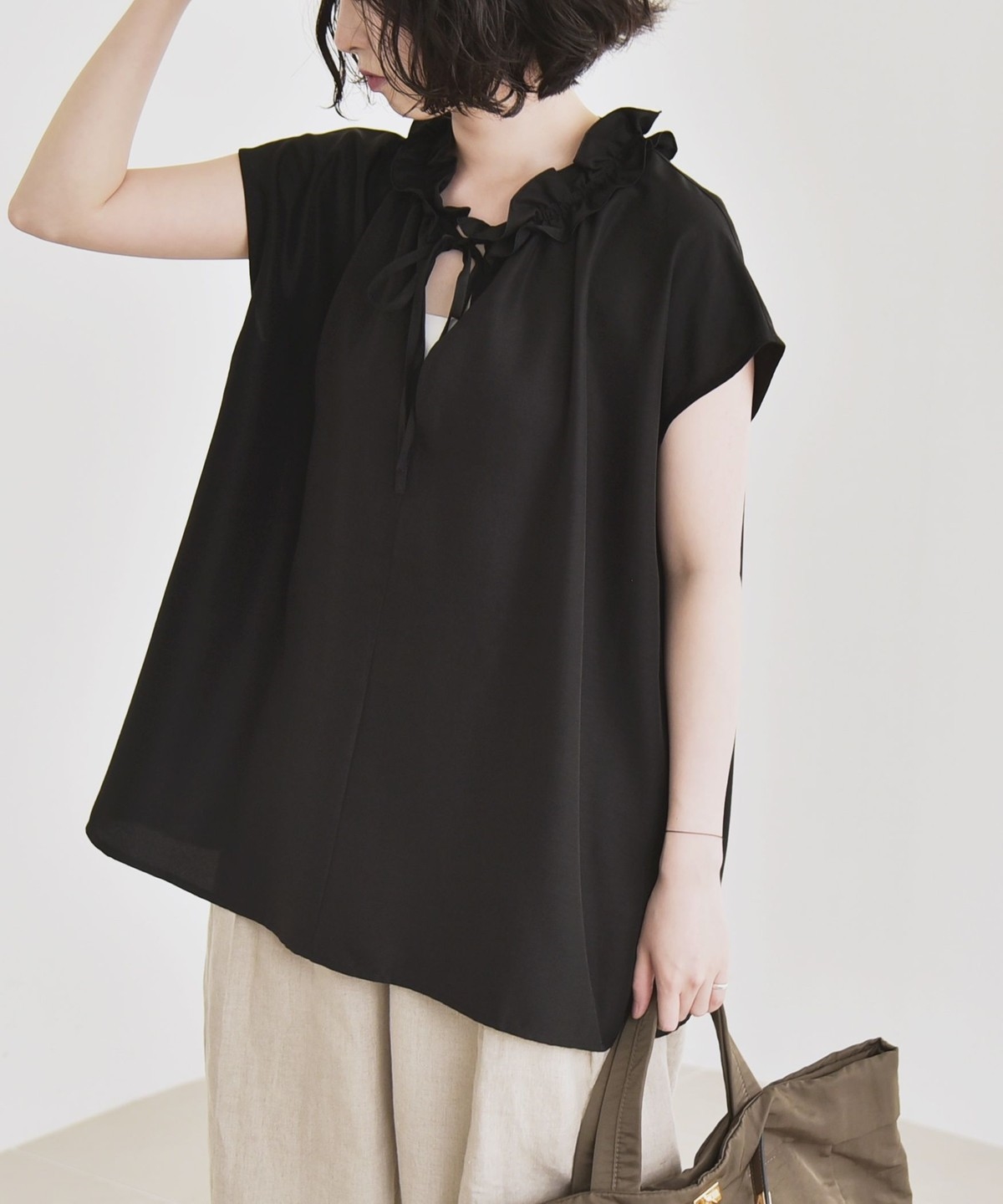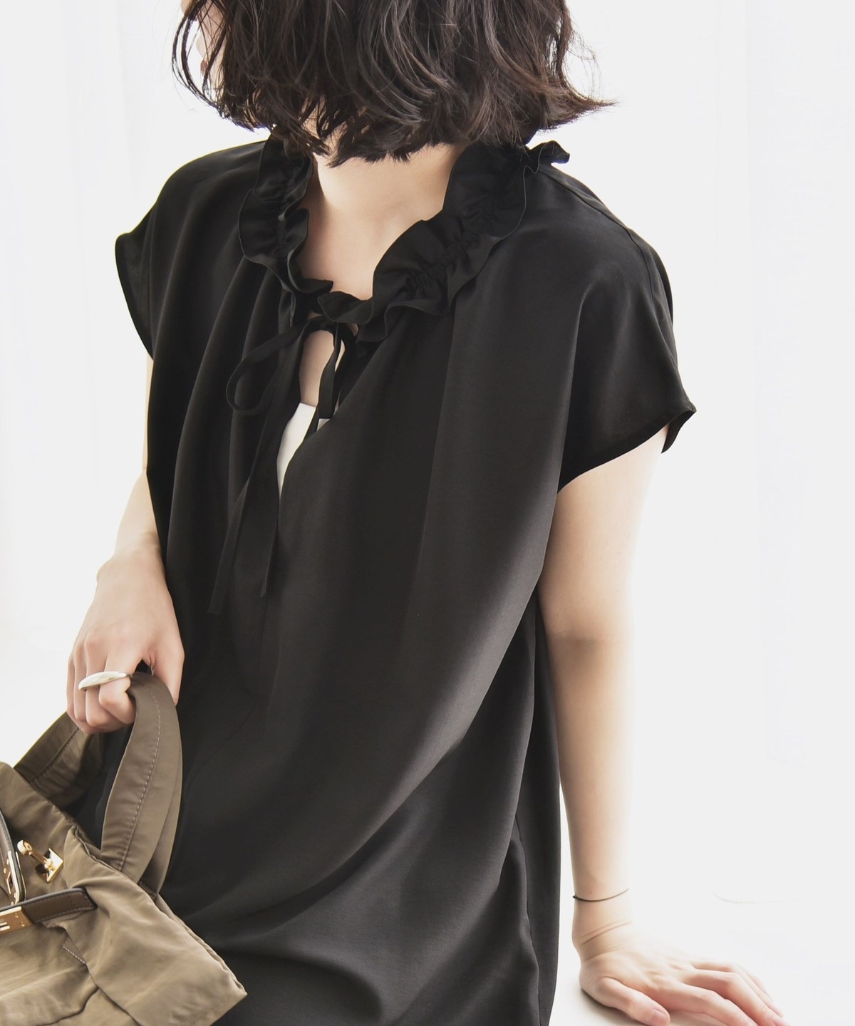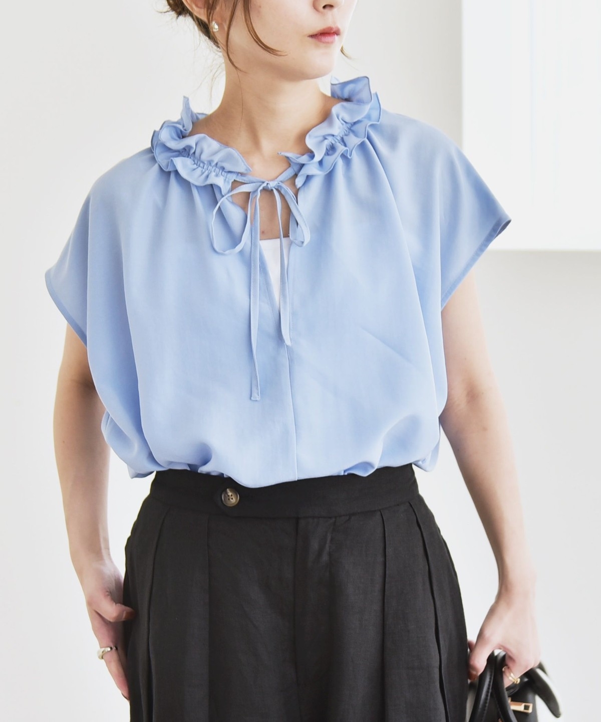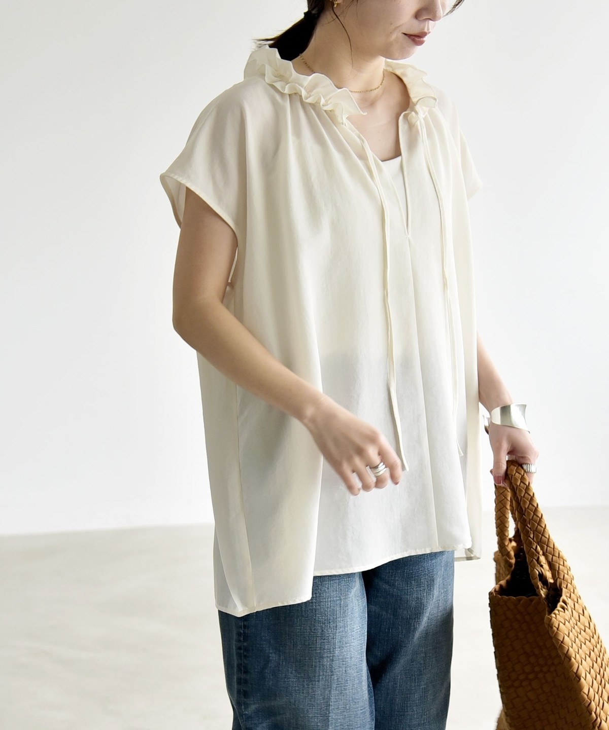 とろみ素材とフリルディテールが、大人フェミニンな主役ブラウス