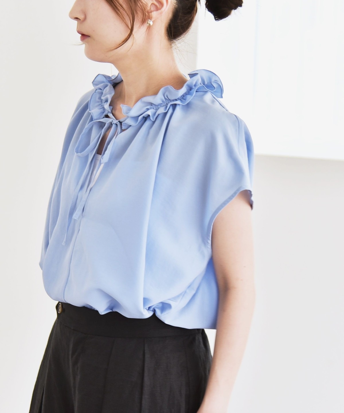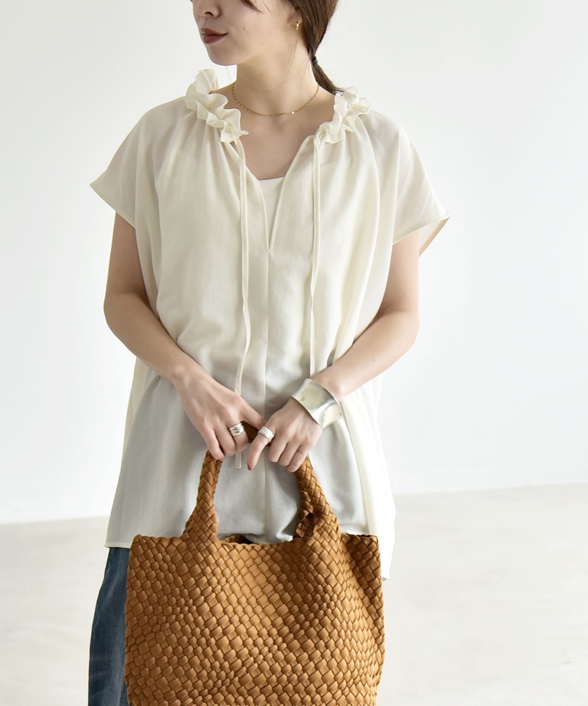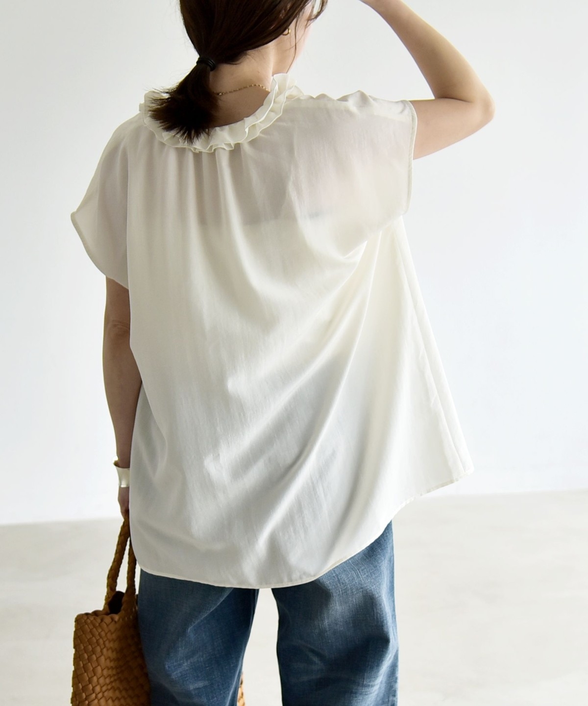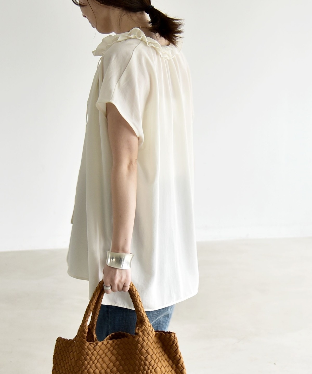 とろみ素材とフリルディテールが、大人フェミニンな主役ブラウス