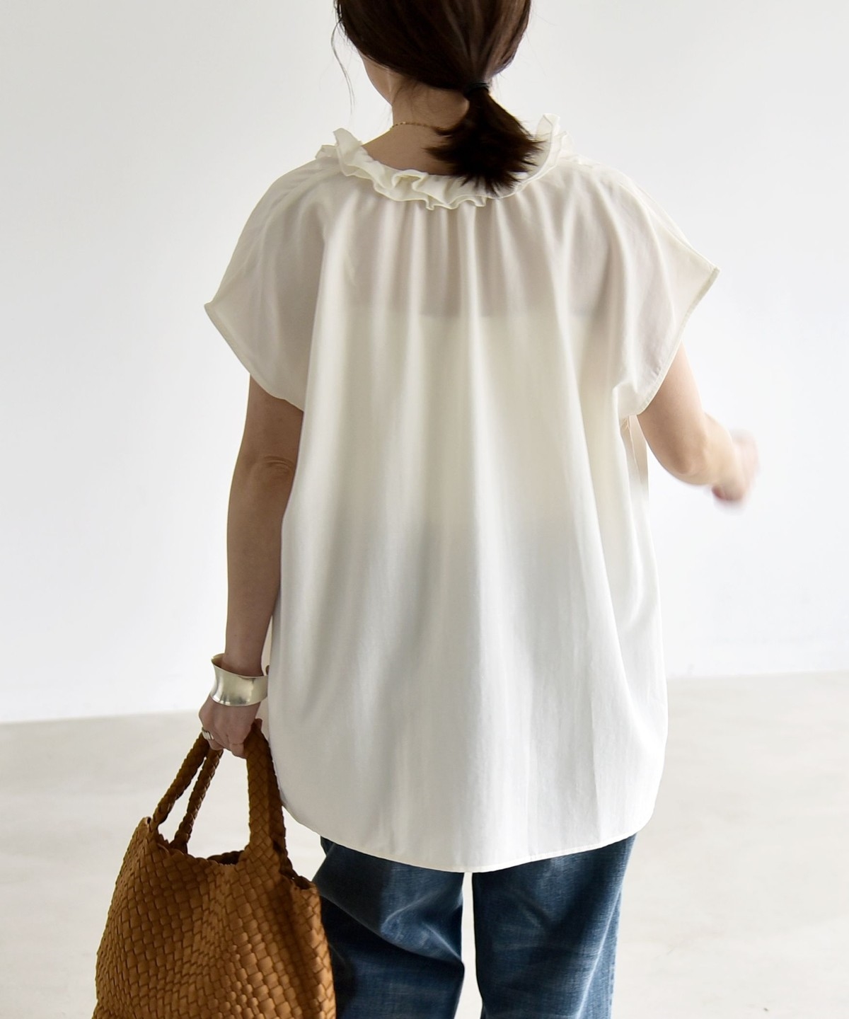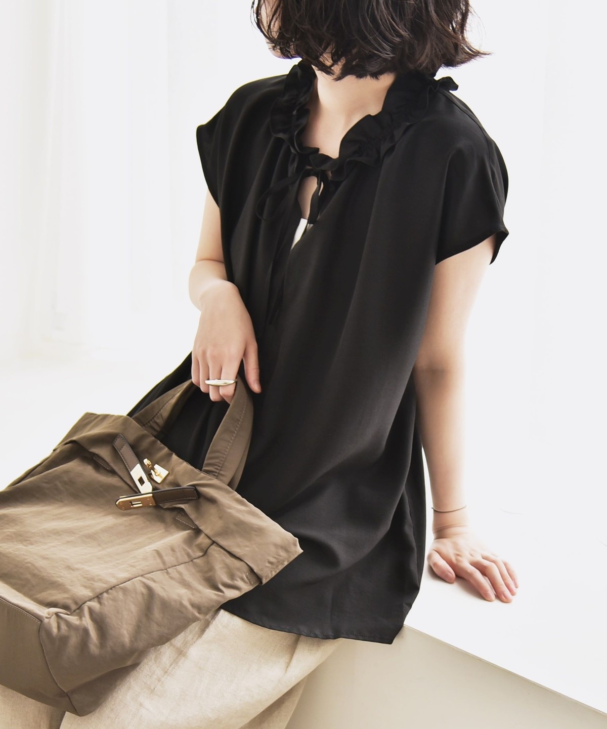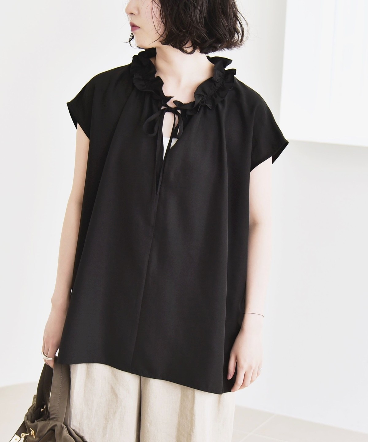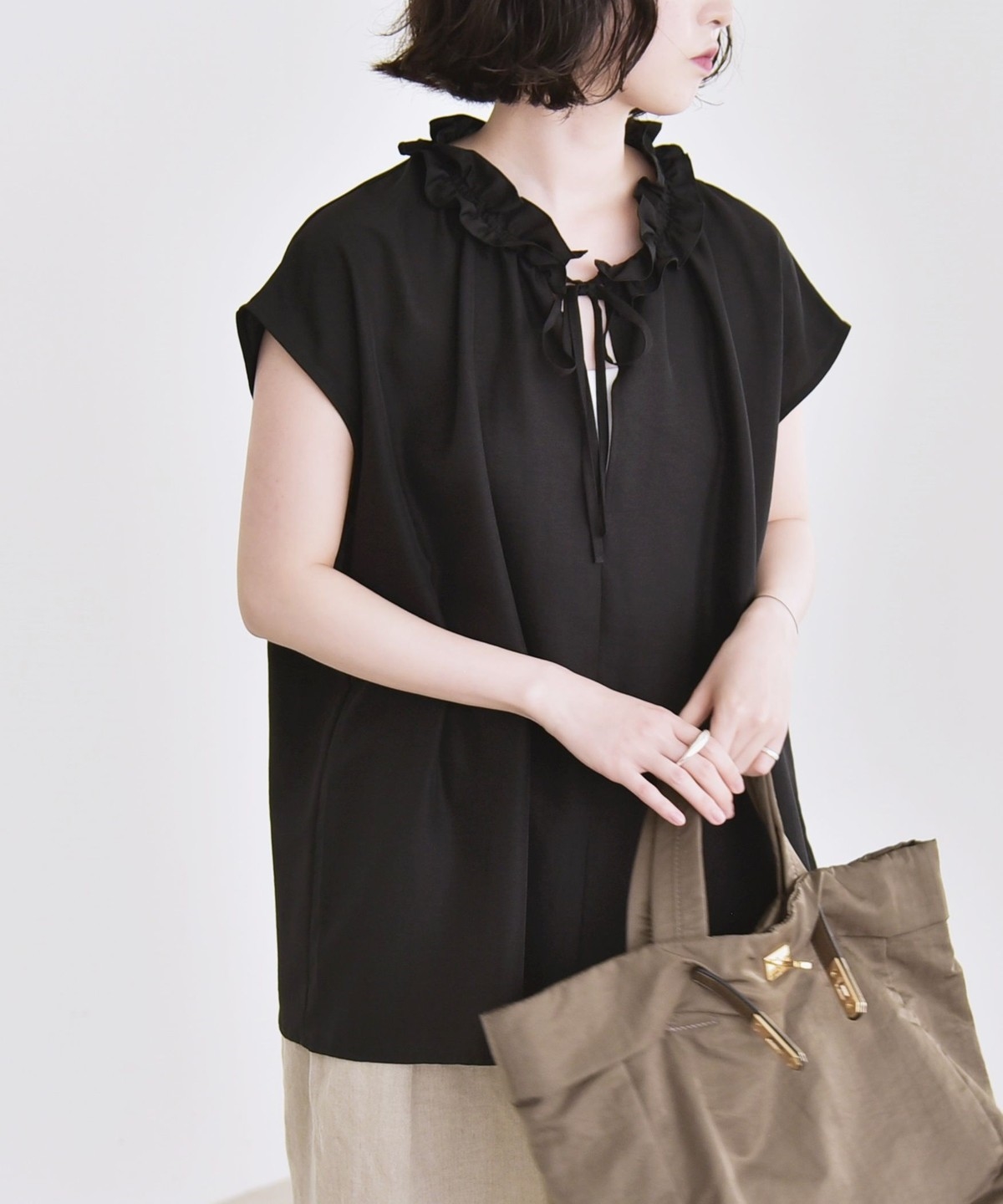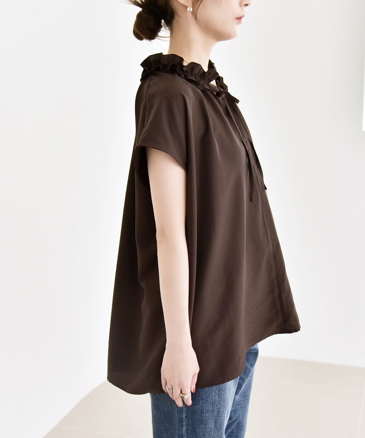 とろみ素材とフリルディテールが、大人フェミニンな主役ブラウス