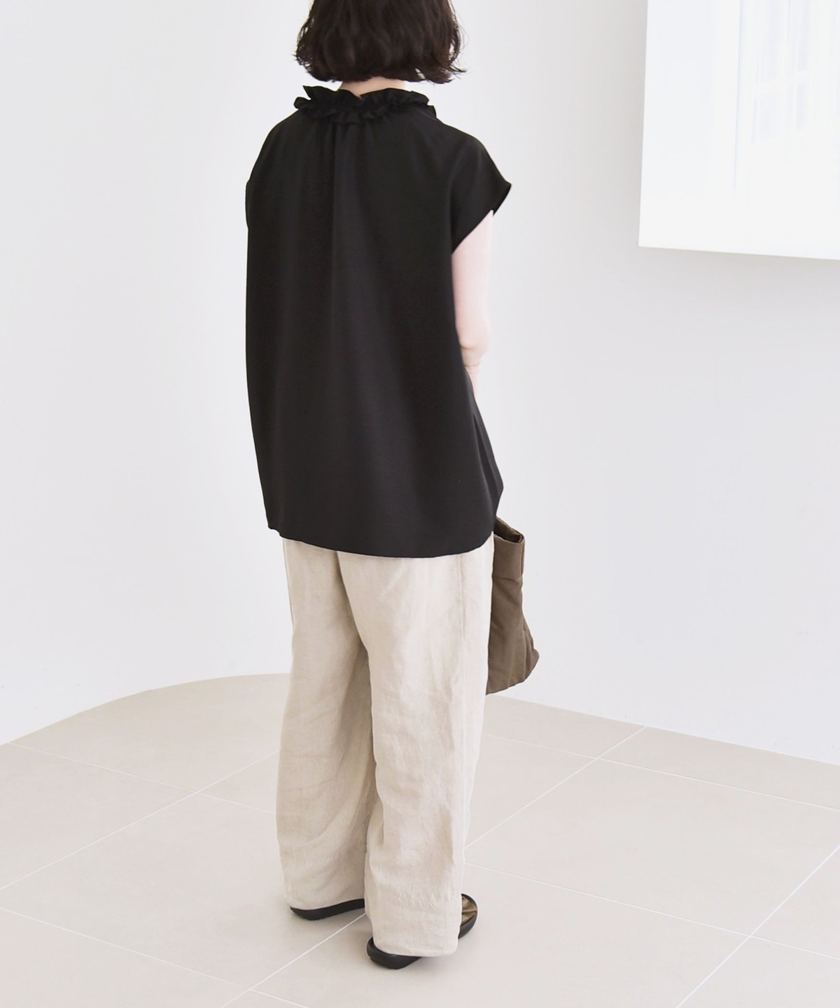 柔らかな軽めの素材なので、ボトムにタックインもしやすく、フロントだけインしてももたつきません◎