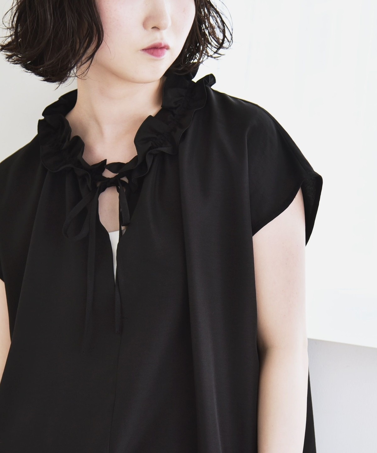 リボンを垂らして首元を開けた抜け感を出しても、きゅっと結んでフリルを強調しても素敵です。