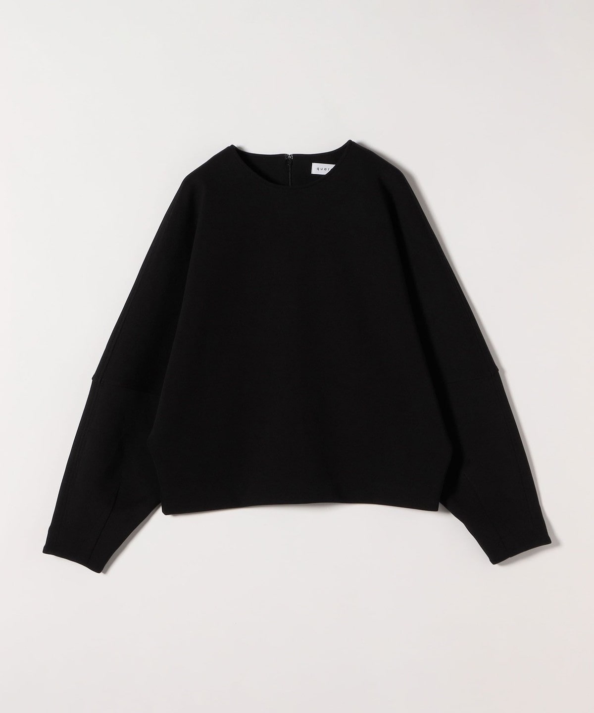コンパクトなクルーネックと着丈、変形のドロップショルダーで、ラフすぎず女性らしい印象に。