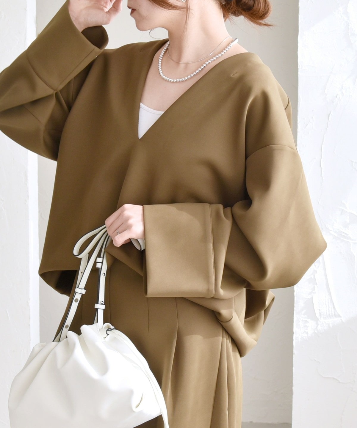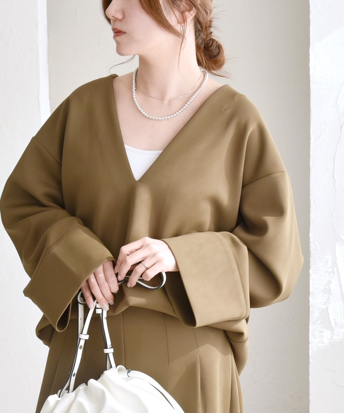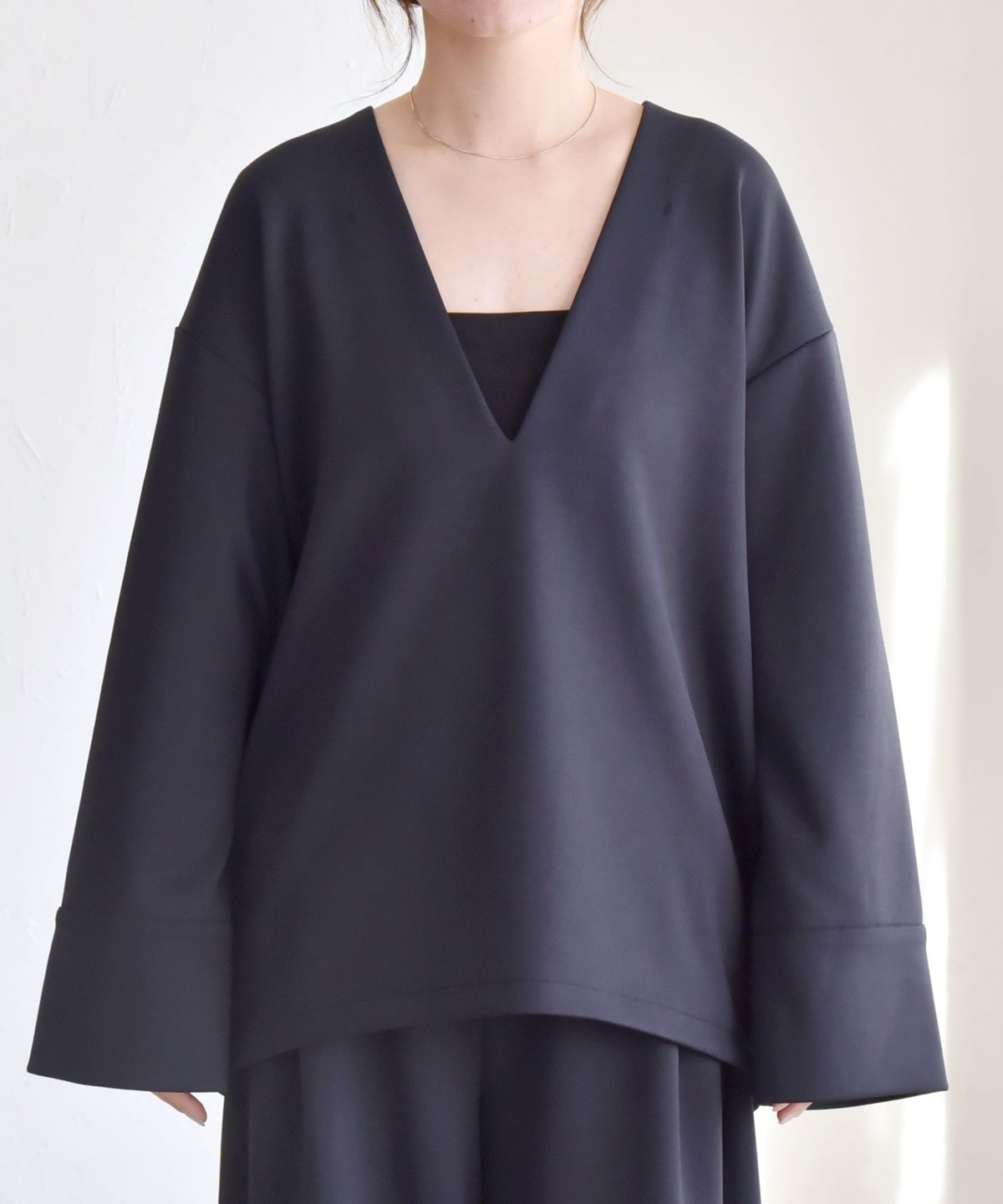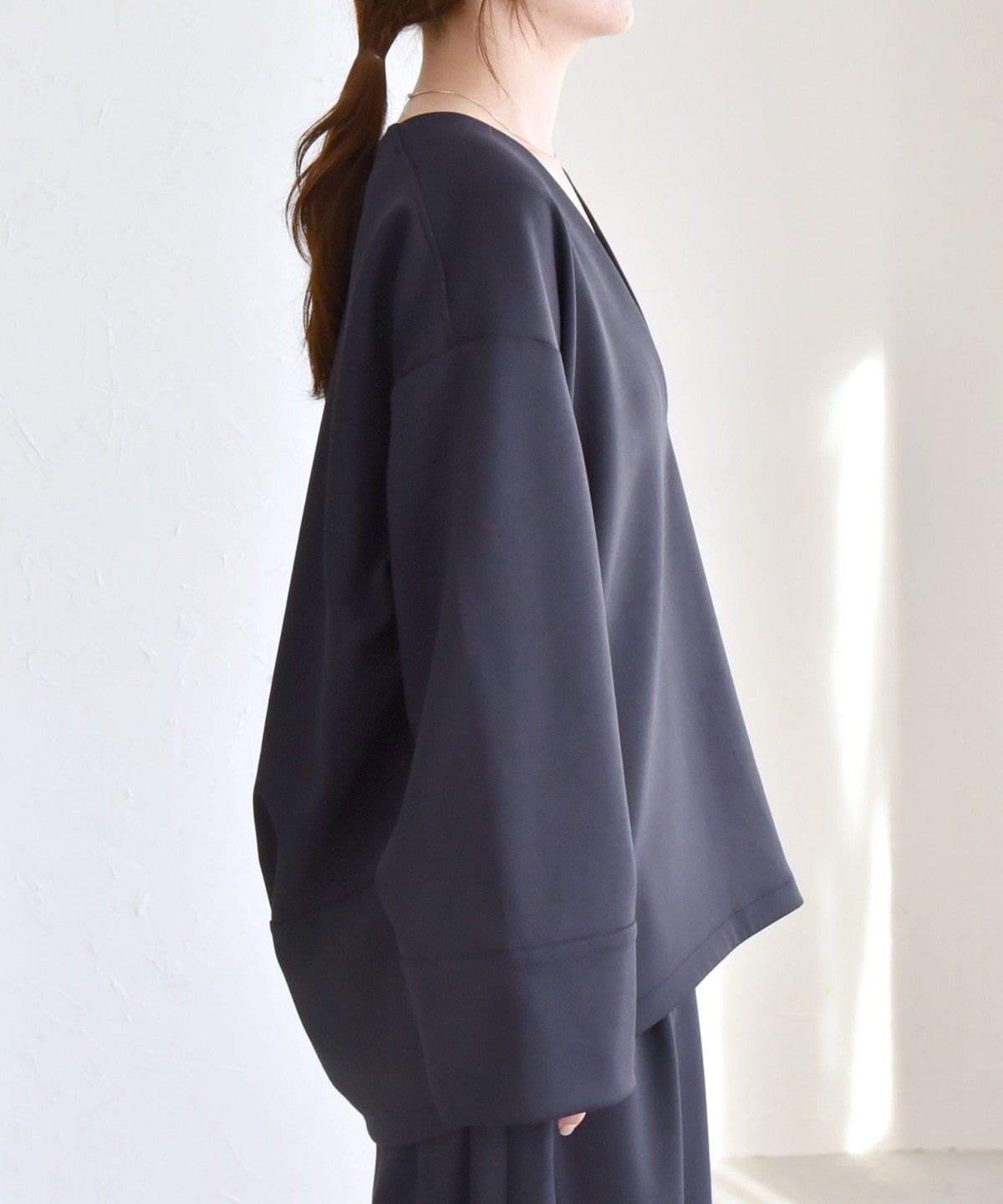 バックスタイルのコクーンシルエットがポイントのVネックプルオーバー。