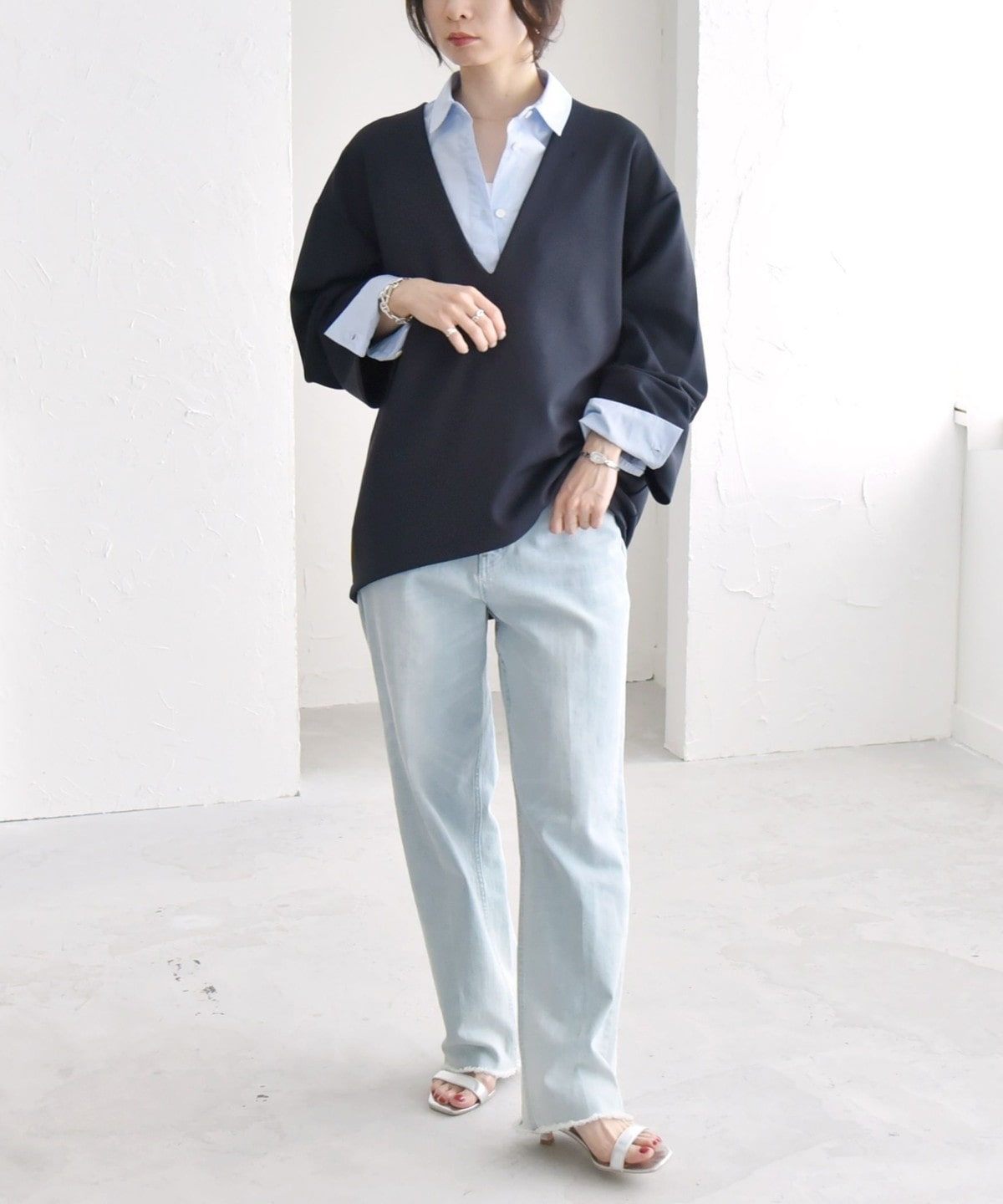 深めのVネックや広めの袖口、やや大き目のシルエットで、着るだけで抜け感が出てオシャレな印象に。