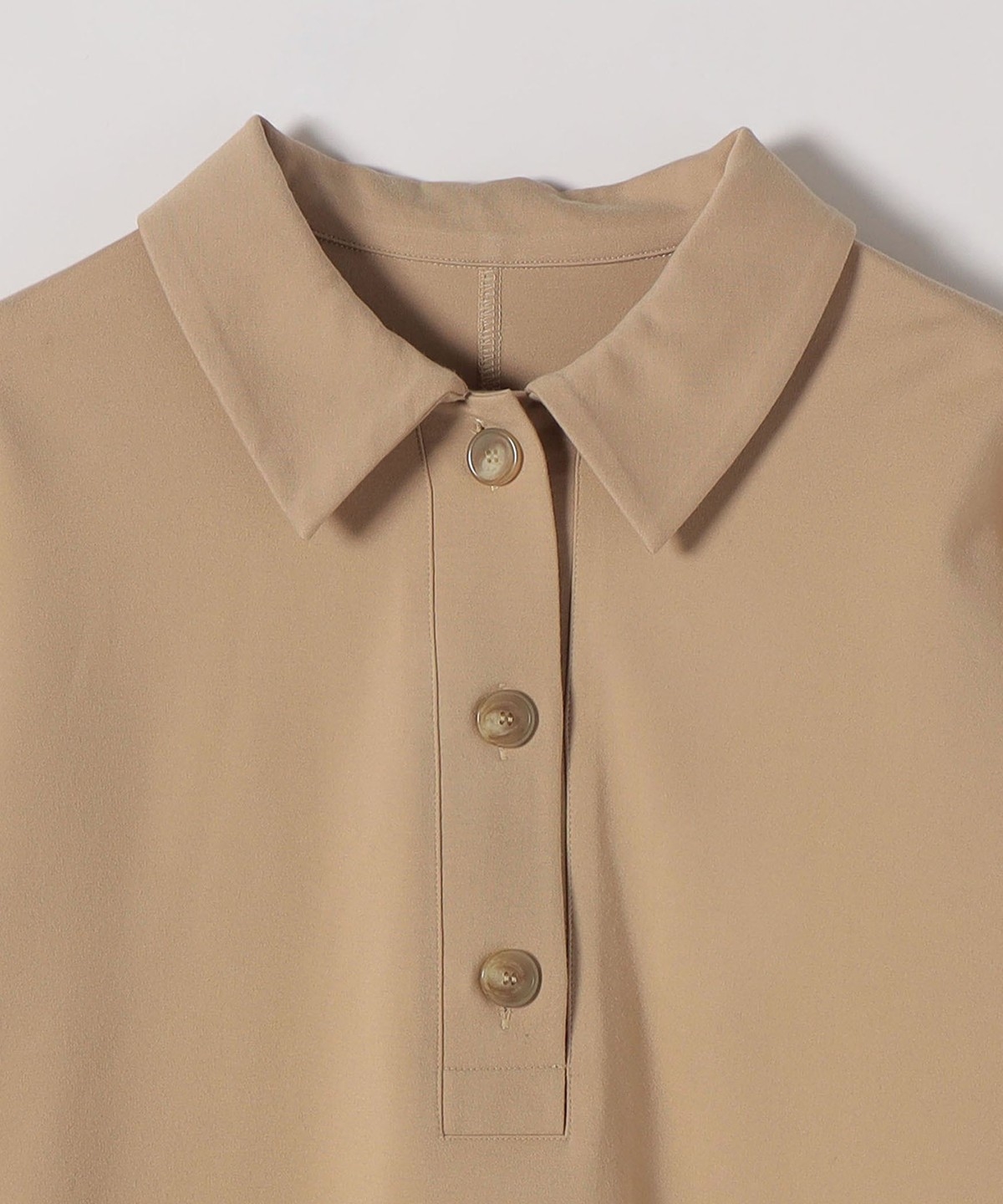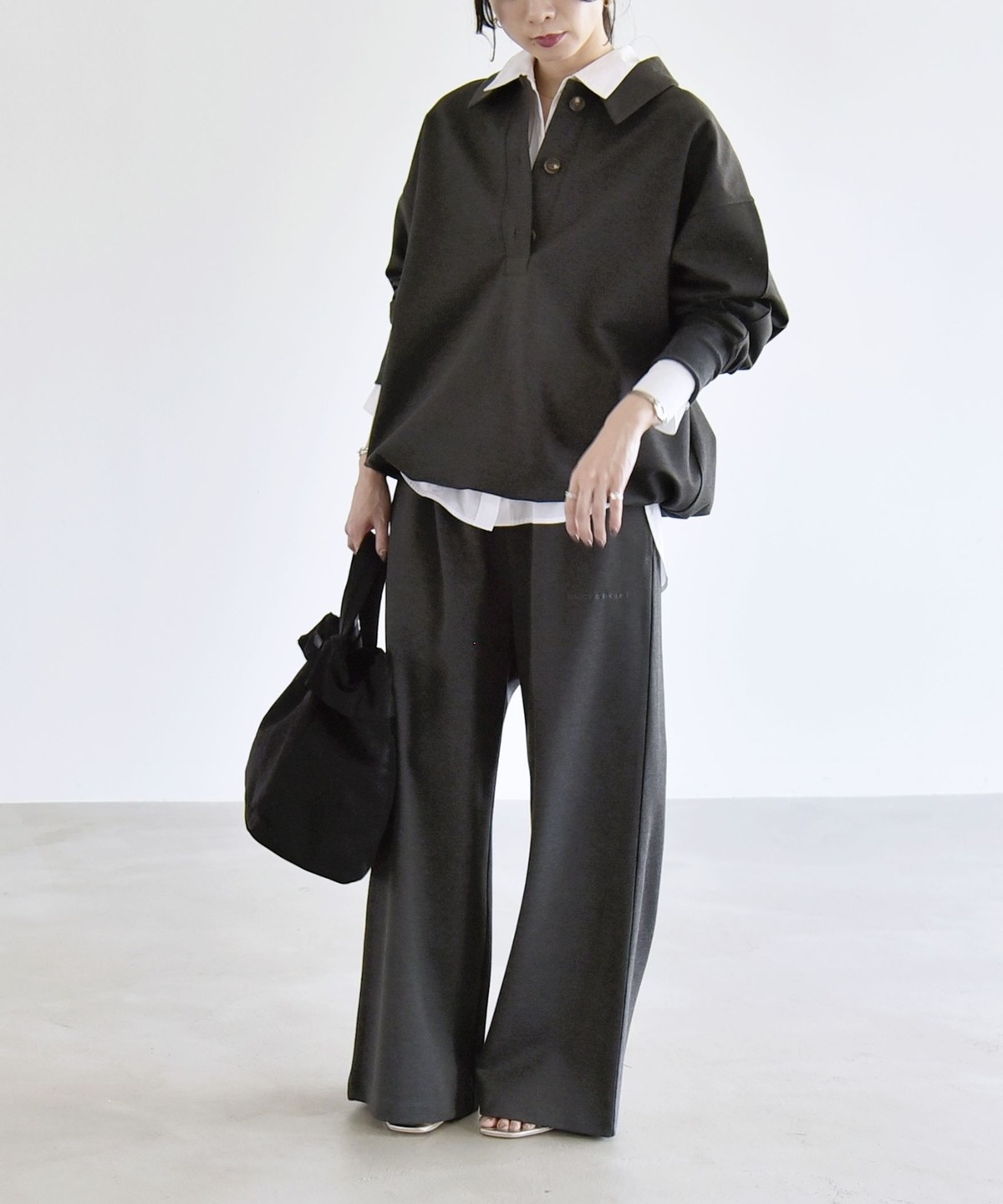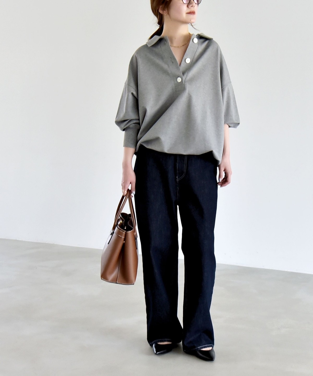 太めのポロ襟と大きめのボタンがアクセントとなり、シンプルなデザインながらもモードな印象に。