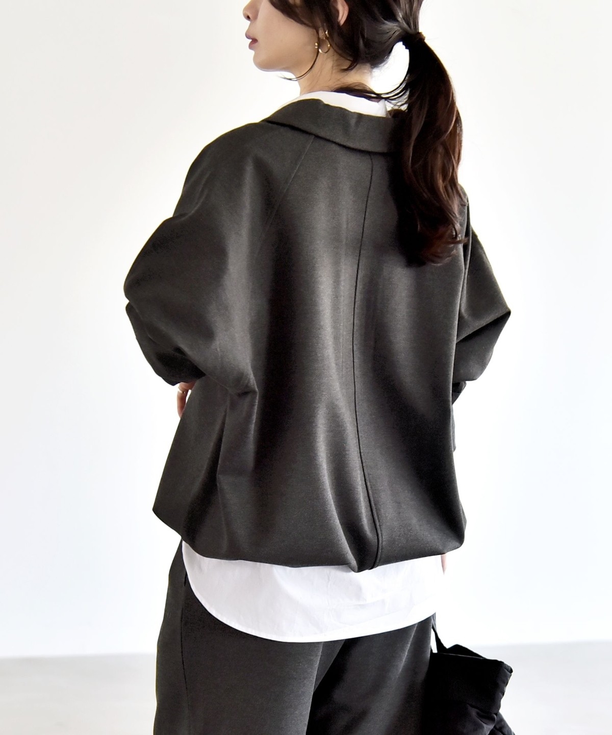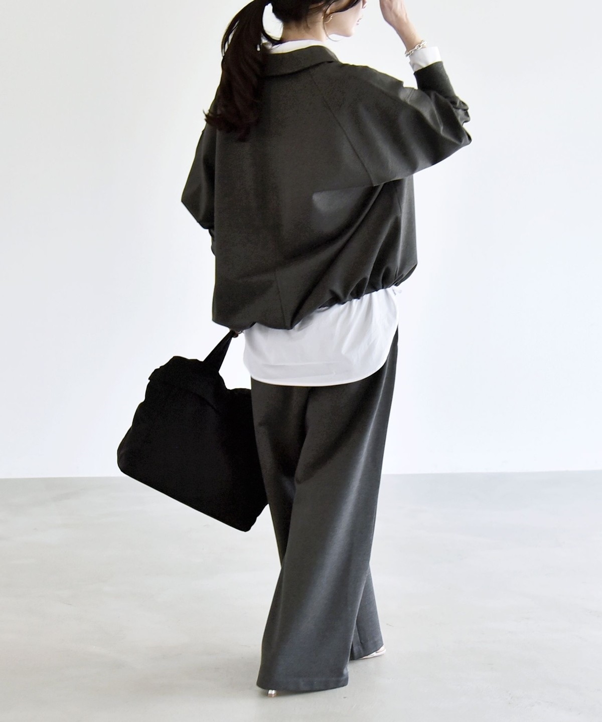 同素材のパンツと合わせたセットアップスタイルで、クリーンな印象に。