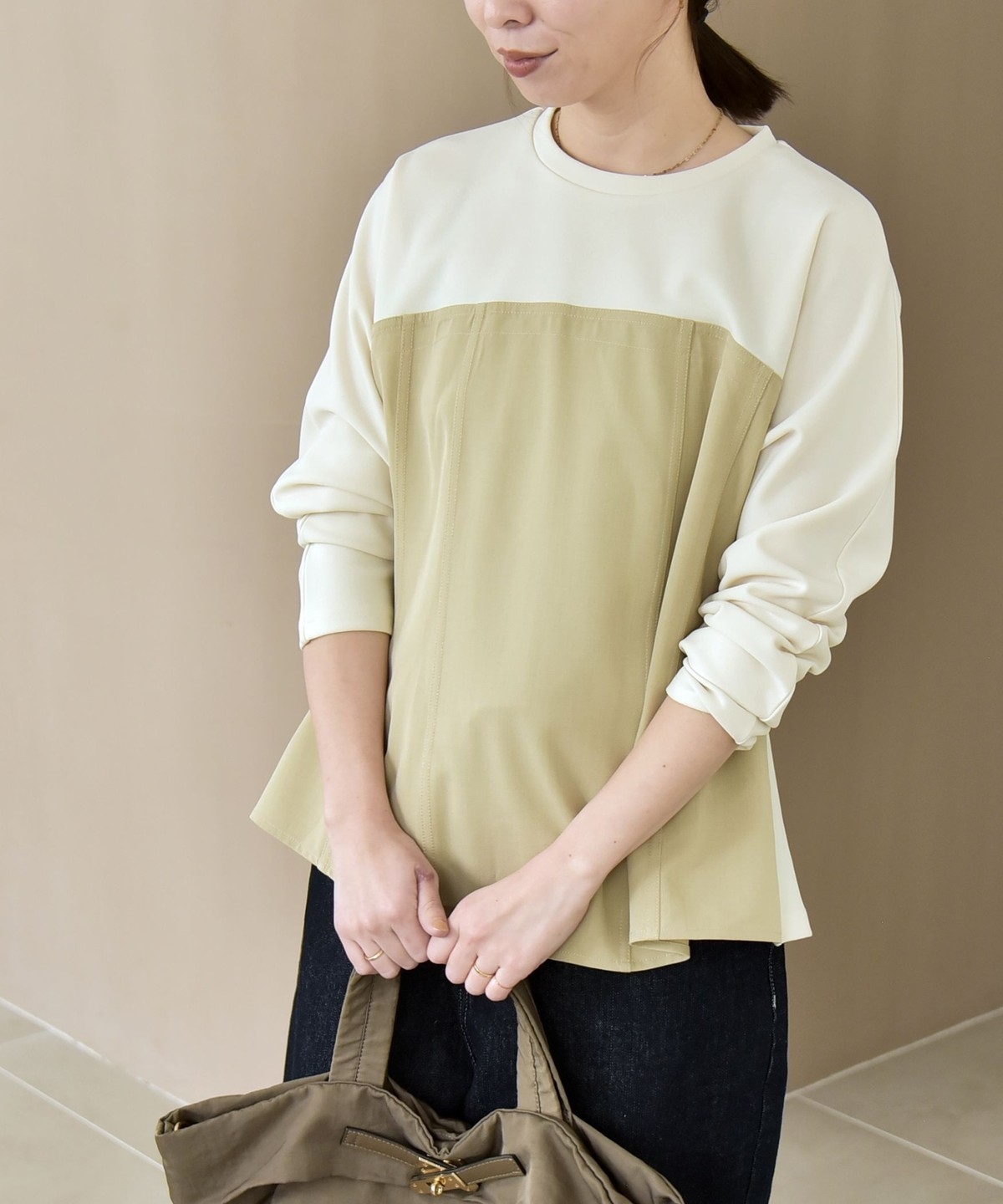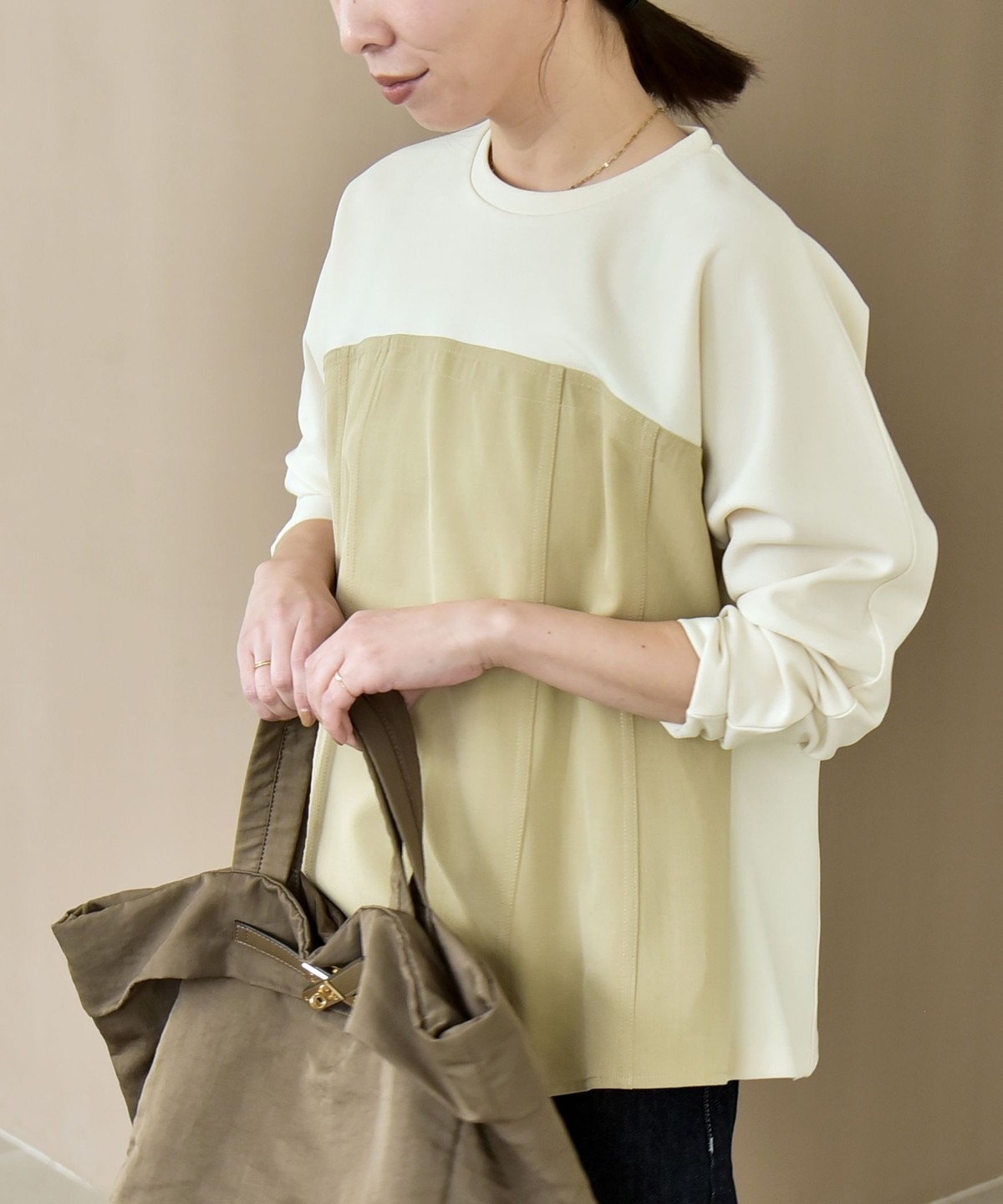 ジャージー素材と布帛のコンビデザインがポイントのプルオーバー。