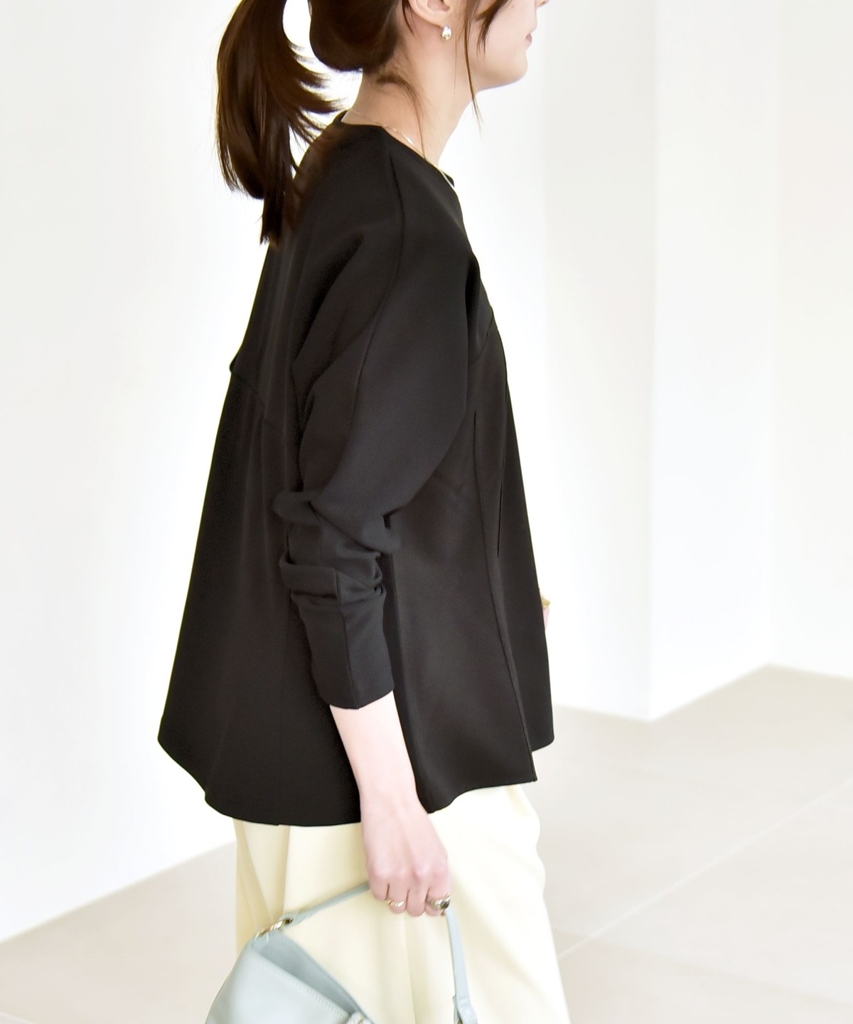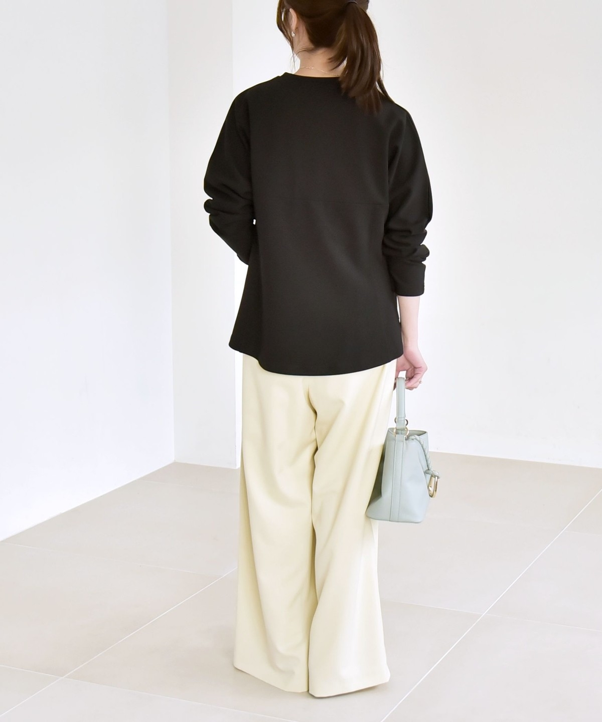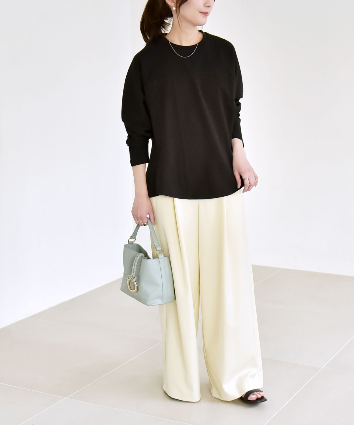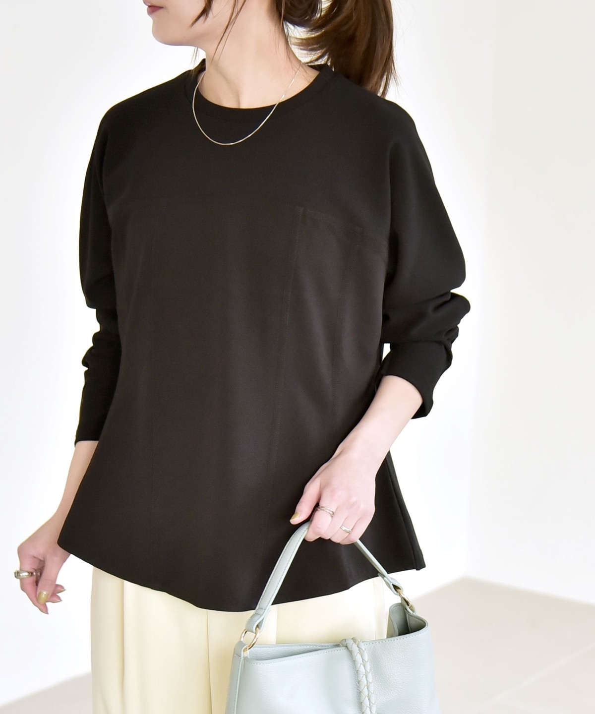 首元はシンプルなクルーネックなので、アクセサリーも合わせやすくて◎