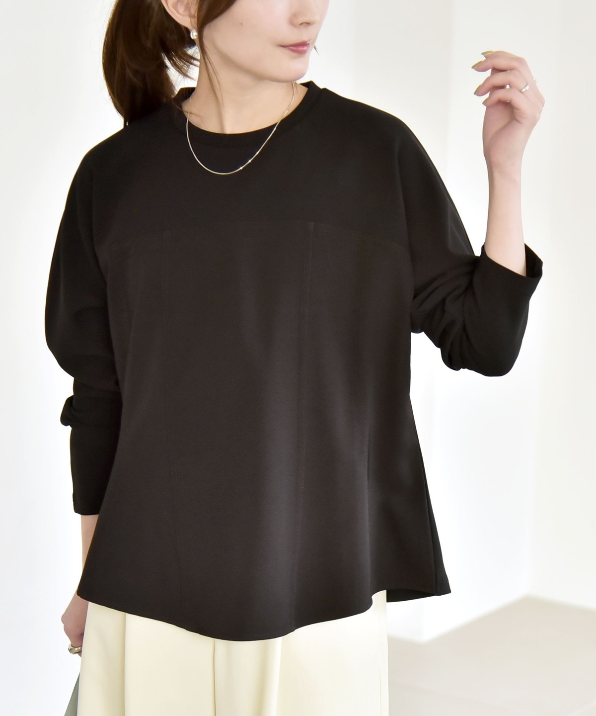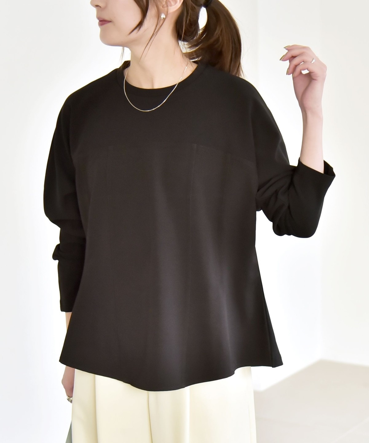 伸縮性のある素材でリラクシーな着心地ながら綺麗見えし、オンオフ兼用で活躍するカットソーです。