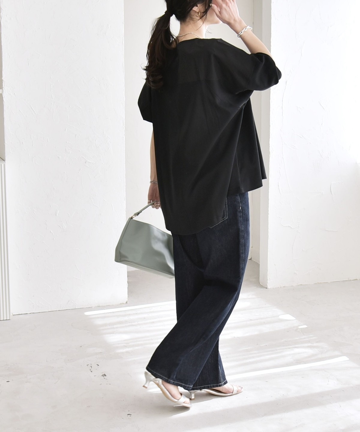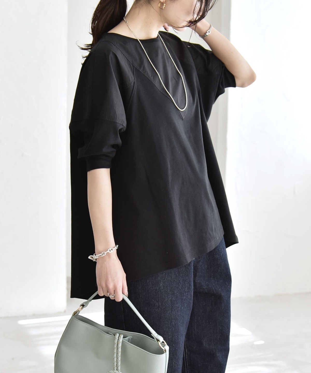 袖は捲らず6分袖でも、暑くなったらきゅっとたくし上げて半袖感覚でも着られます。