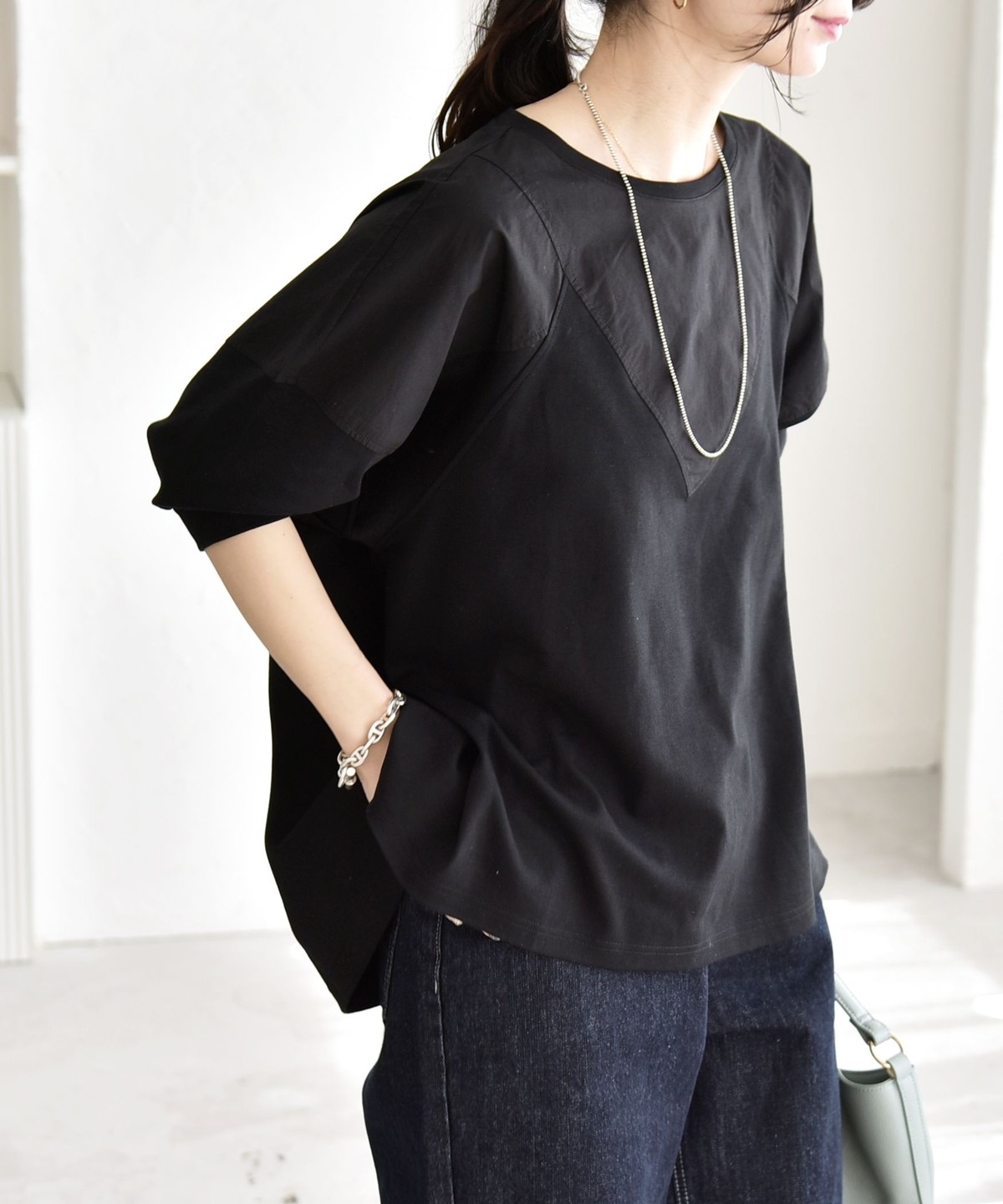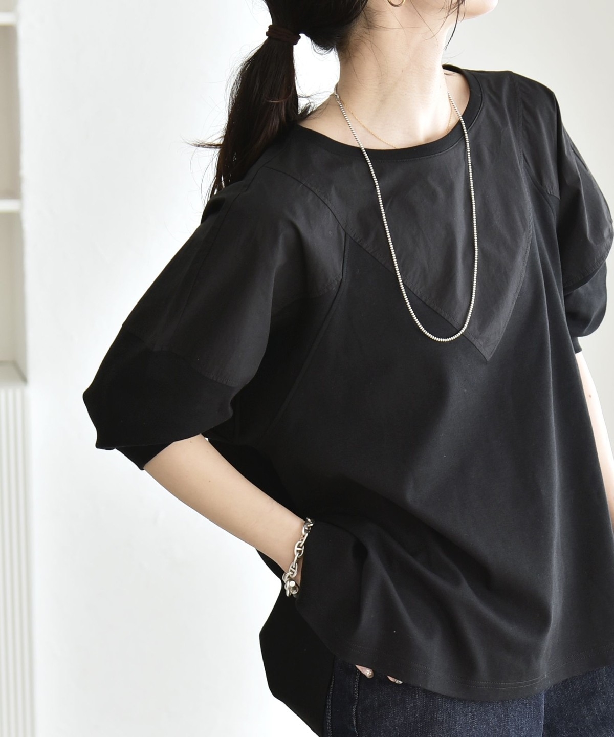 ヨーク部分のV切り替えと、カットソーと布帛のコンビデザインがポイントのプルオーバー。