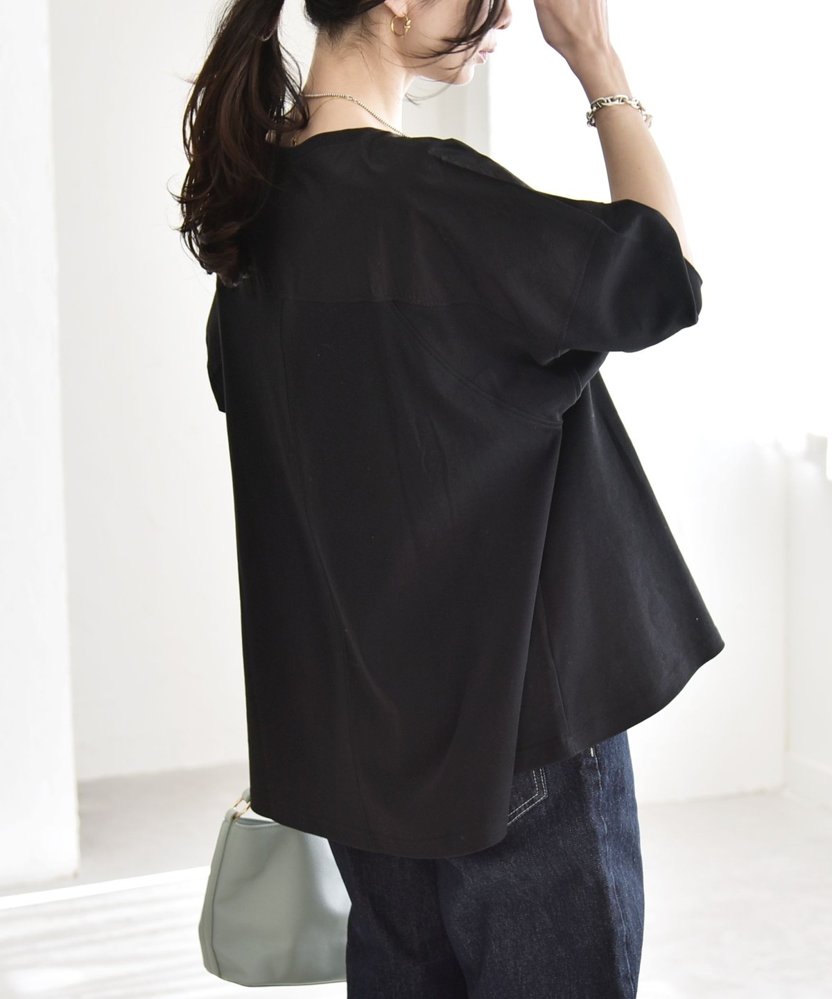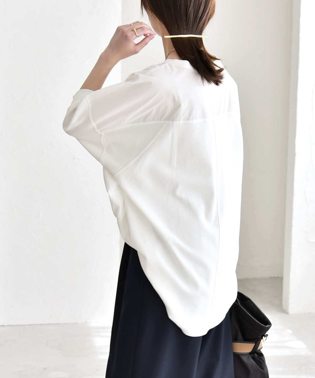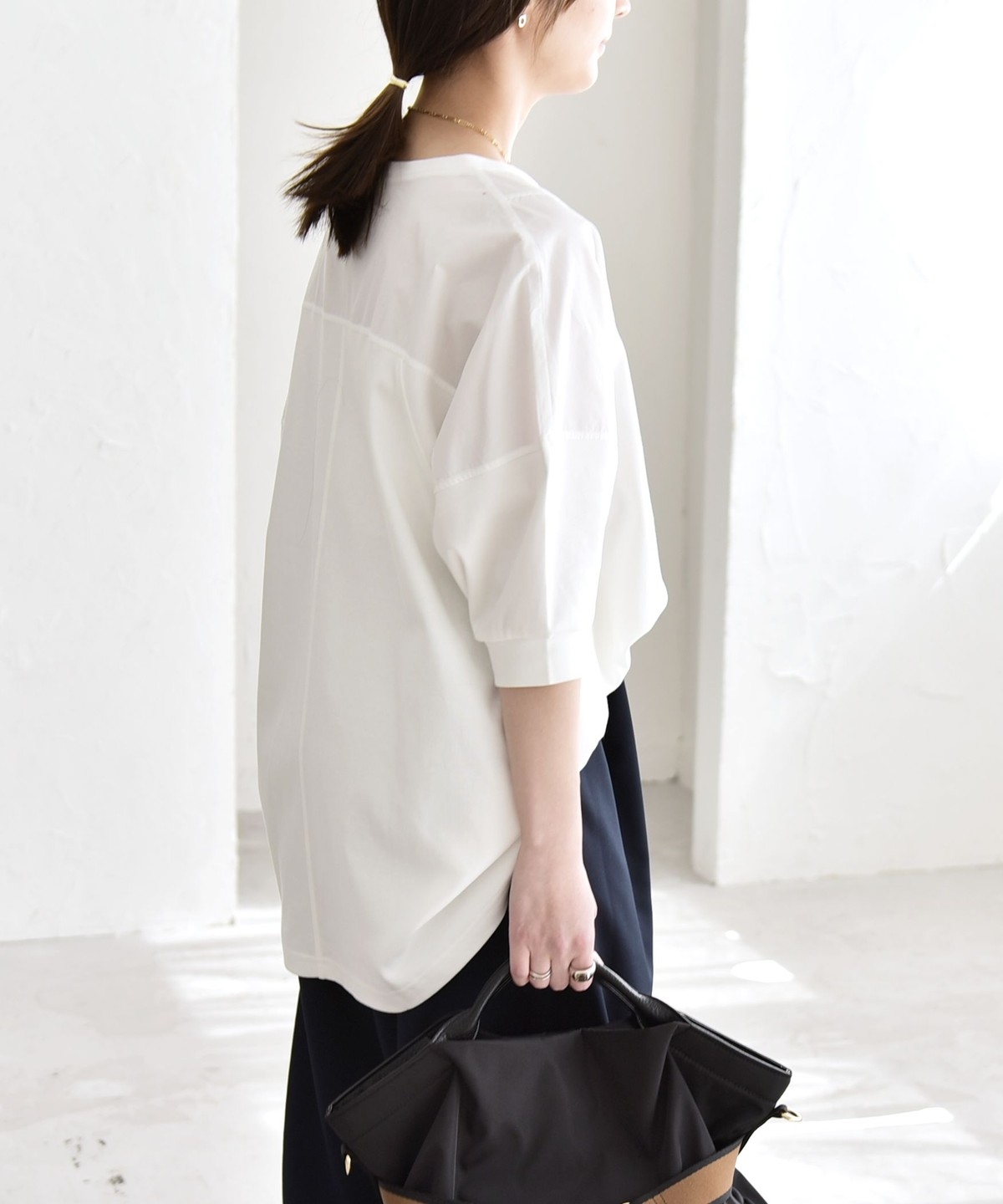 ゆったりとした身幅に、肩線を落とした丸みのあるフォルムで、身体のラインを拾わず楽な着心地に。