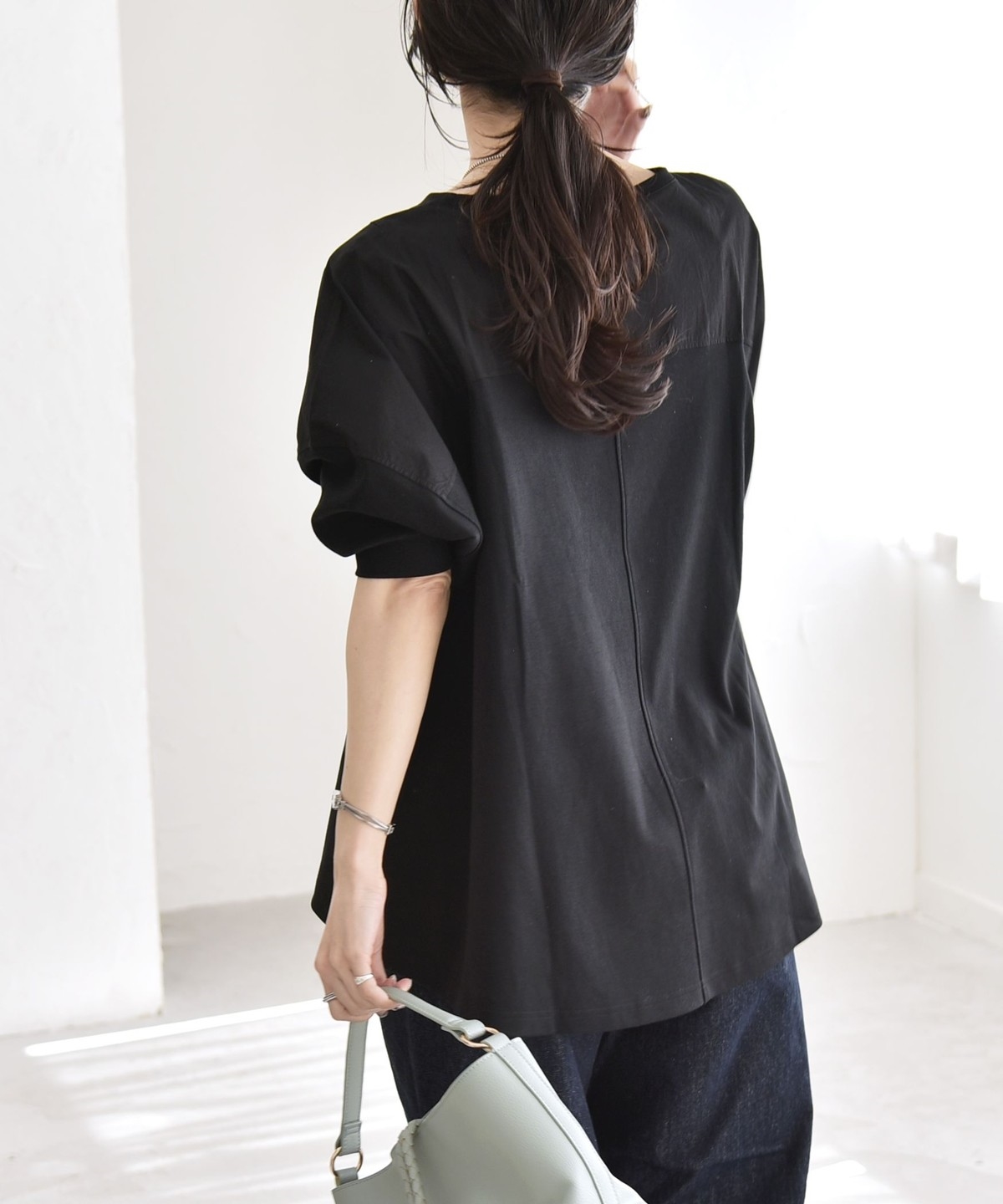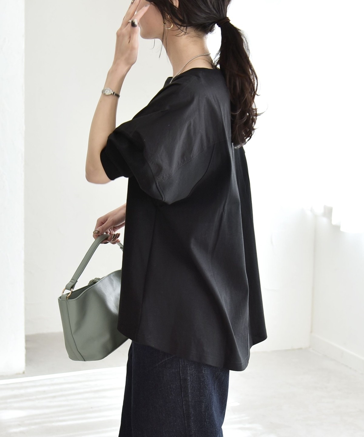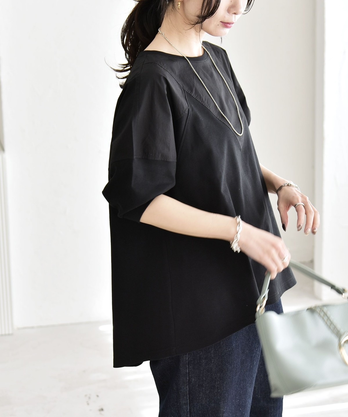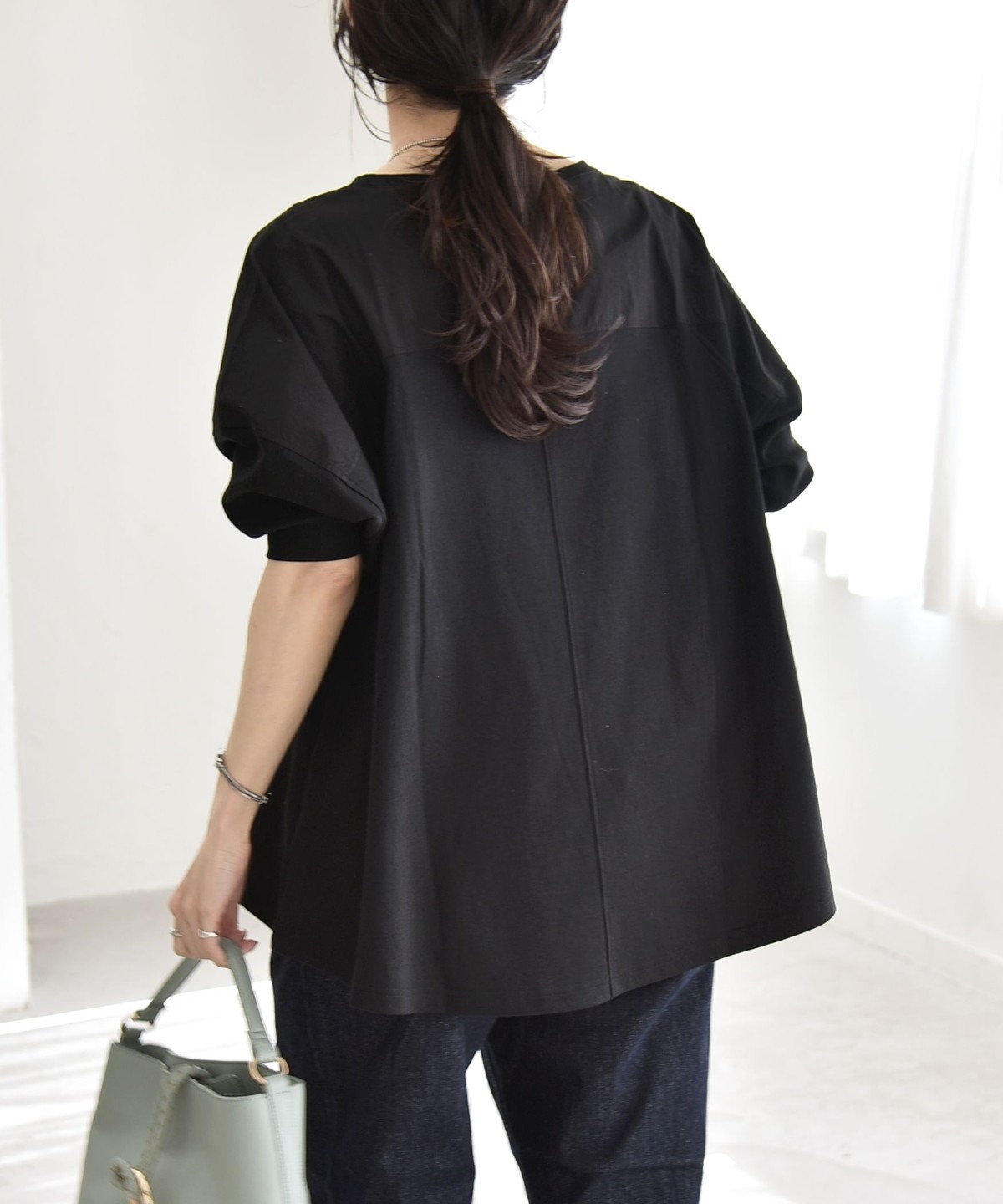 ゆったりとした身幅に、肩線を落とした丸みのあるフォルムで、身体のラインを拾わず楽な着心地に。