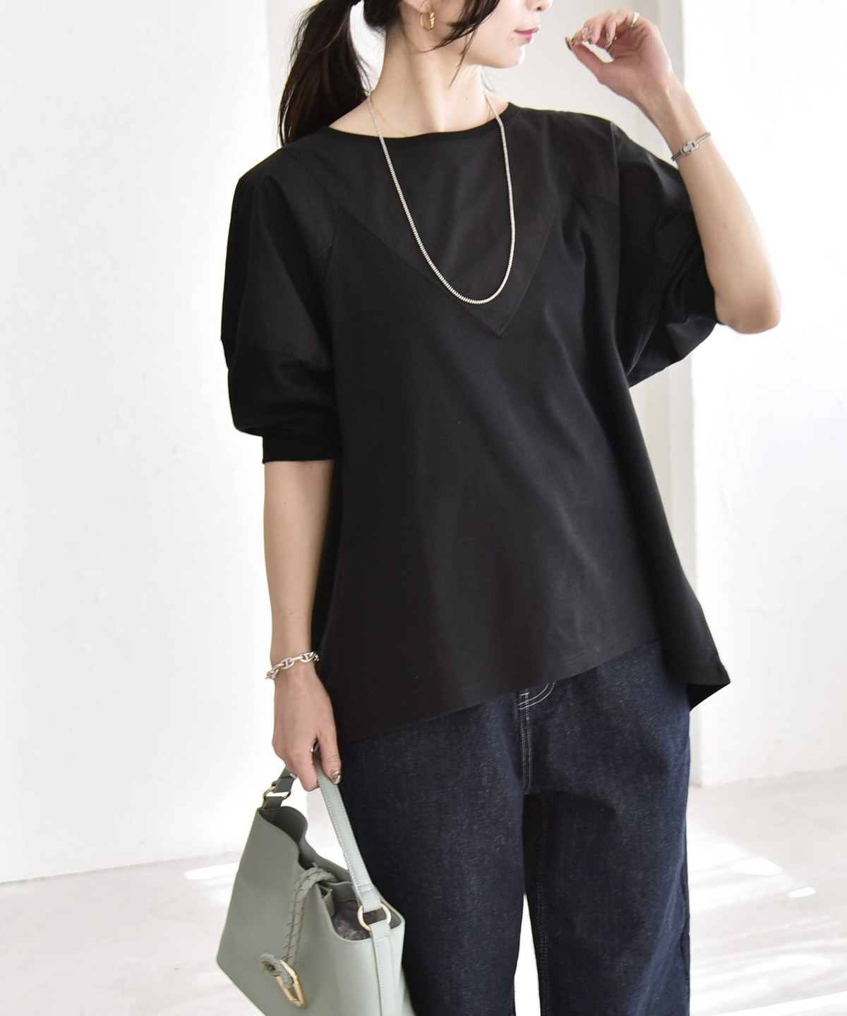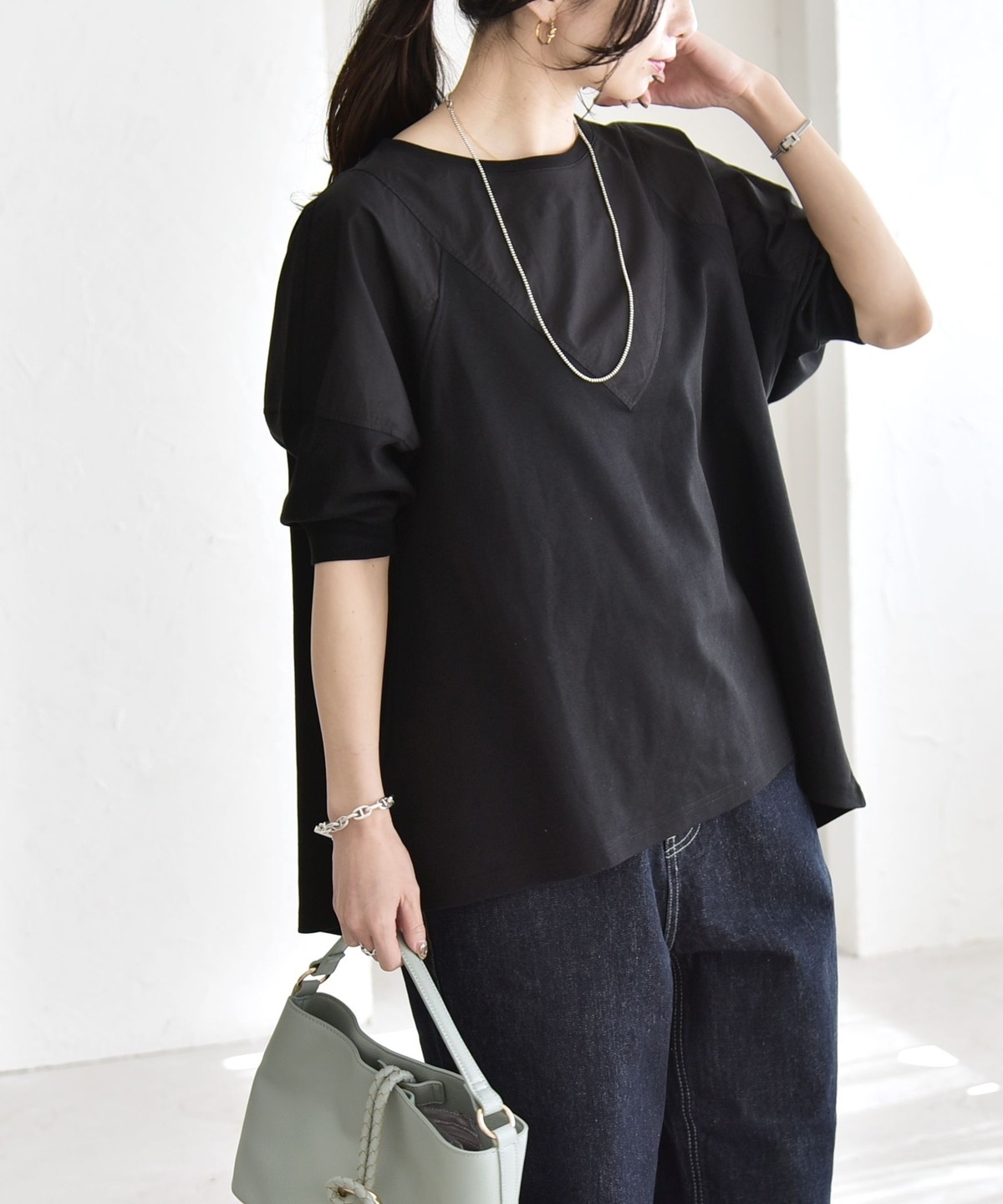 デザイン性の高いカットソーで、ブラウスのような感覚で綺麗めに着られるのが嬉しいポイント。