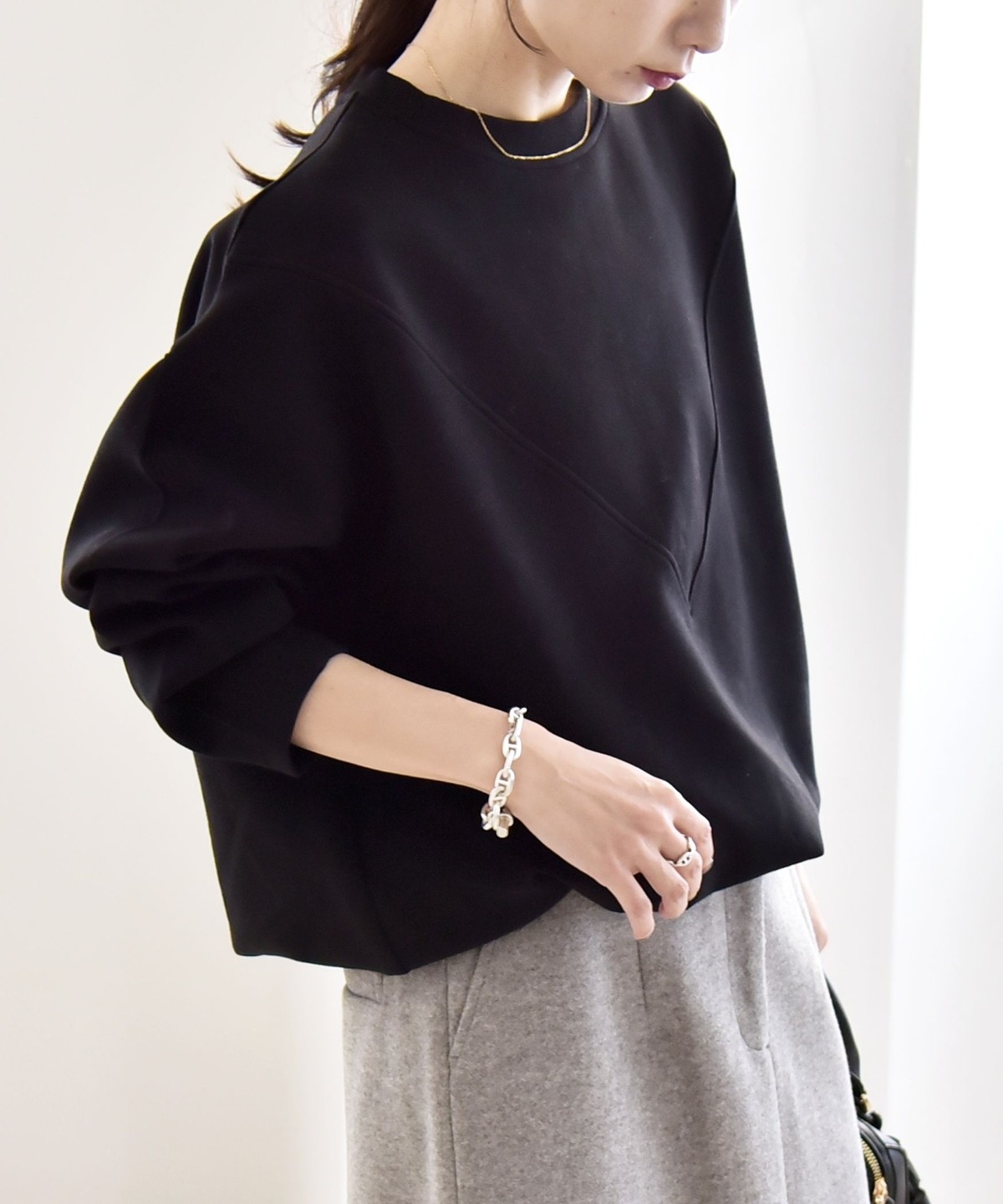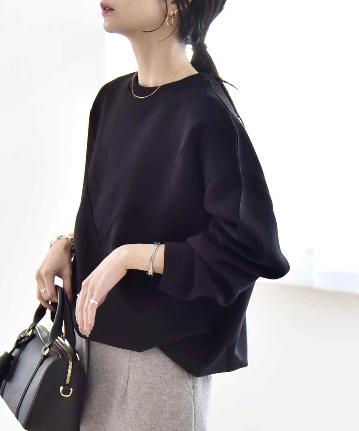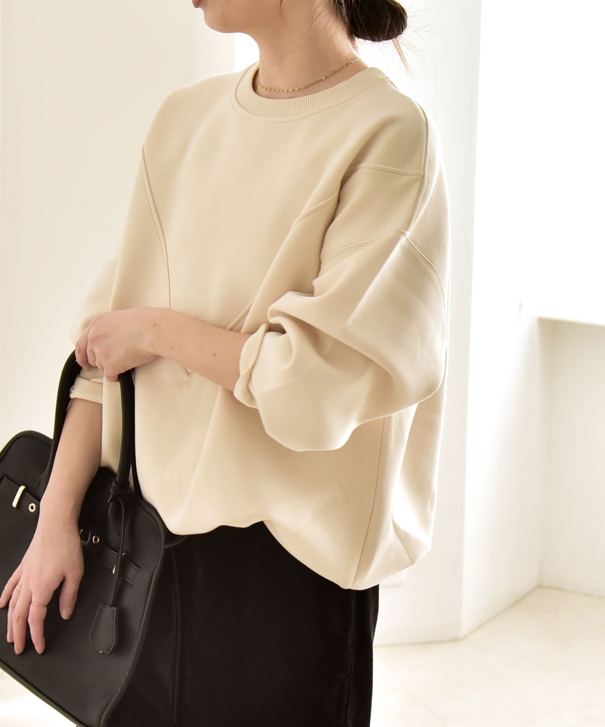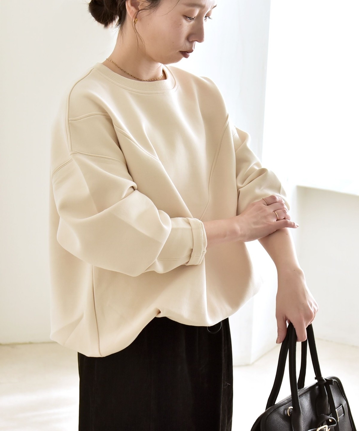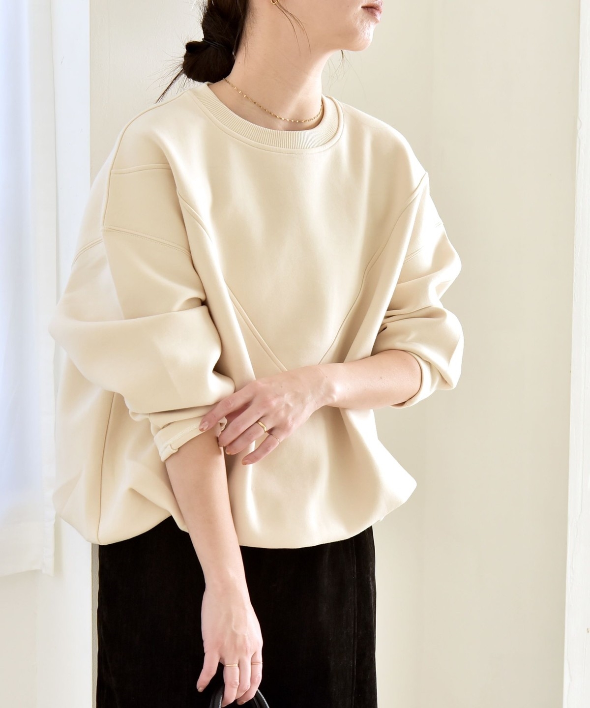 タックインしなくてもふんわりと可愛いコクーンシルエットになり、ボトムとも好バランス。