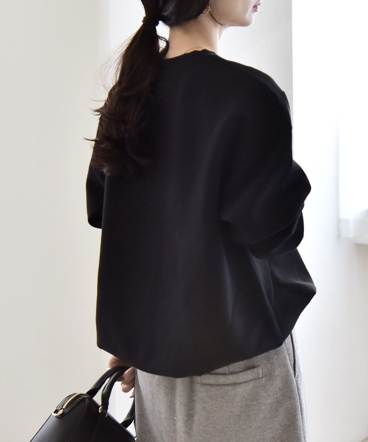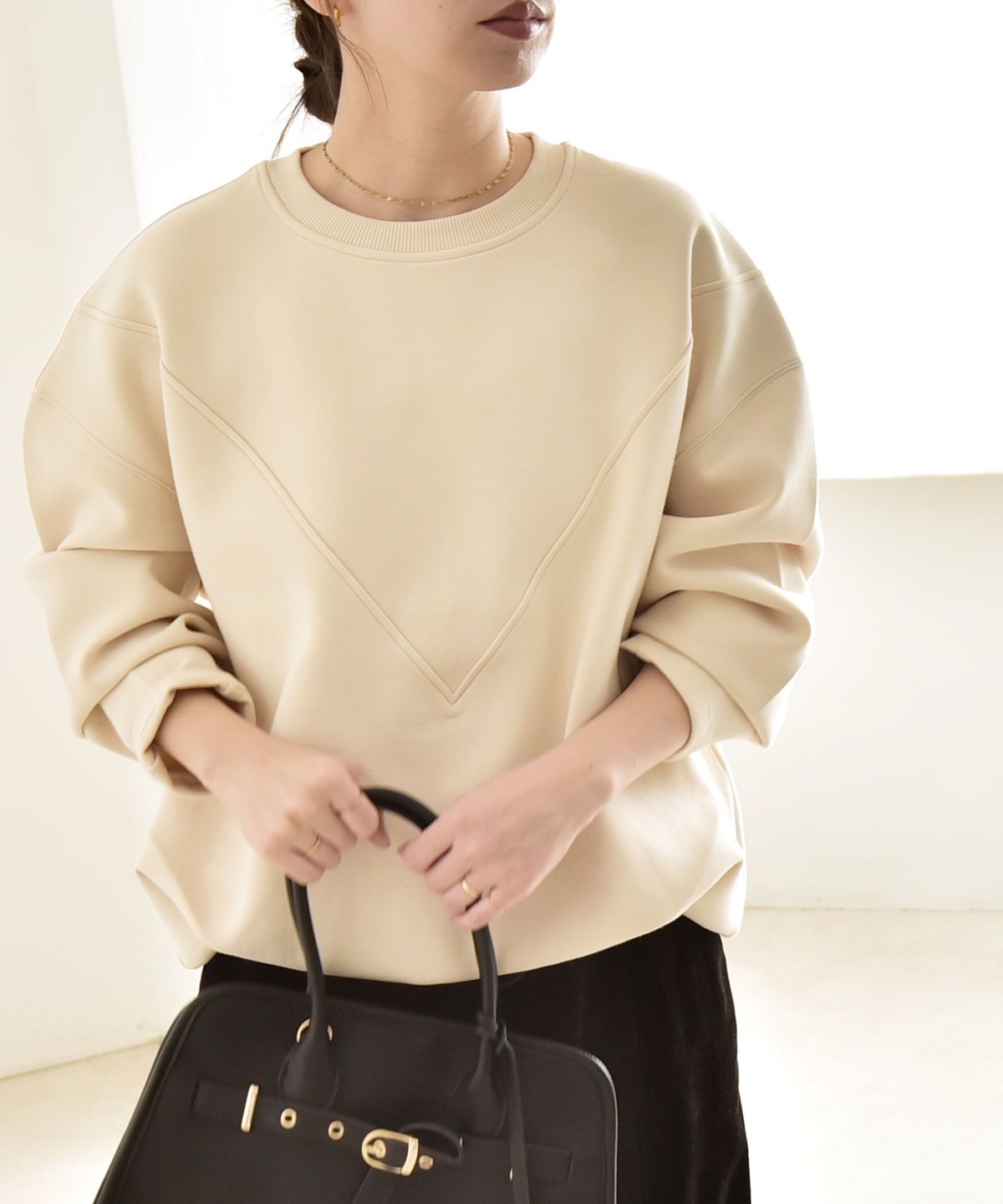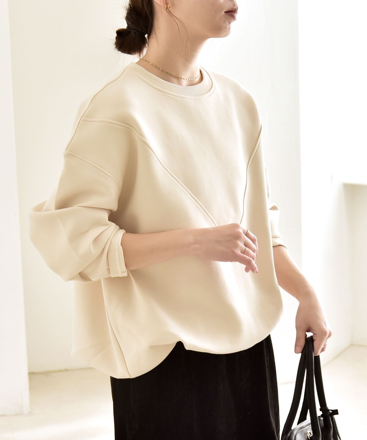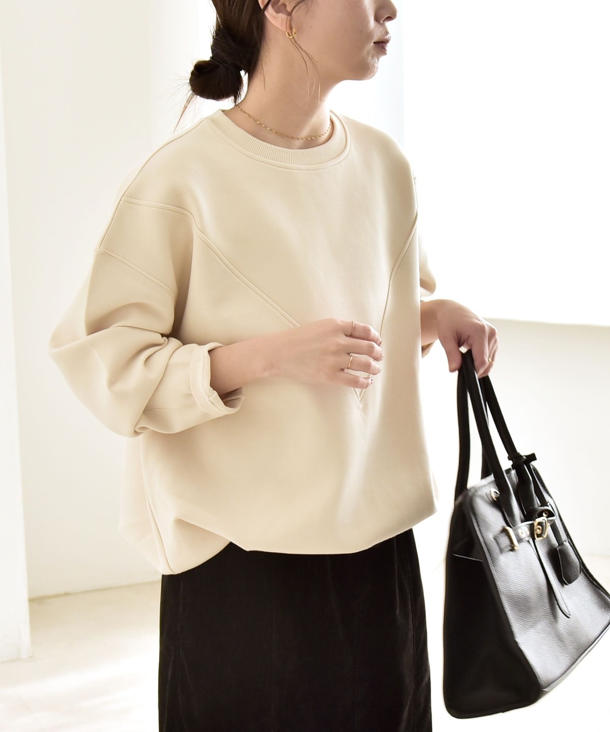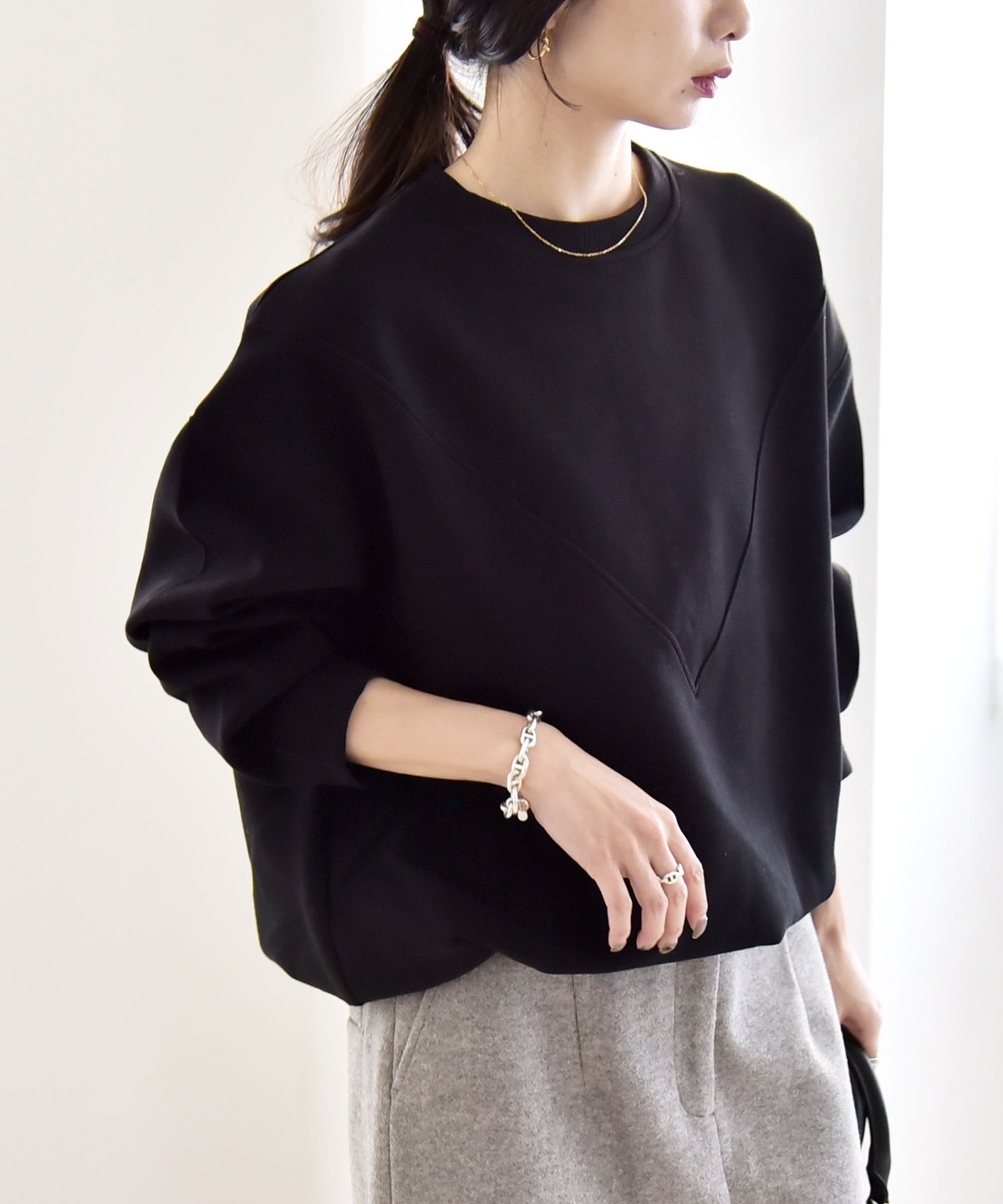 タックインしなくてもふんわりと可愛いコクーンシルエットになり、ボトムとも好バランス。