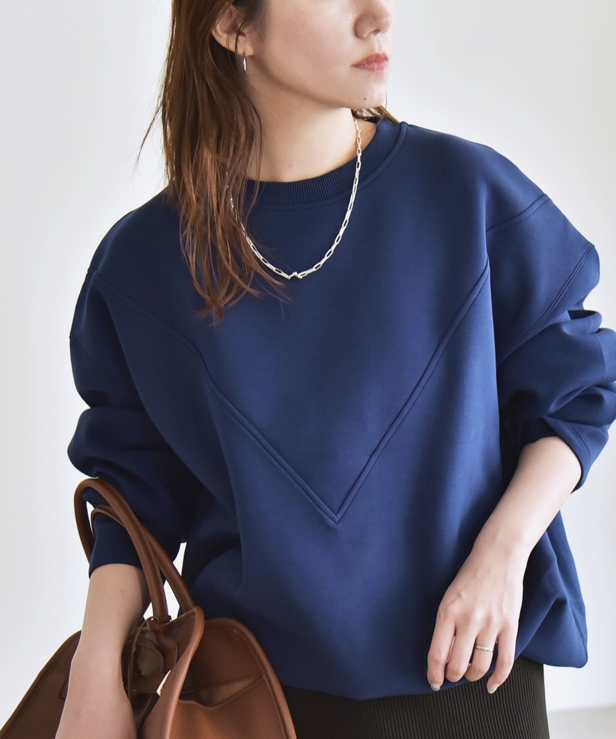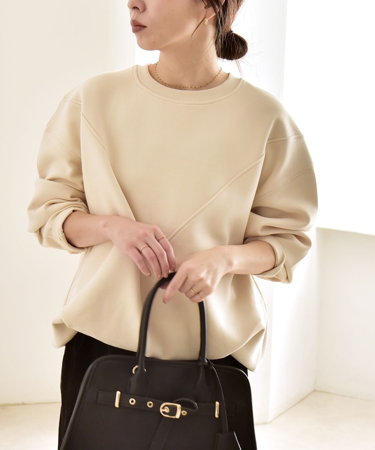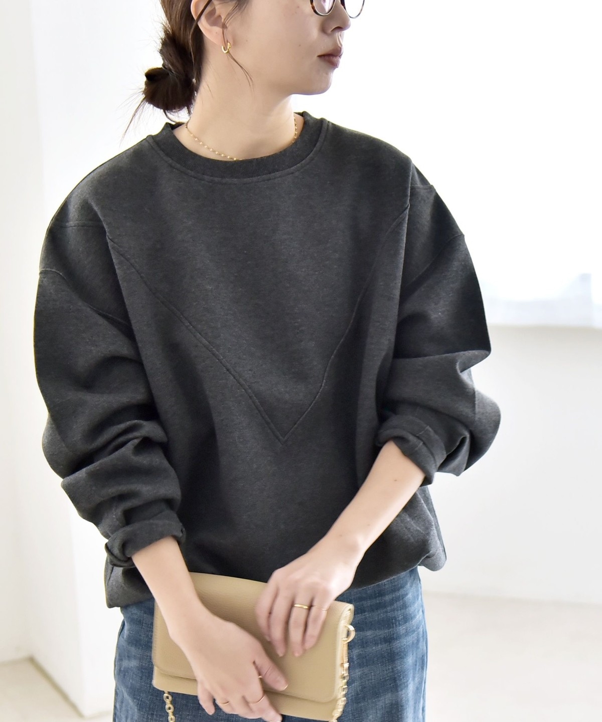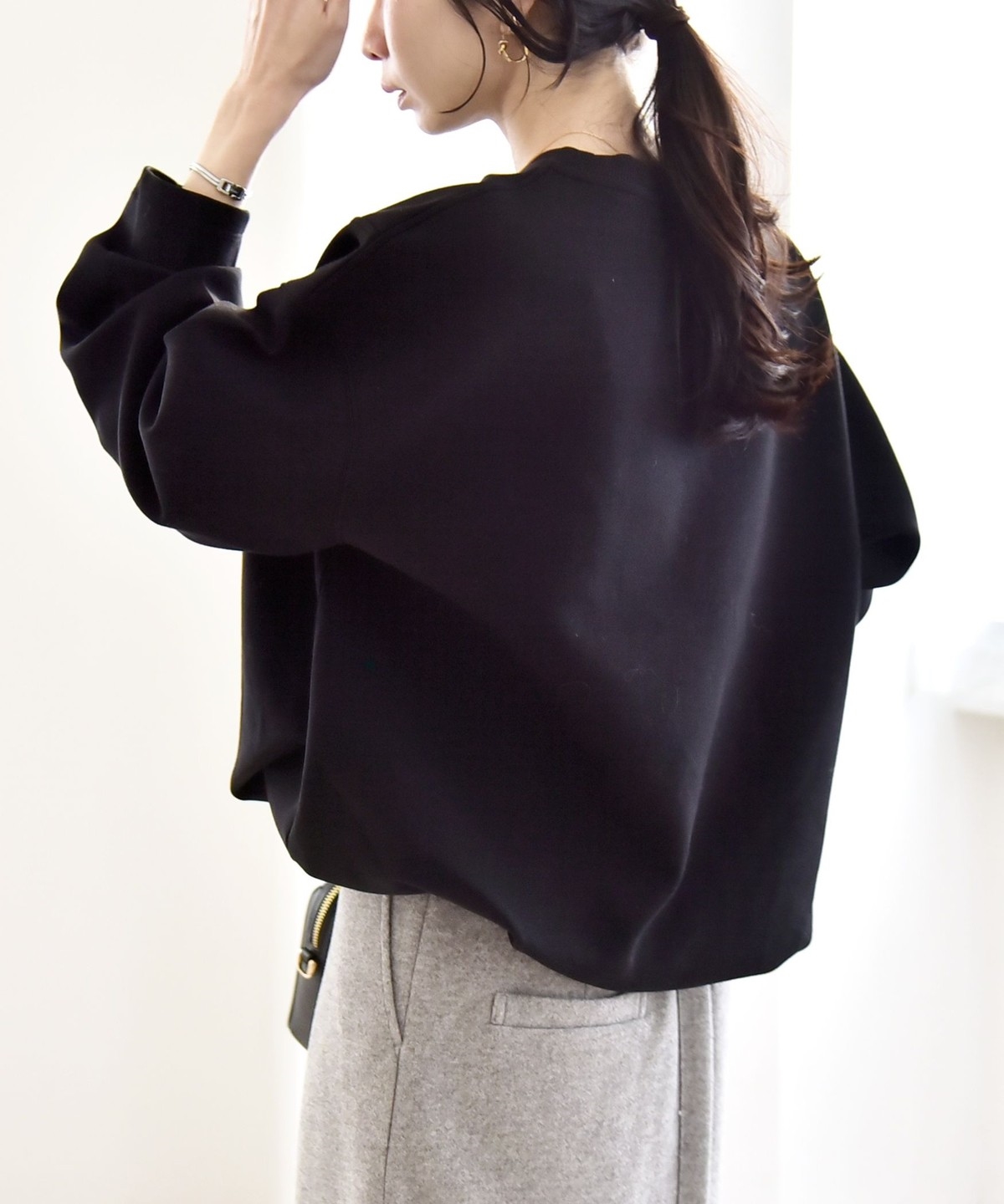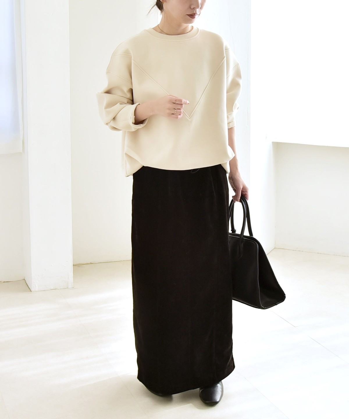 タックインしなくてもふんわりと可愛いコクーンシルエットになり、ボトムとも好バランス。