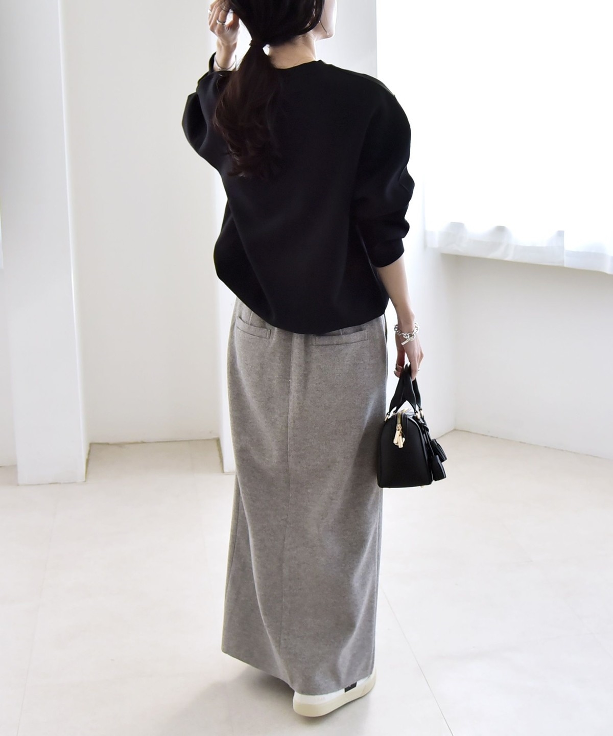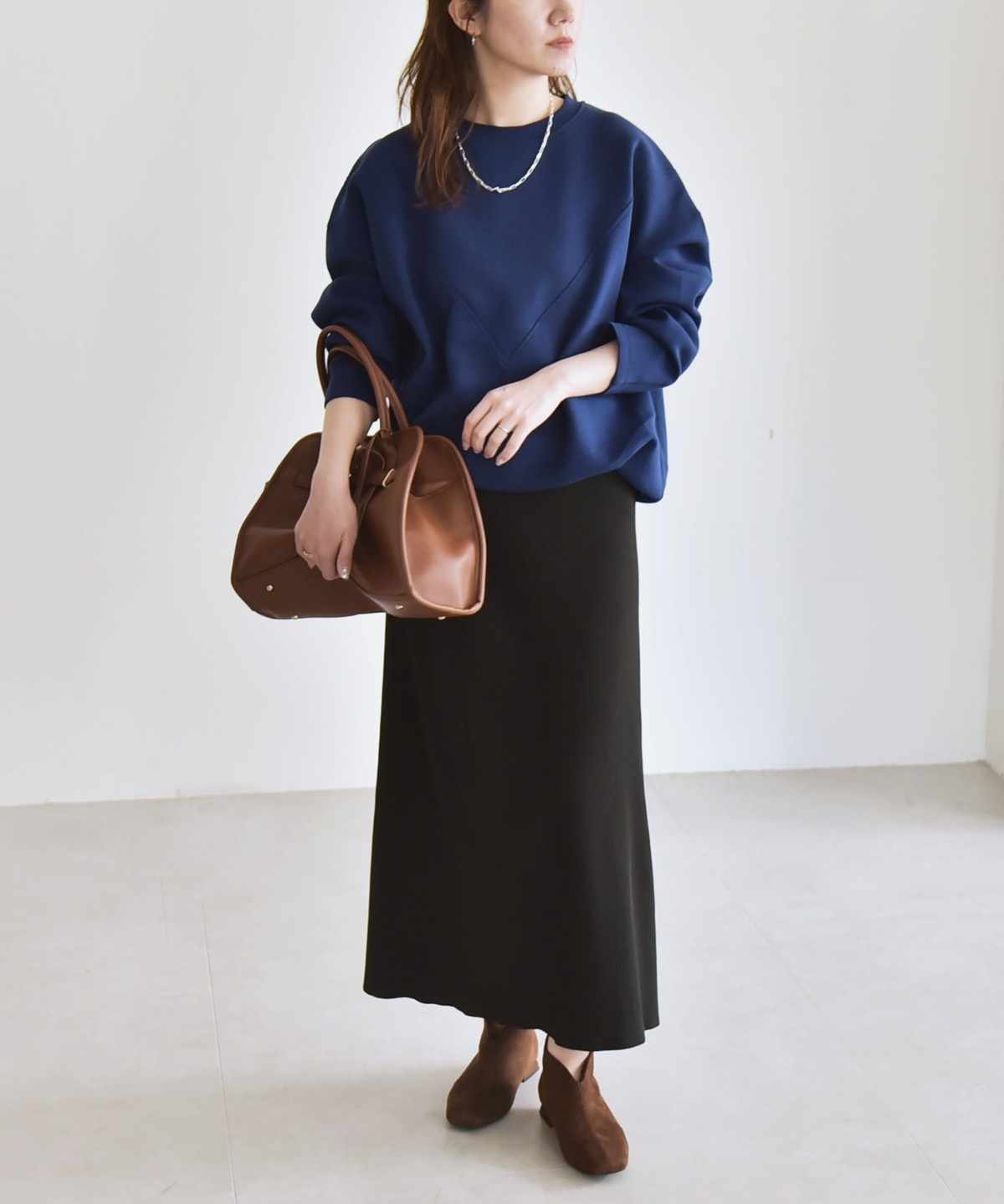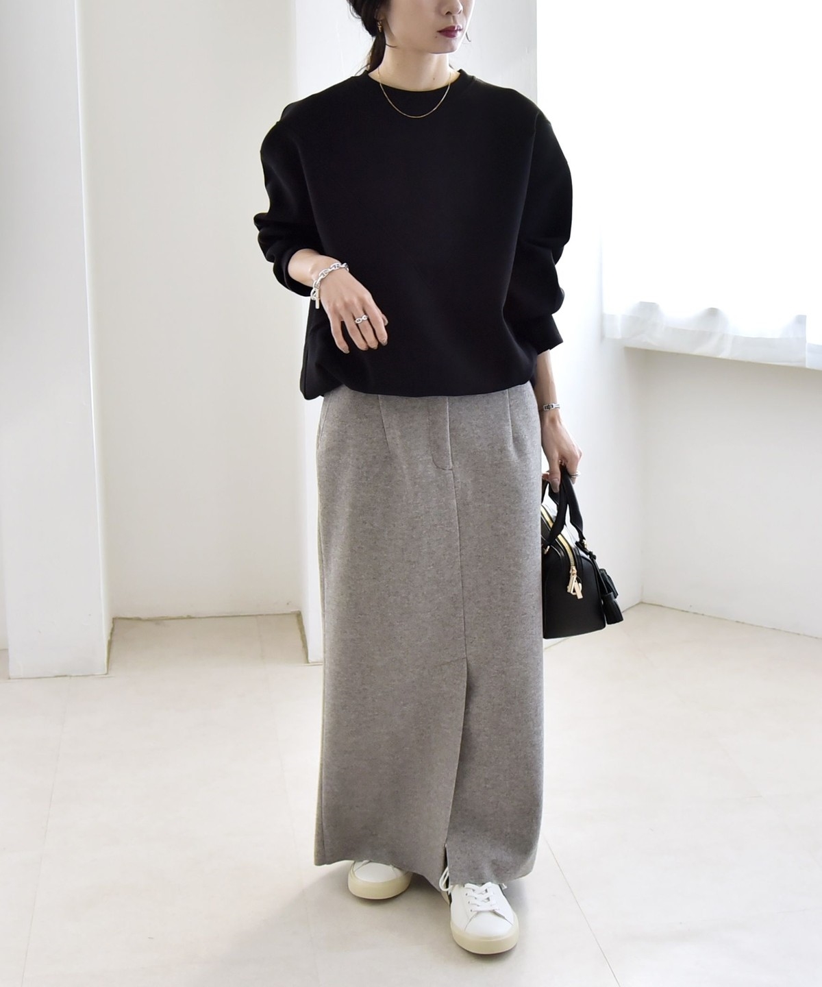 ロングスカートと合わせたフェミニンなスタイリングもおすすめです。