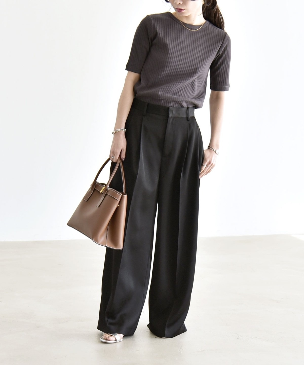 通勤やオフィスカジュアルの時は、バックボタンにしたクルーネックの着こなしがシンプルでおすすめ。