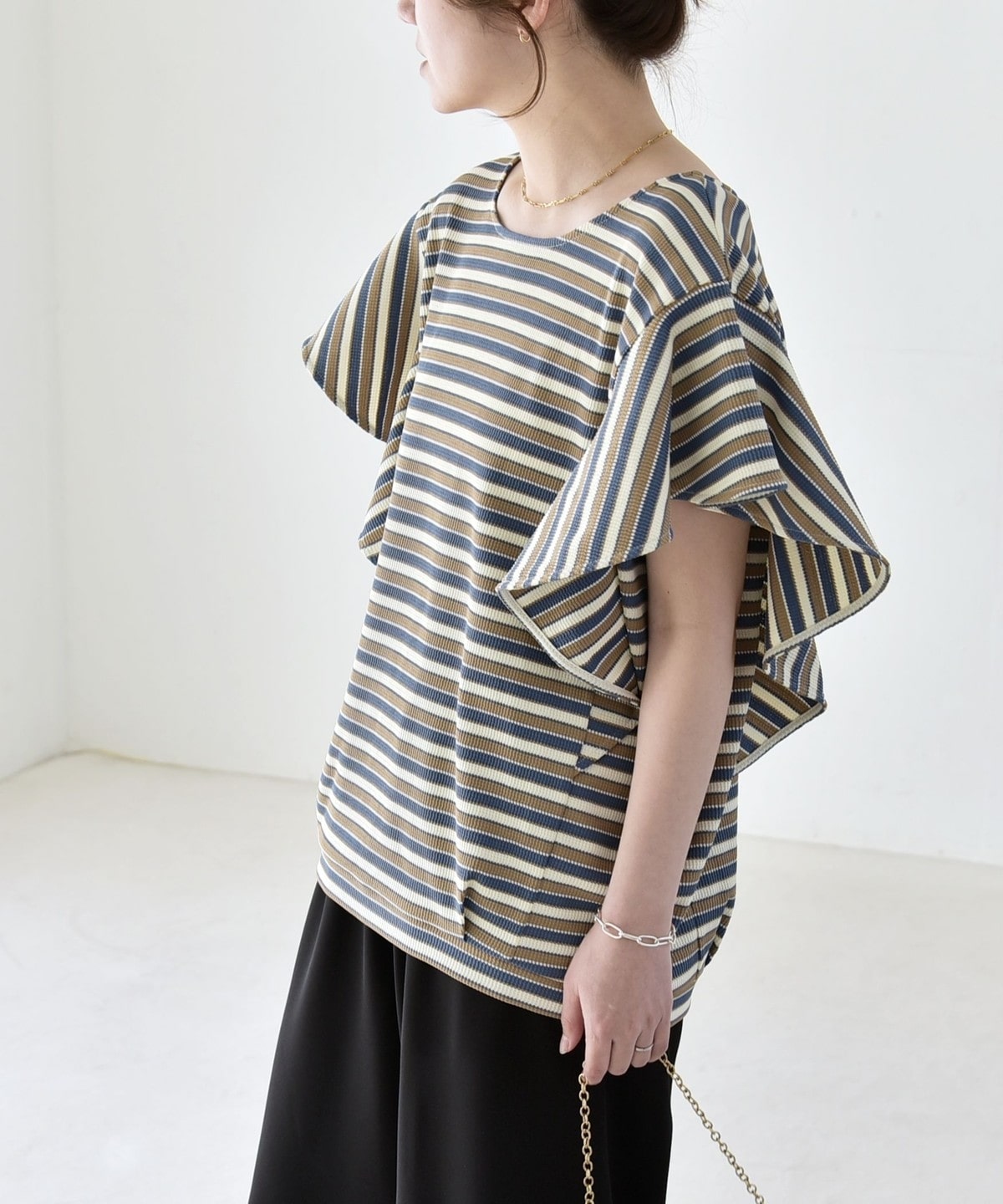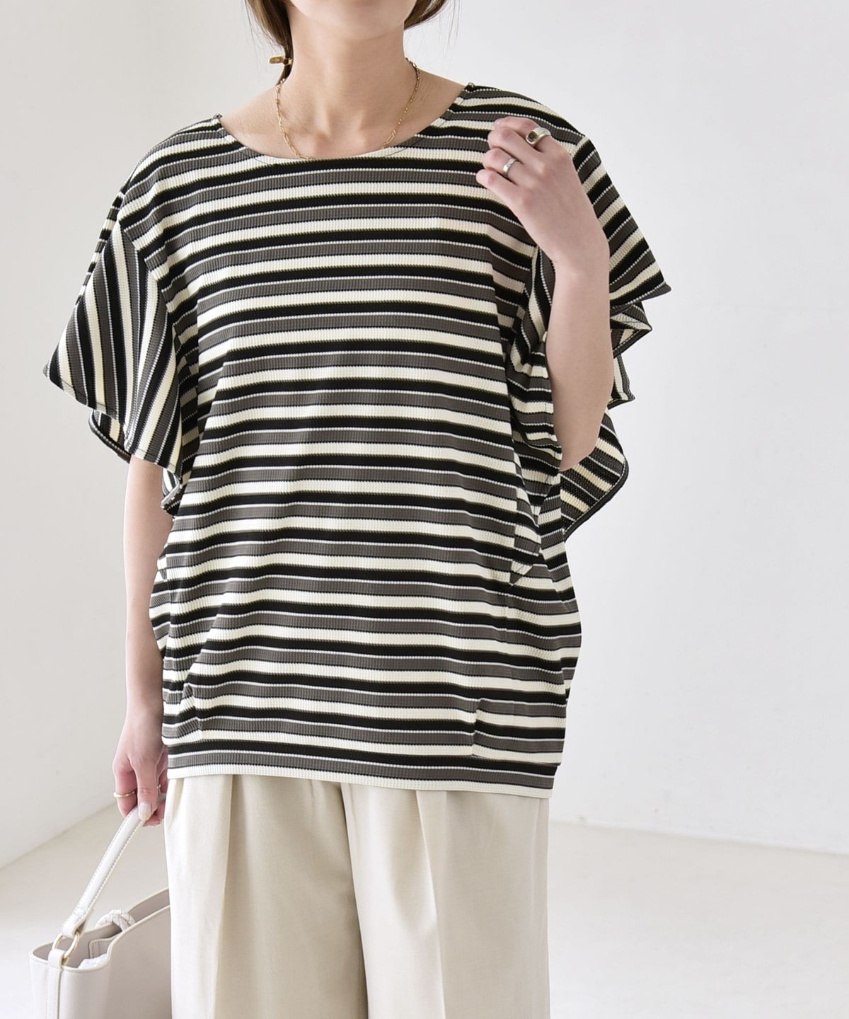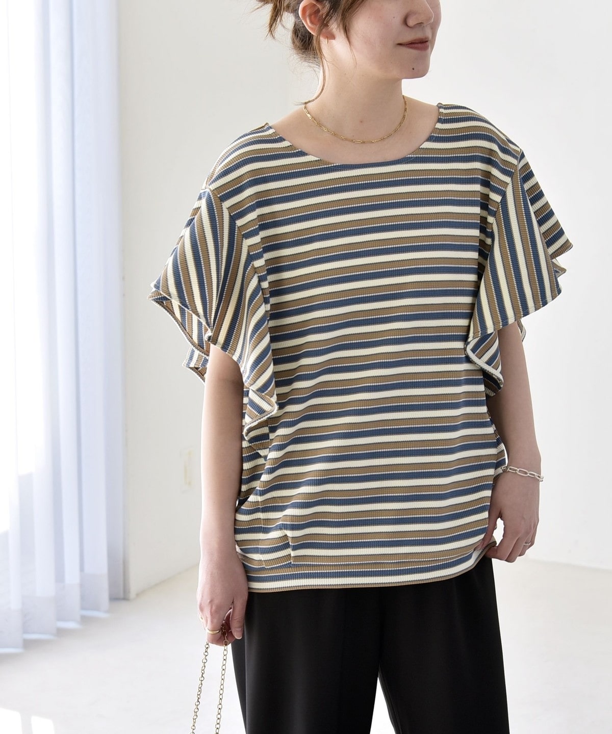 トレンドのマルチボーダーが目を惹く、大人フェミニンなカットソー