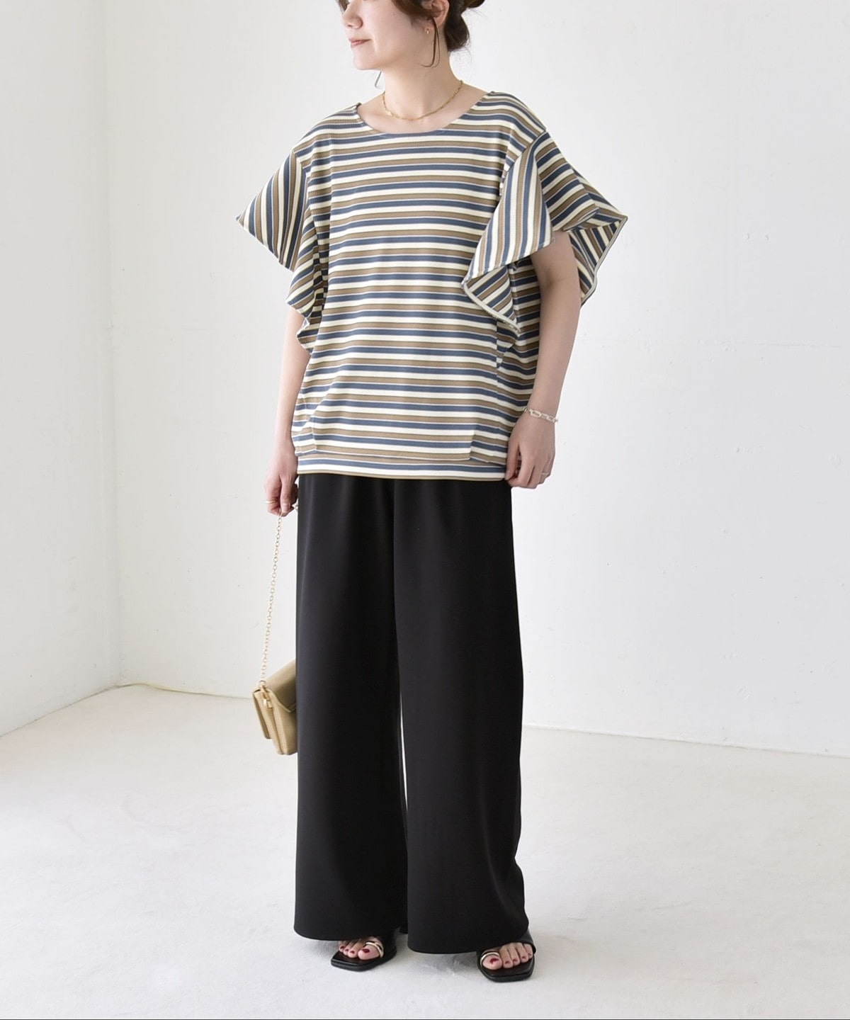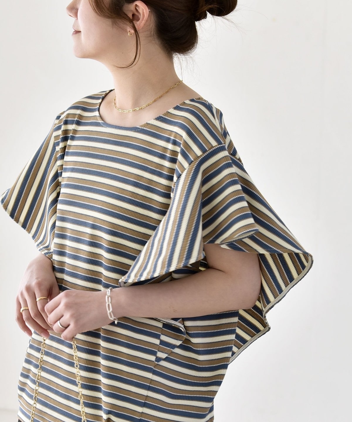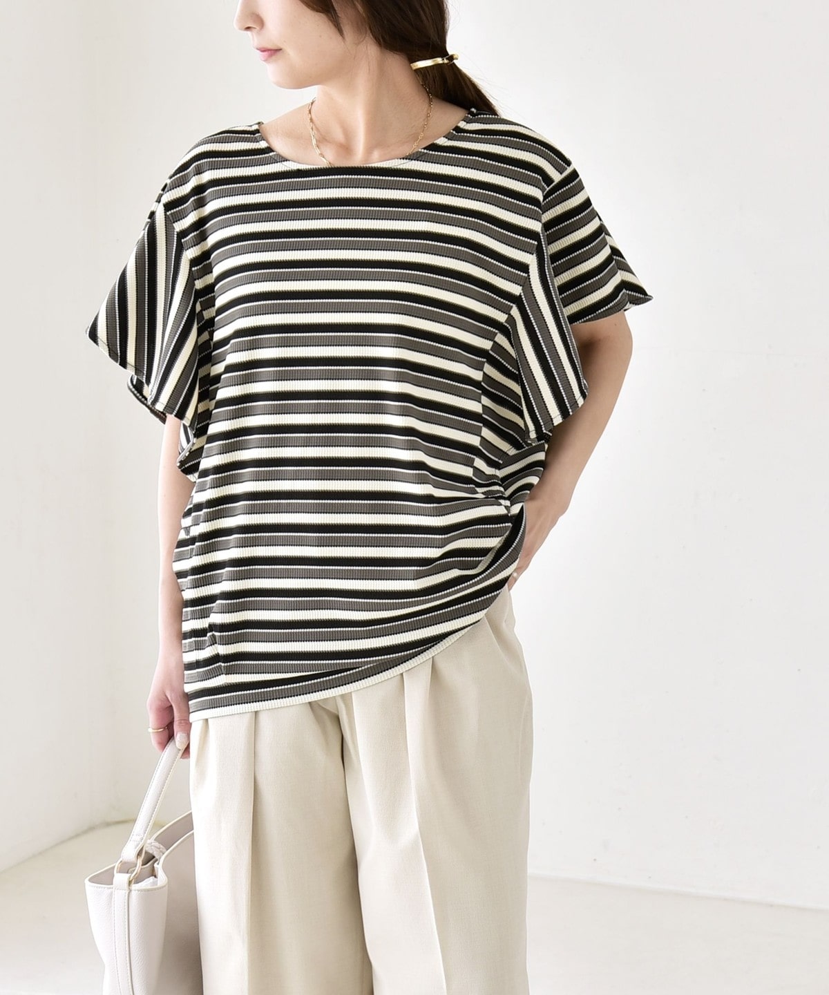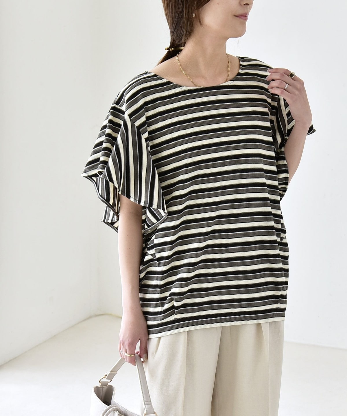 トレンドのマルチボーダーが目を惹く、大人フェミニンなカットソー
