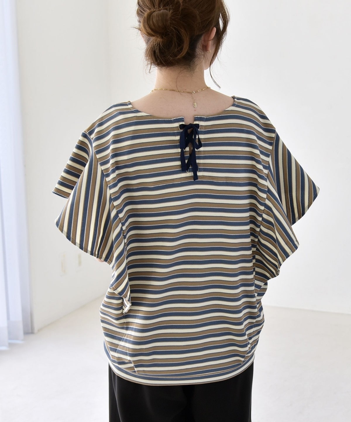 首元はやや横に広く開いているので、アクセサリーの重ね付けもおすすめです。